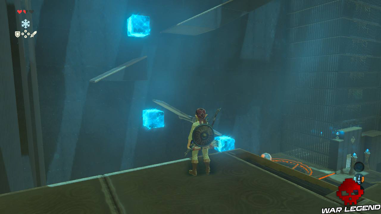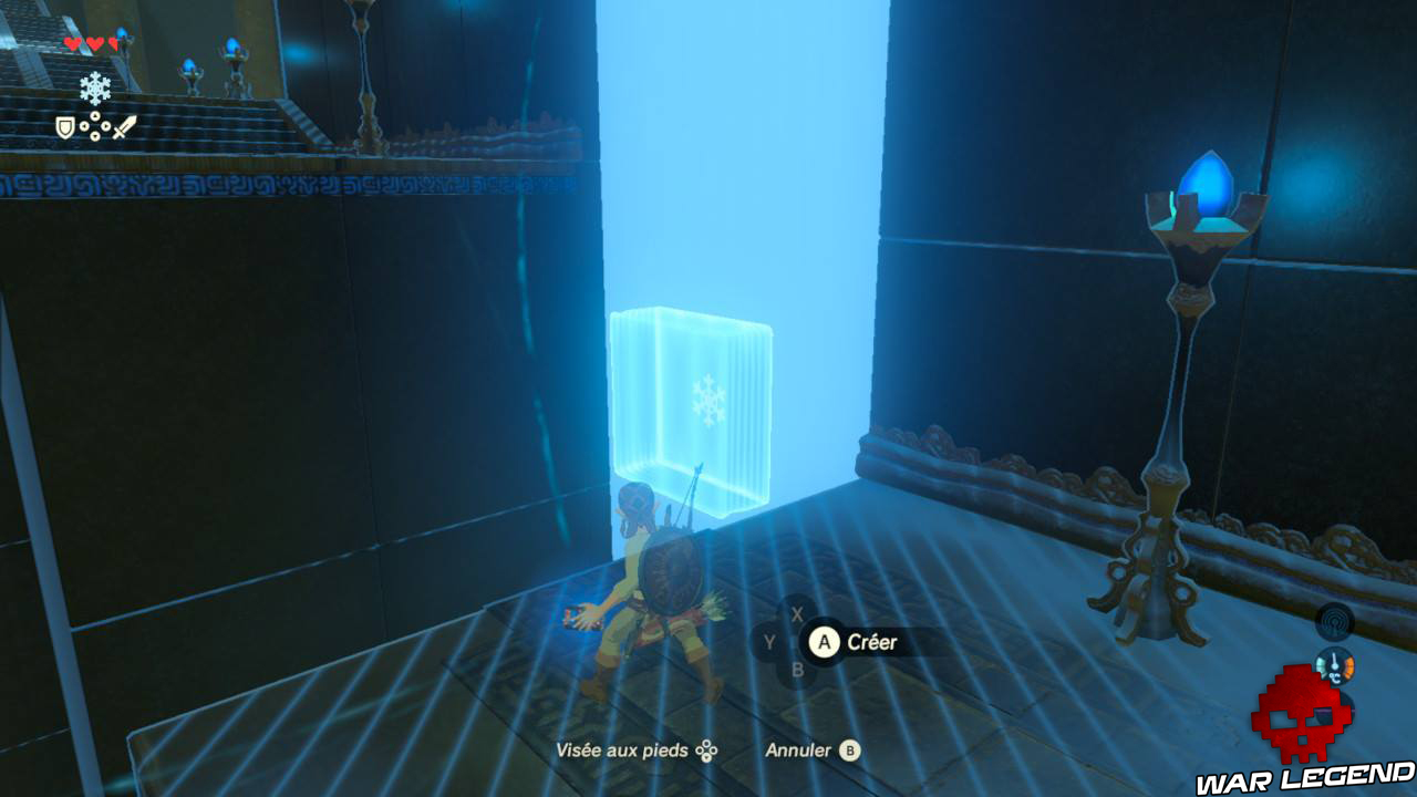 Sur la plateforme suivante, faites de même mais restez sur le bouton jusqu’à ce que la sphère soit pratiquement au bout de la première pente, puis écartez-vous du bouton pour qu’elle puisse atterrir sur la deuxième juste en-dessous et déclencher ainsi la plateforme de transport juste à côté. Mais avant de partir, montez à nouveau sur le bouton, attendez que la plateforme de transport revienne, et au dernier moment, figez le bouton dans le temps. Traversez, sprintez vers la gauche en haut de la pente et gagnez l’accès au coffre qui vous offre un Bandana d’escalade.