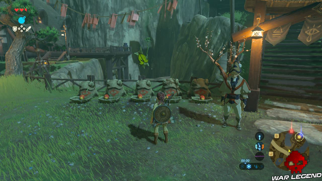 La maison de la chef Impa est tout au bout, au pied des chutes d’eau, allez-y. Avant d’entrer, regardez les grenouilles sur la gauche. Au lieu de prendre les pommes, déposez-en une dans le bol qui est vide pour faire apparaître un Korogu. Entrez maintenant dans la maison d’Impa pour qu’elle vous raconte l’histoire d’Hyrule.