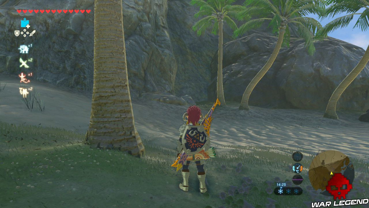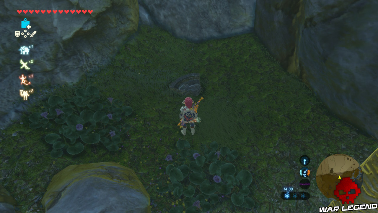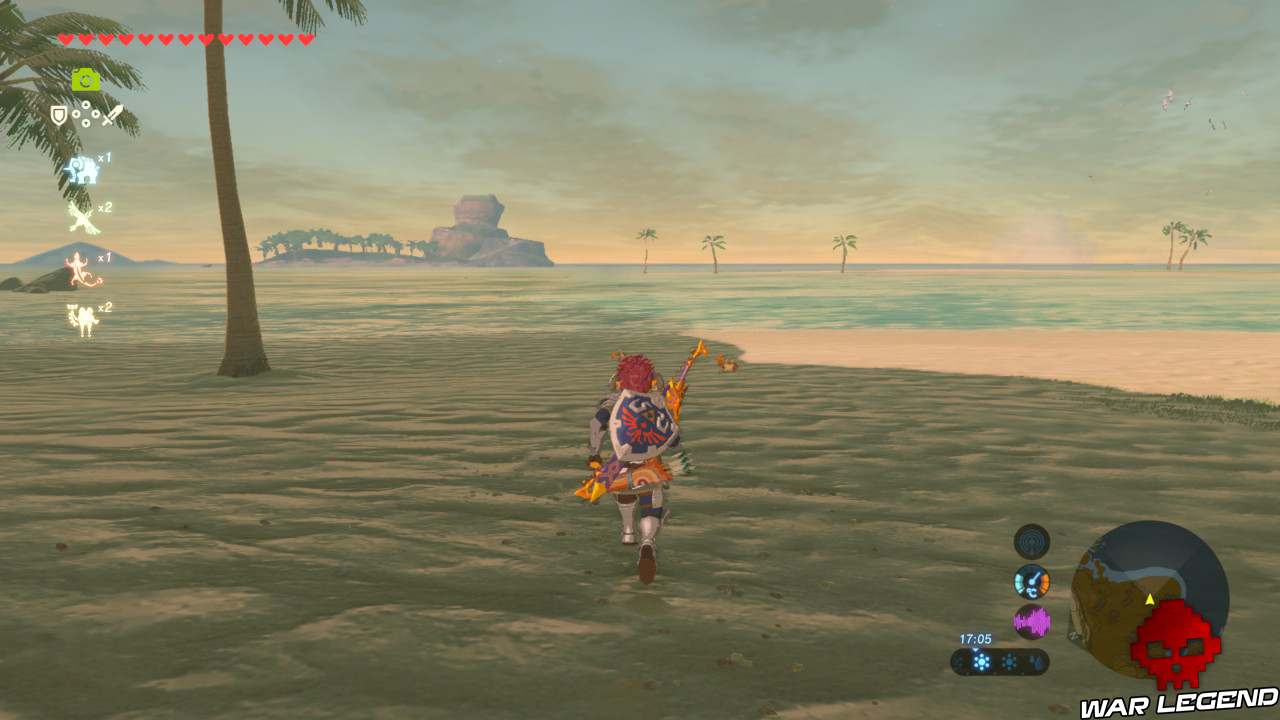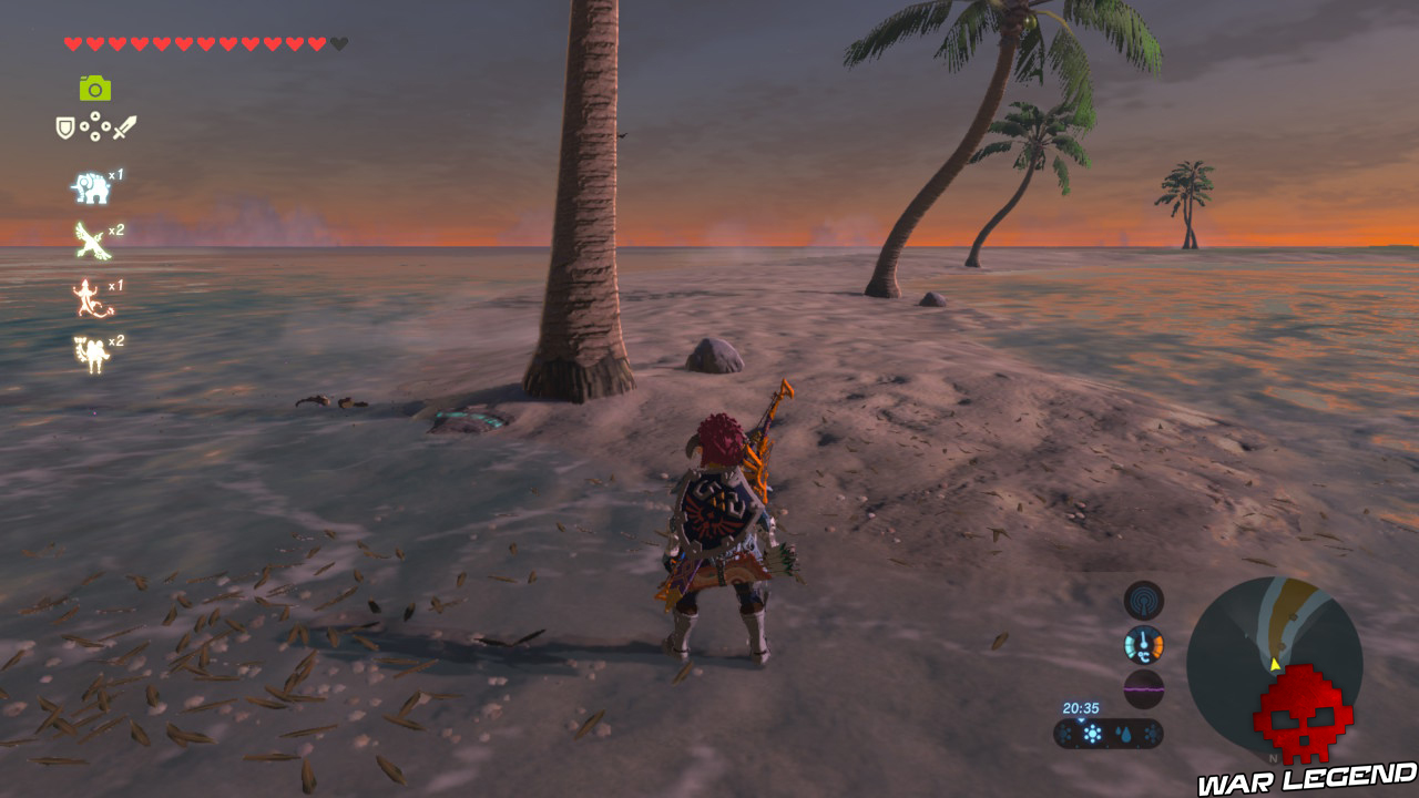 Dès que vous posez le pied sur l’île de ce sanctuaire, vous êtes privé de votre équipement. Vous devez faire avec les moyens du bord pour placer trois sphères dans trois réceptacles aux trois pointes de l’île. Deux sphères se trouvent sur le côté sud du bois au centre de l’île, l’une dans un coffre au sommet d’une structure bokoblin, l’autre juste à côté au cou d’un Hinox. Le mieux consiste à tirer une flèche dans la corde à son cou pour faire tomber la sphère et se carapater avec.