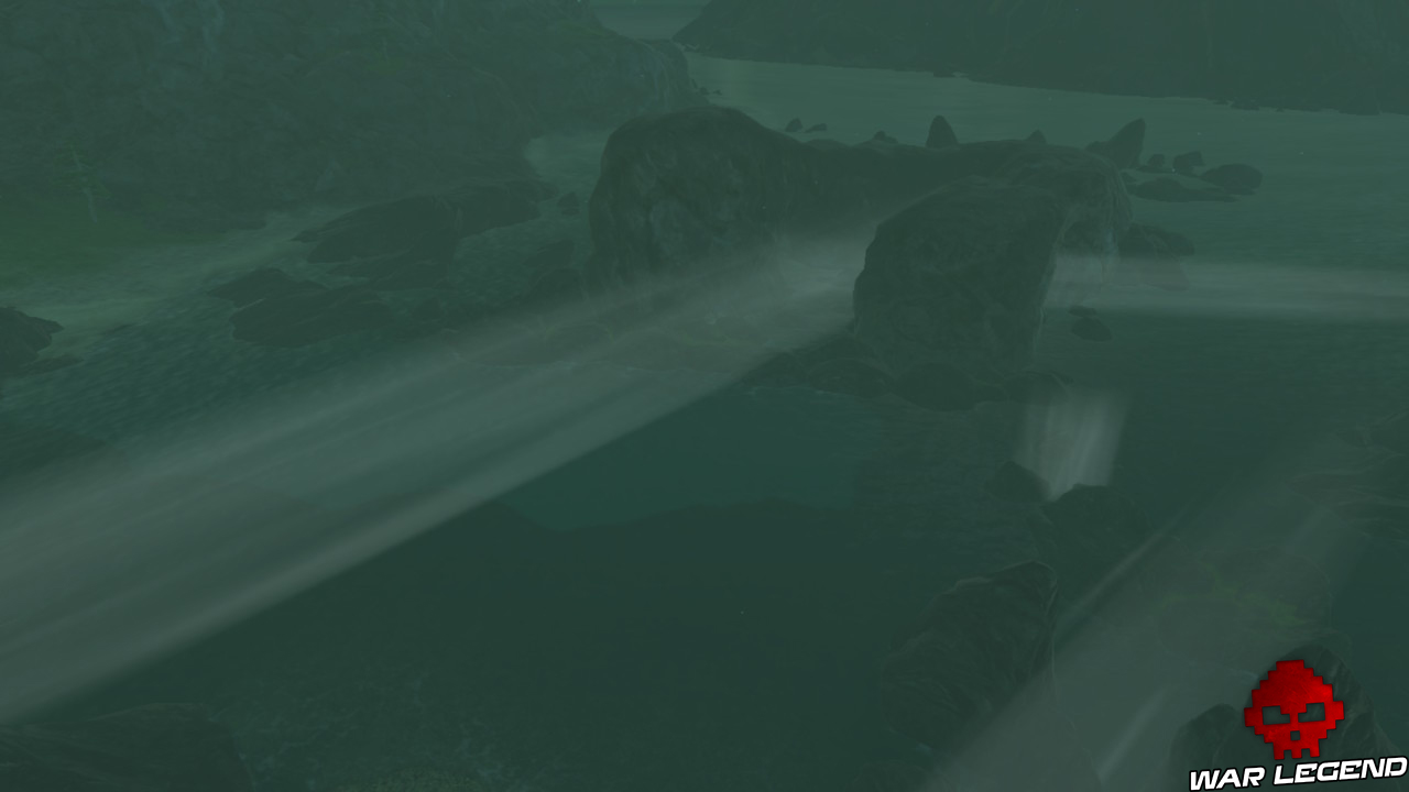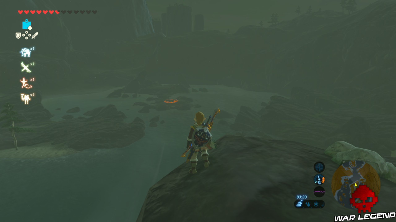 Prenez maintenant au sud et allez à la Cascade de Sera (le mieux est de revenir au Domaine Zora et d’emprunter le fameux pont ouest), que vous remontez grâce à l’armure zora. En retombant, déclenchez la paravoile pour viser le socle dans l’eau et déclenchez une attaque tombée avec la lance.