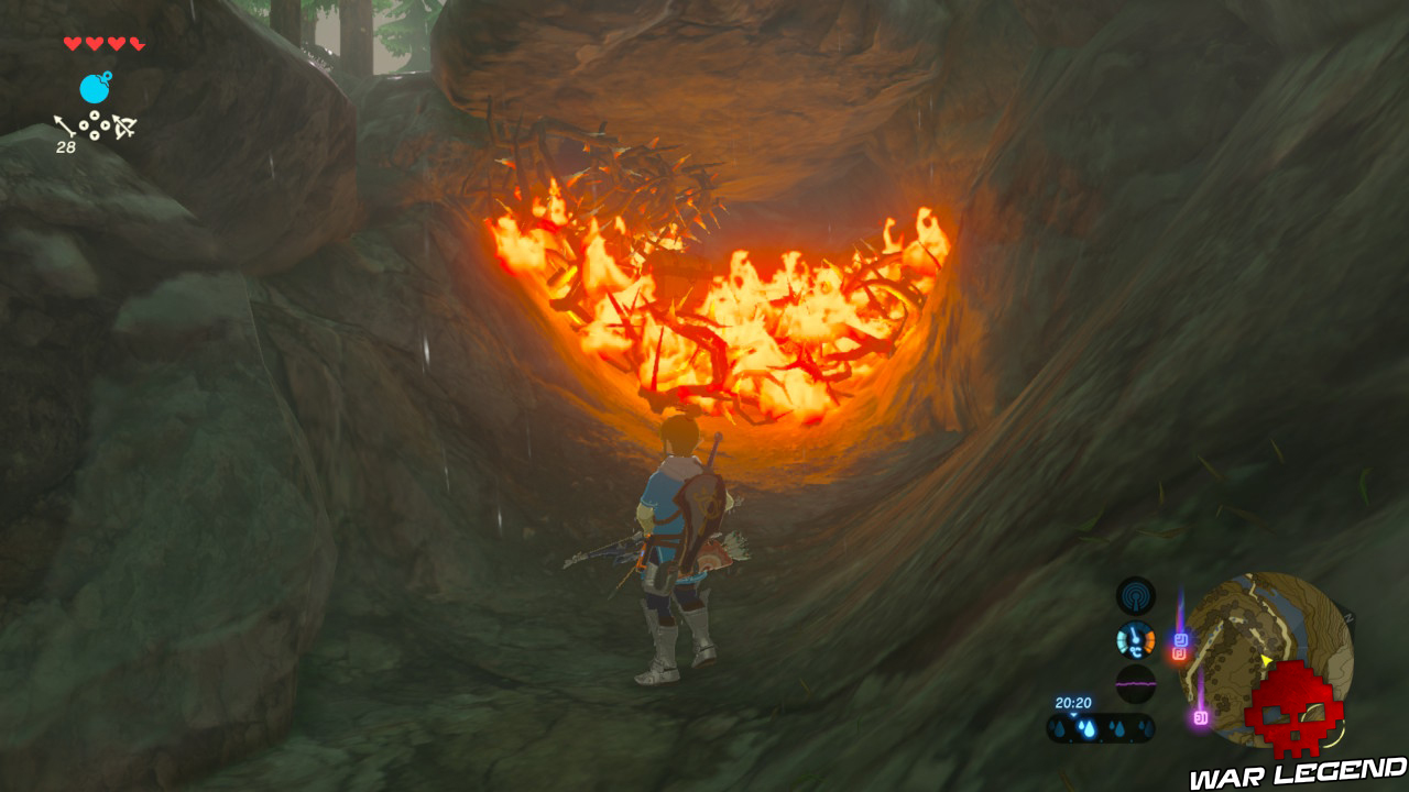 Au bout du chemin, il y aura des ronces. Tirez une flèche enflammée et allez ouvrir le coffre pour récupérer un Rubis violet. Buvez le Remède électro que Sidon vous a donné et avancez. La zone est truffée de lézards adeptes des attaques électriques, le mieux étant de rester discret un maximum.