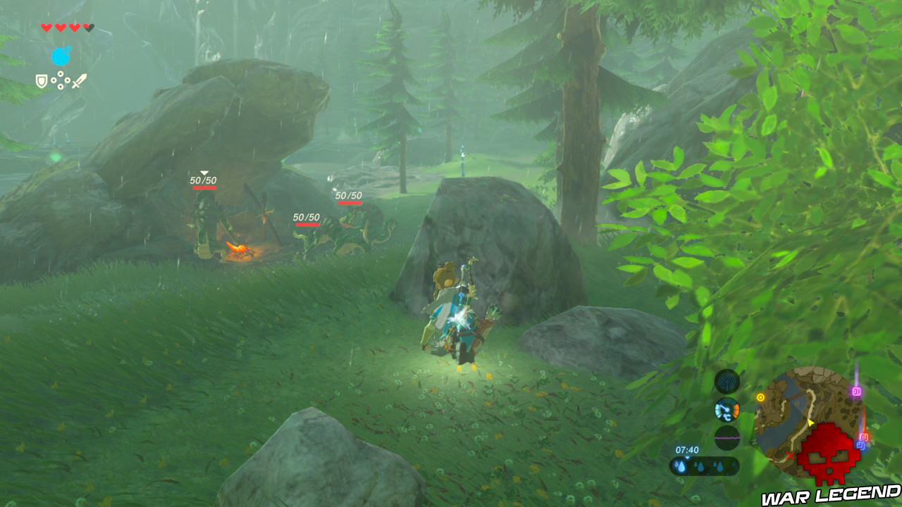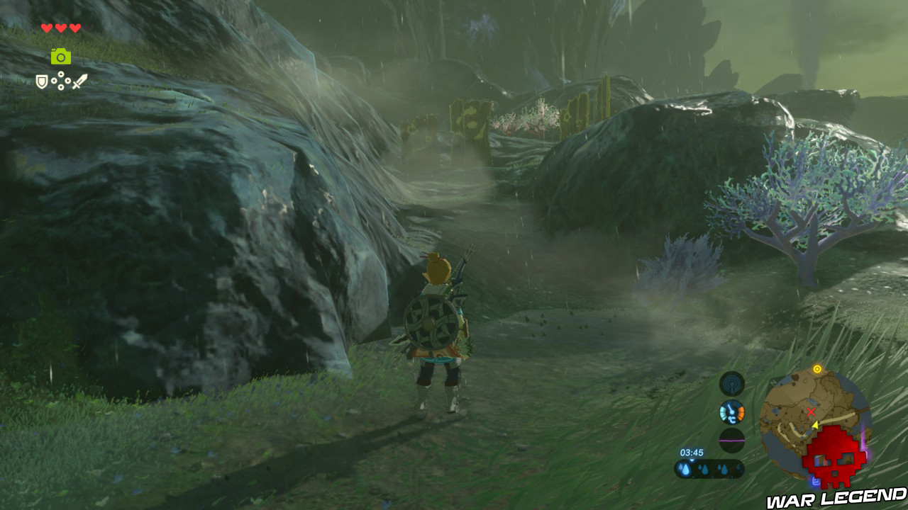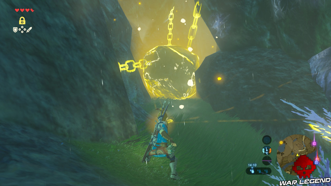 Traversez le pont et suivez le sentier comme Sidon vous l’a indiqué. Éliminez les ennemis sur votre chemin. Lorsque vous arrivez au niveau d’une pente pour grimper dans la montagne, le prince Zora vous interpelle de nouveau pour vous prévenir qu’il y a beaucoup de monstres dans le coin, préparez-vous. Attention lorsque vous voyez arriver le tournant, des rochers vont tomber sur la droite.