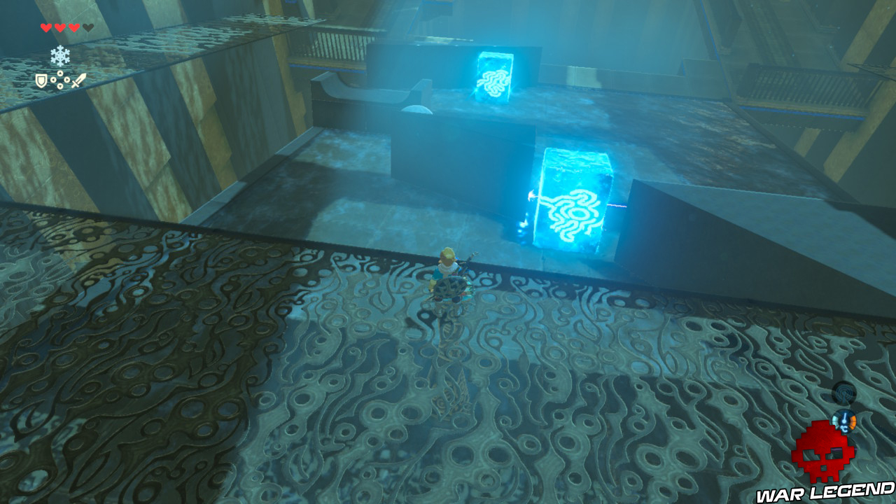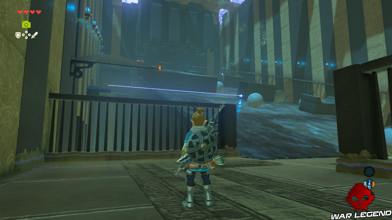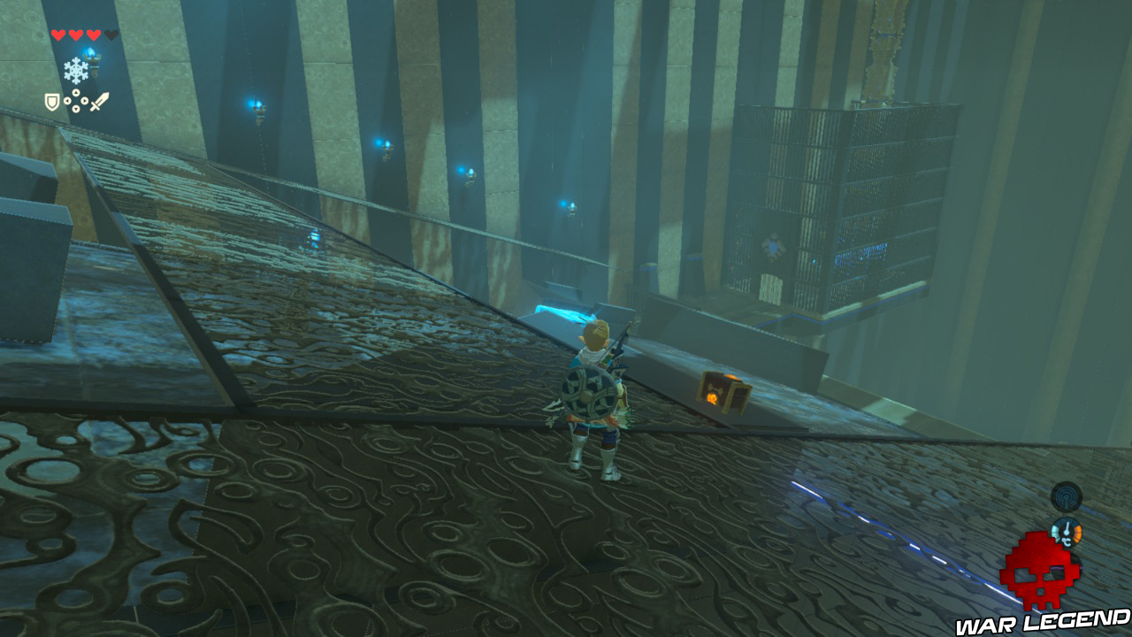 Vous devez montez la pente en faisant bien attention à ne pas vous prendre les rochers dans la figure. Commencez par aller vous planquer derrière le bloc sur lequel le rayon de lumière s’arrête. Contournez-le par la droite en prenant toujours garde aux sphères et finissez de grimper la pente en allant à droite ou à gauche pour gagner la sorte de chemin de garde qui passe au-dessus de l’eau. Vous pouvez vous en servir pour atteindre une coffre contenant une Lance zora.