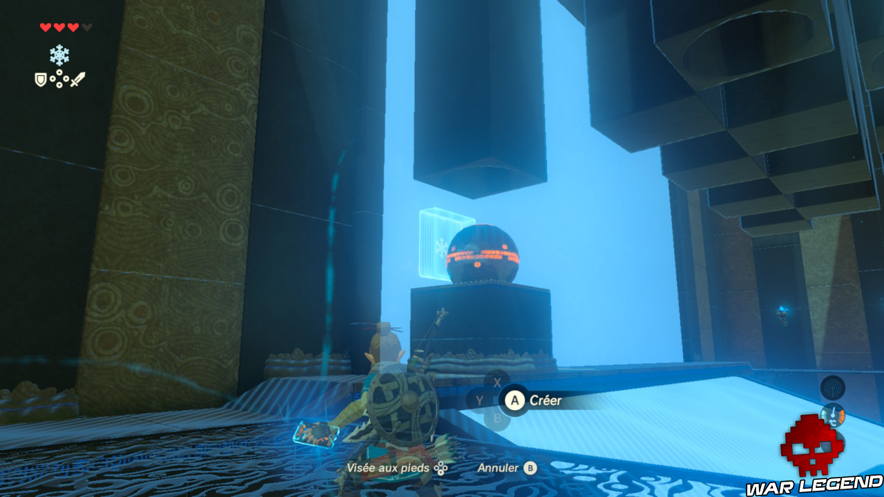 Retournez sur le chemin de garde et commencez par faire apparaître deux blocs de glace : le premier juste devant le rayon lumineux et le second collé à la au dernier bloc en forme de triangle (si vous vous approchez du fameux triangle, vous verrez que l’autre côté est pourvu d’un indentation : alignez bien votre bloc de glace avec le bord du creux ainsi formé).