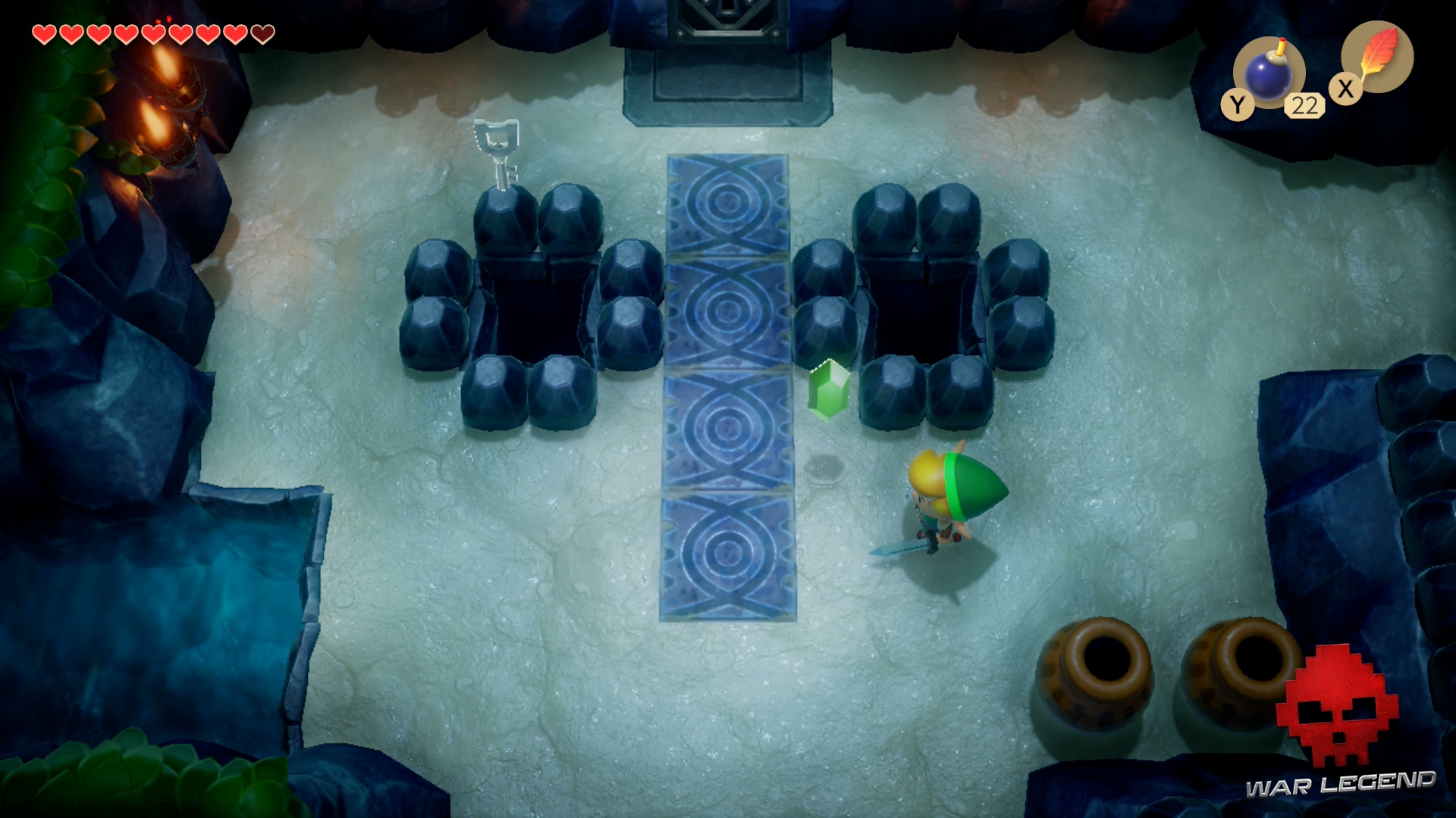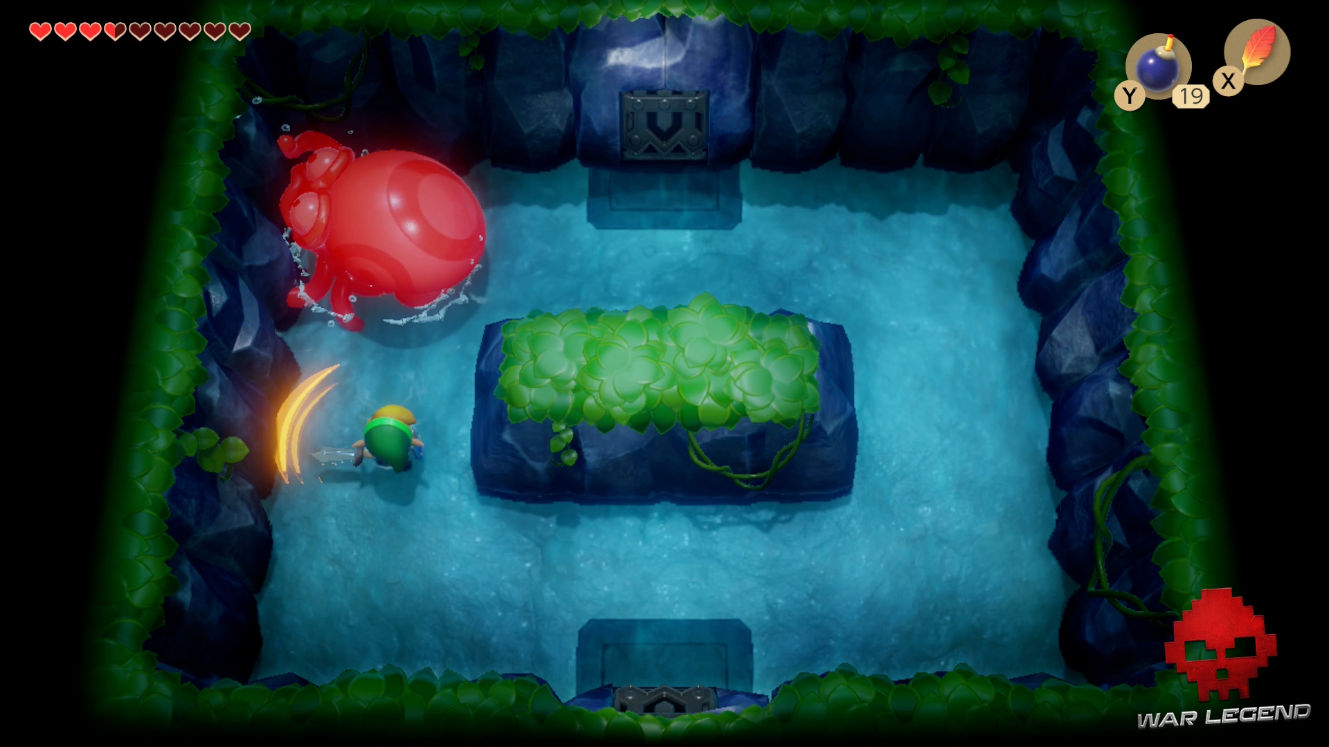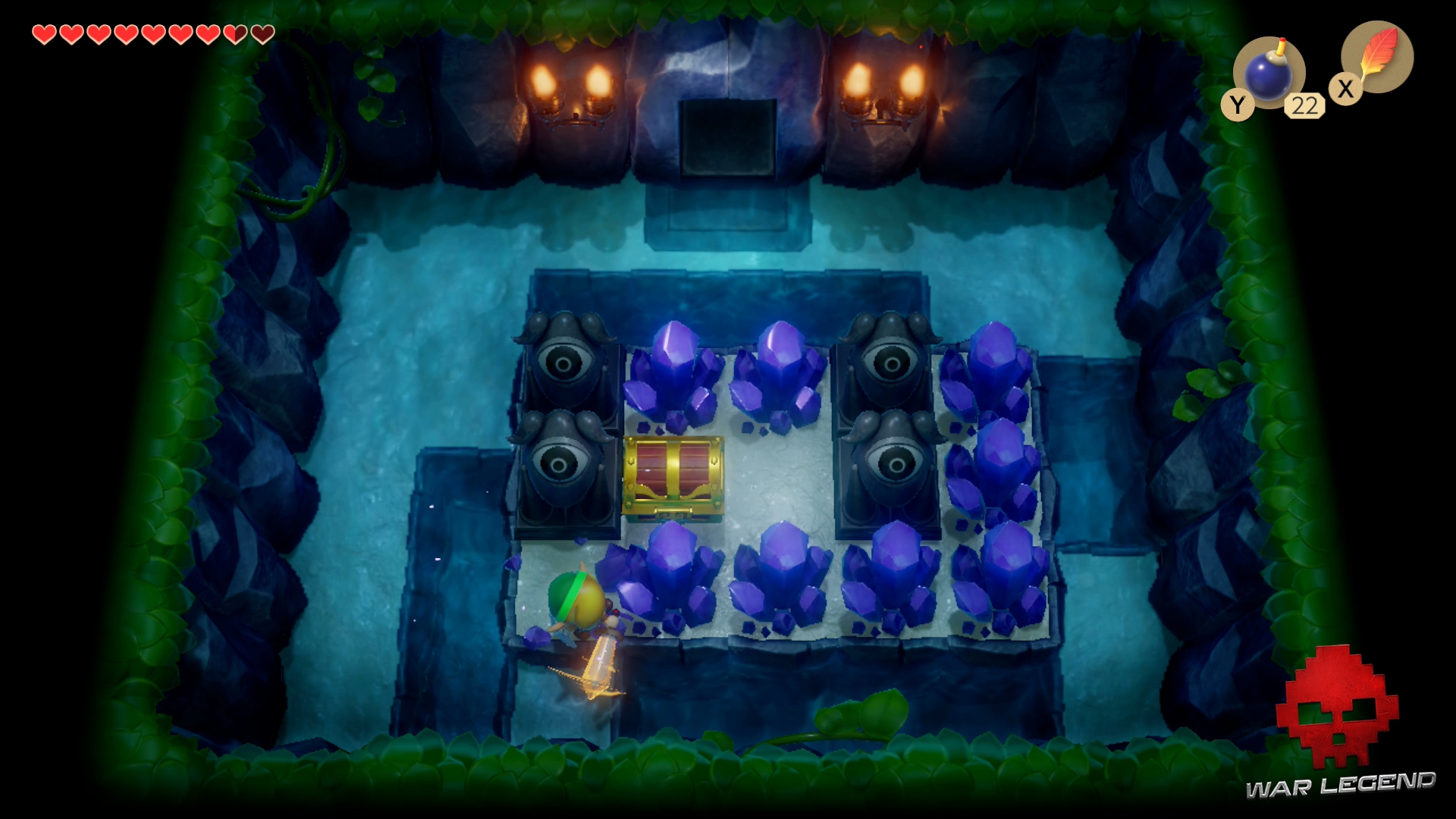 Revenez dans la salle où la petite clé est tombée et utilisez ouvrez la porte en haut. Affrontez déjà le mini-Boss. Faites le tour du rocher au centre pour éviter sa charge et attaquez dès qu’il présente son flanc.
