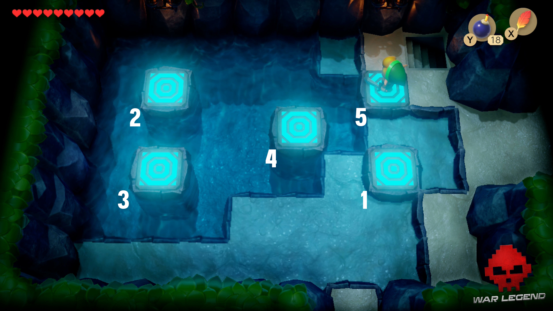 Descendez et utilisez les palmes pour revenir à la salle avec les deux trous. Retournez dans la salle avec les dalles entourées d’eau et marchez dans le même ordre que précédemment. Un escalier apparaît.