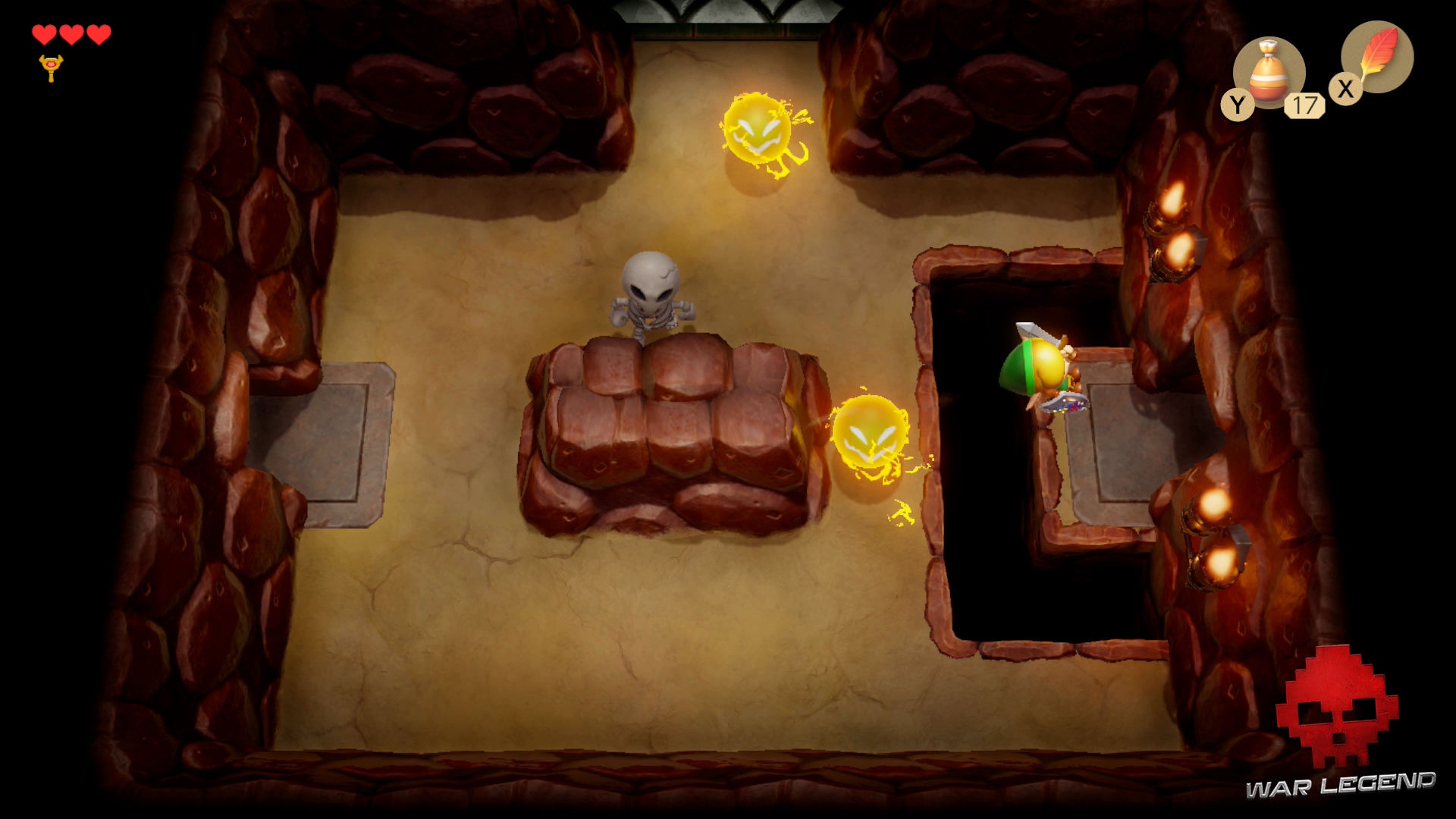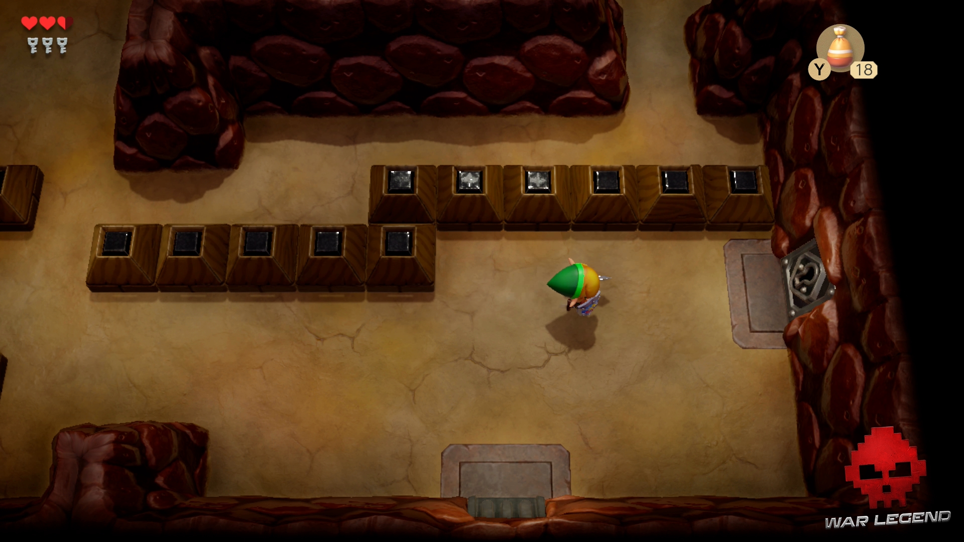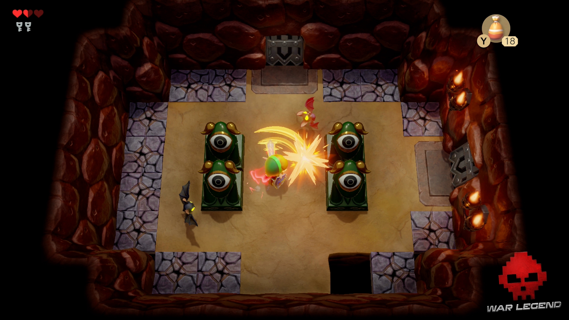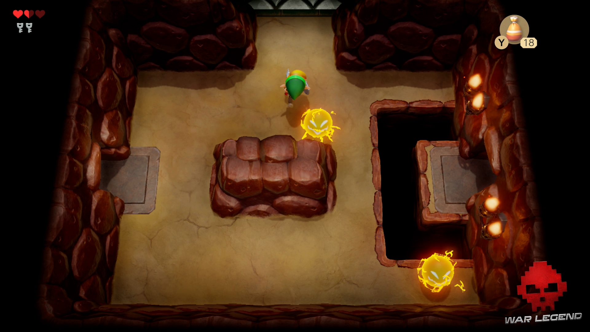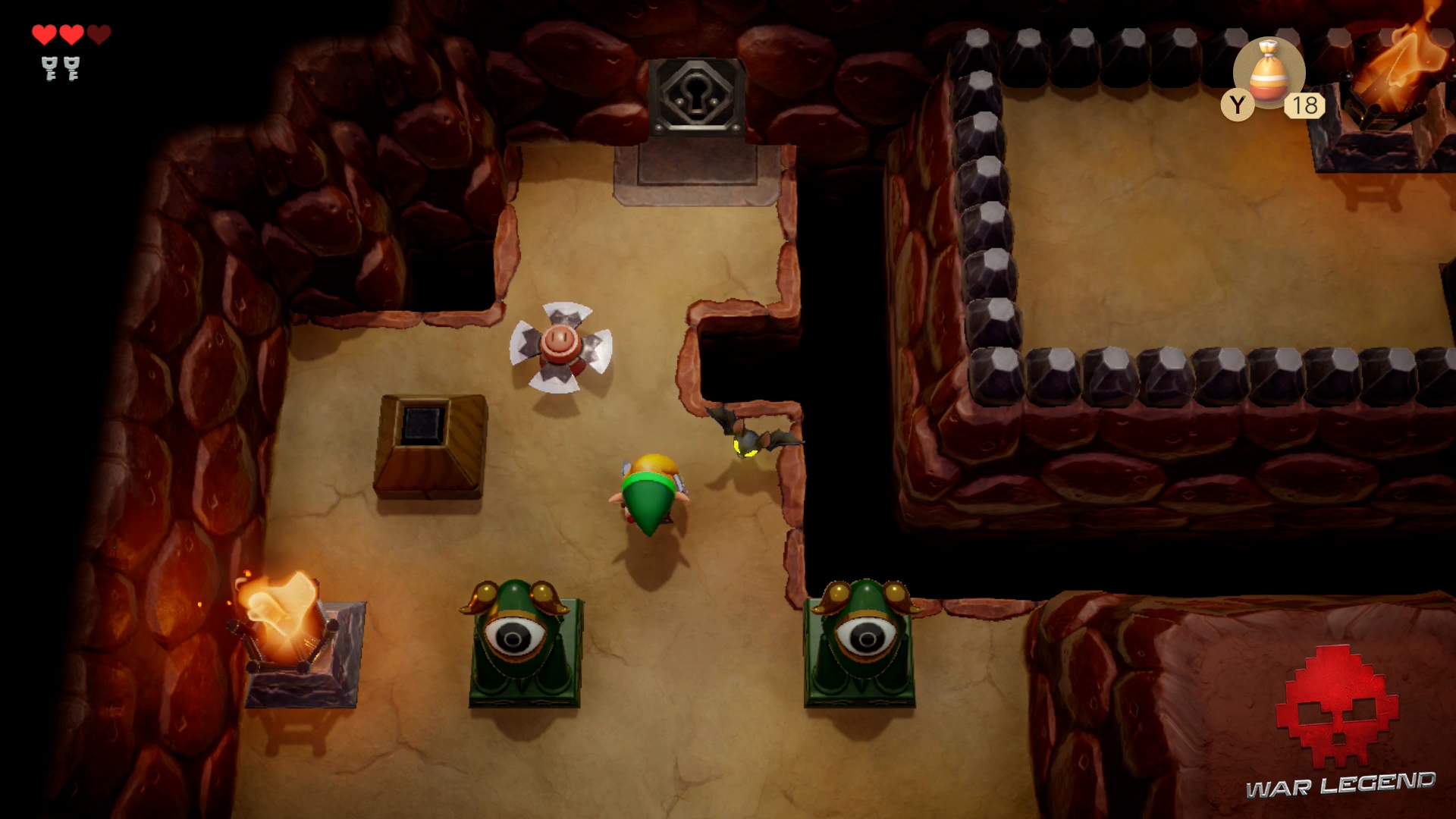 Passez la nouvelle porte qui vient de se dévérouiller et rentrez dans une grande pièce. Un coffre se trouve au milieu avec une troisième clé à l’intérieur. Si vous tuez tous les ennemis, vous obtiendrez un autre coffre avec 20 rubis.