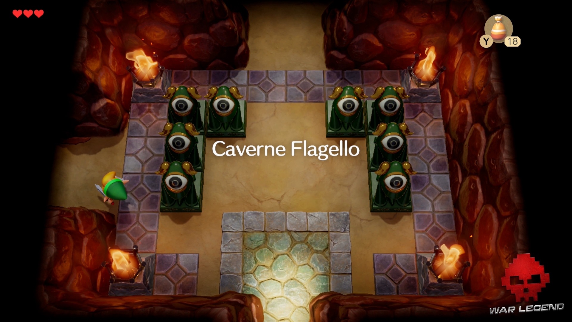 Vous tomberez enfin sur l’entrée de la Caverne Flagello. Utilisez la clé sur la statue et rentrez.