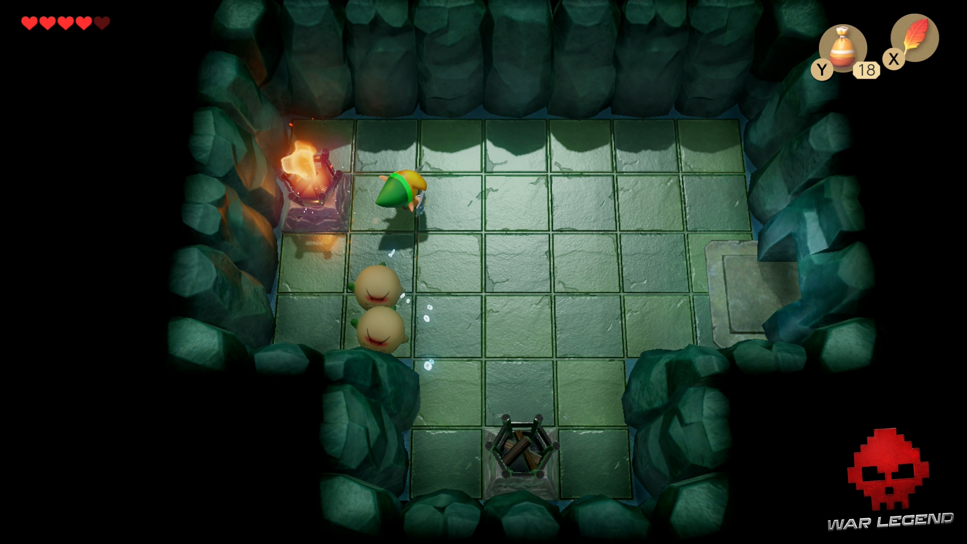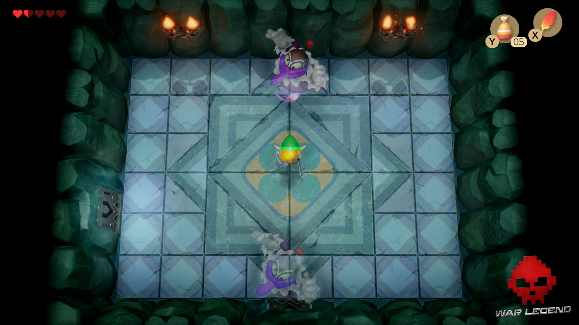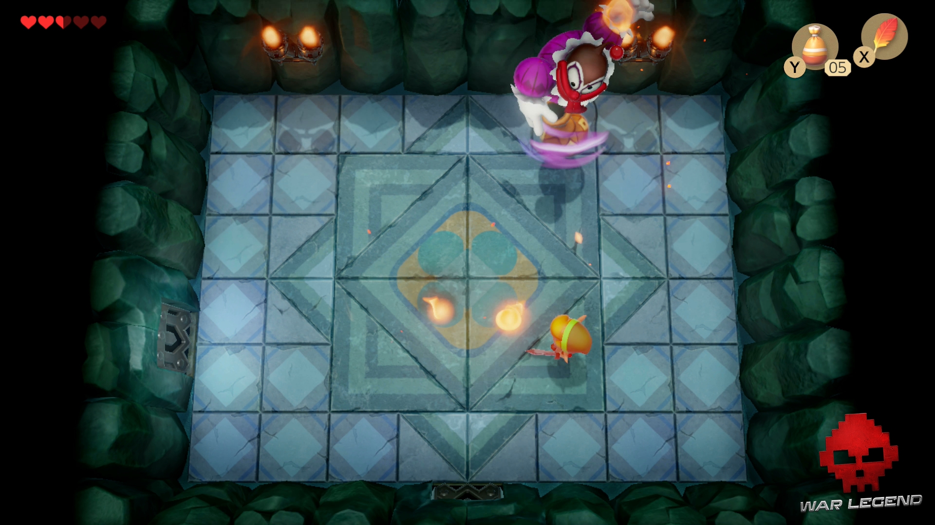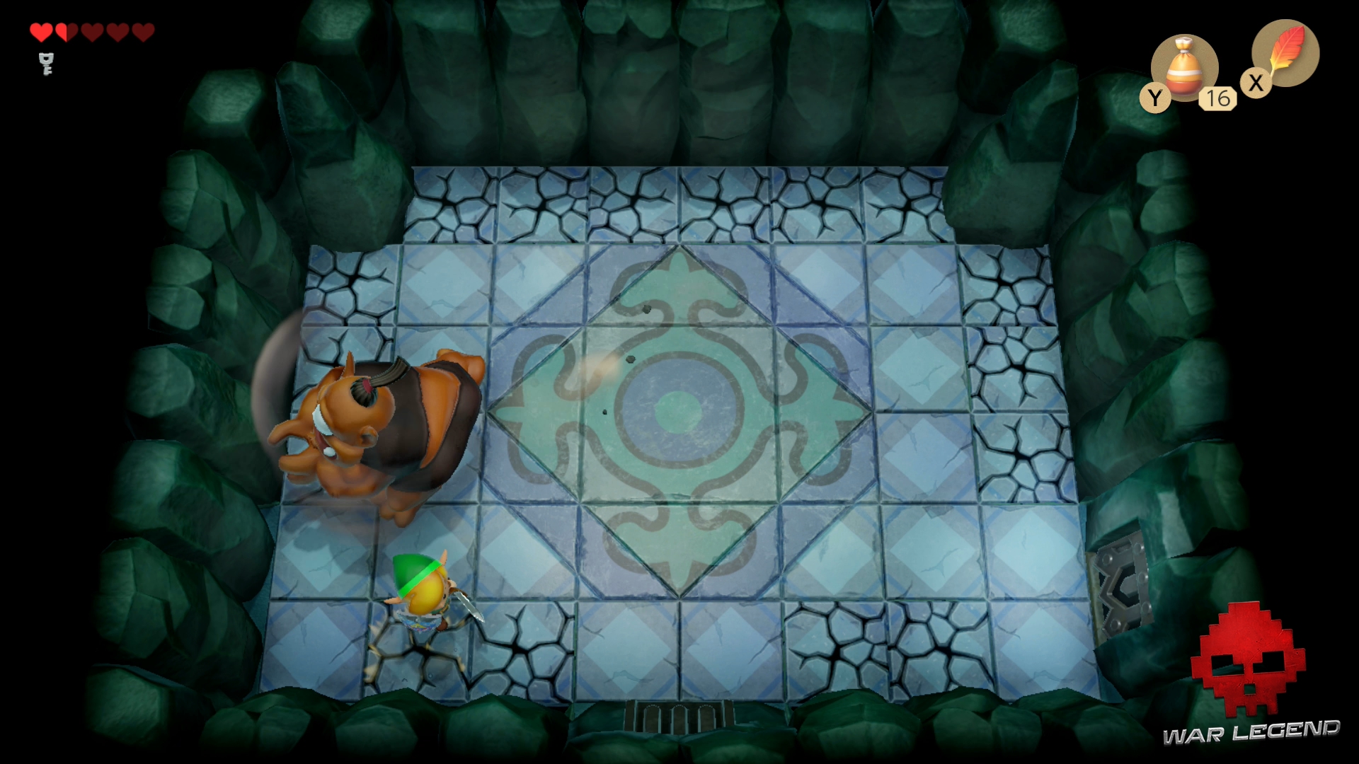 Vous voilà face au mini-boss du donjon. Esquivez ses bombes et sa charge. Frappez qu’il manque de vous attraper. S’il vous attrape et vous lance, ne restez pas planté sur les côtés afin de ne pas traverser le sol fissuré.