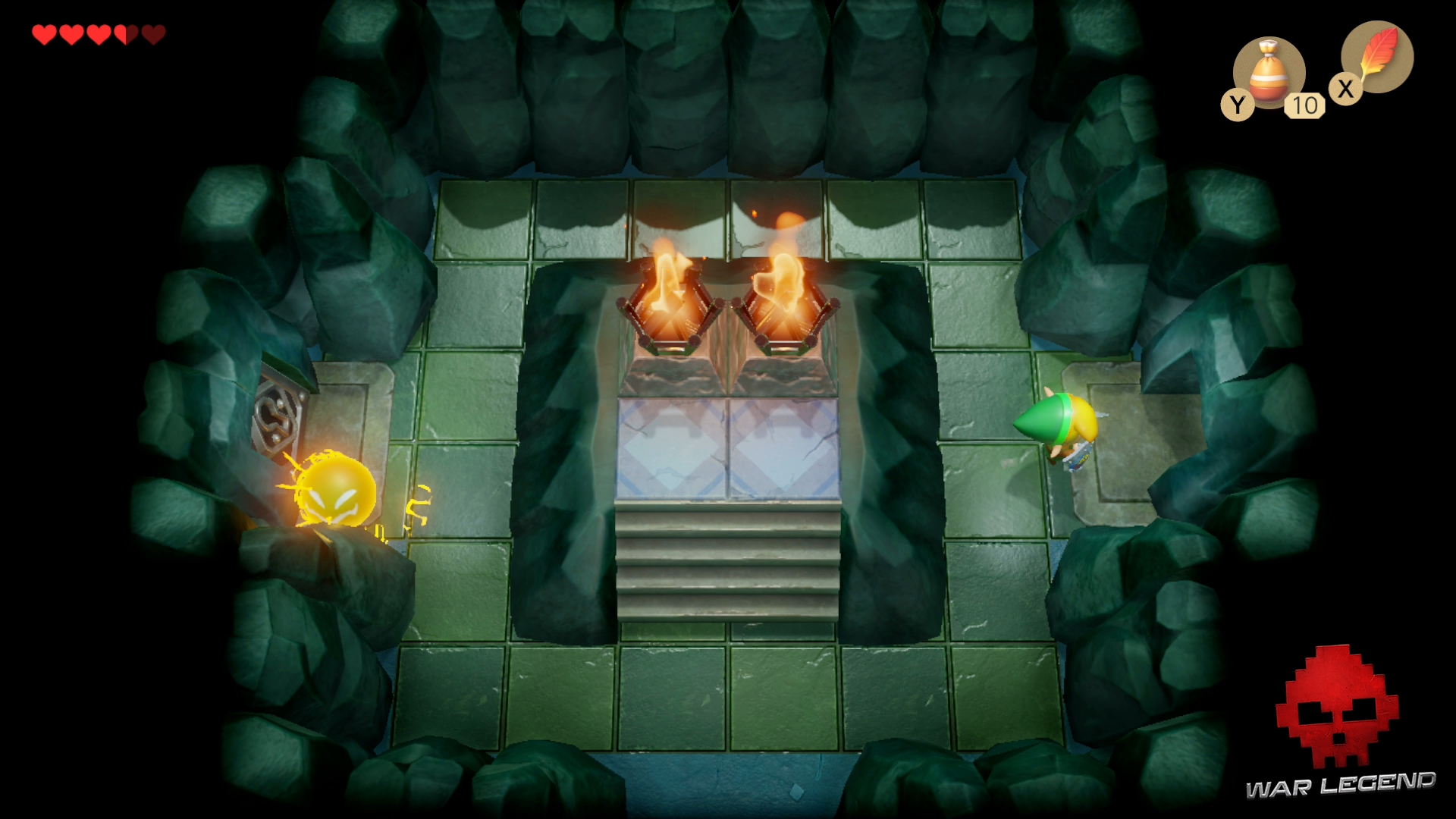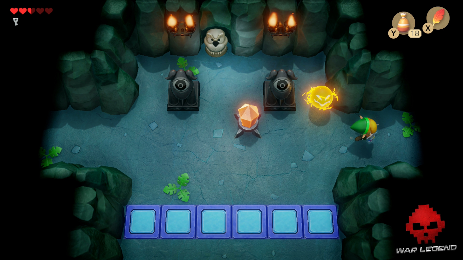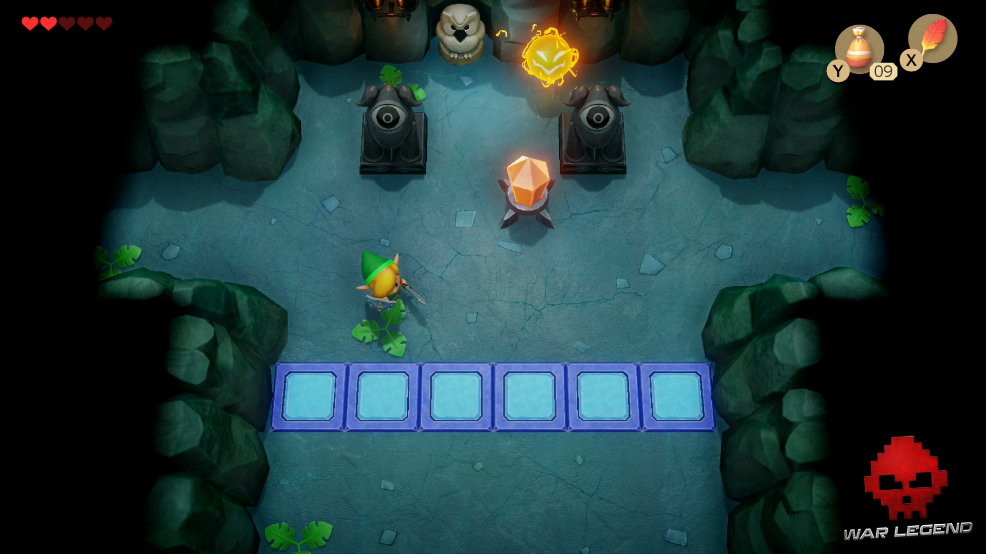 Vous voilà face au mini-boss du donjon. Esquivez ses bombes et sa charge. Frappez qu’il manque de vous attraper. S’il vous attrape et vous lance, ne restez pas planté sur les côtés afin de ne pas traverser le sol fissuré.