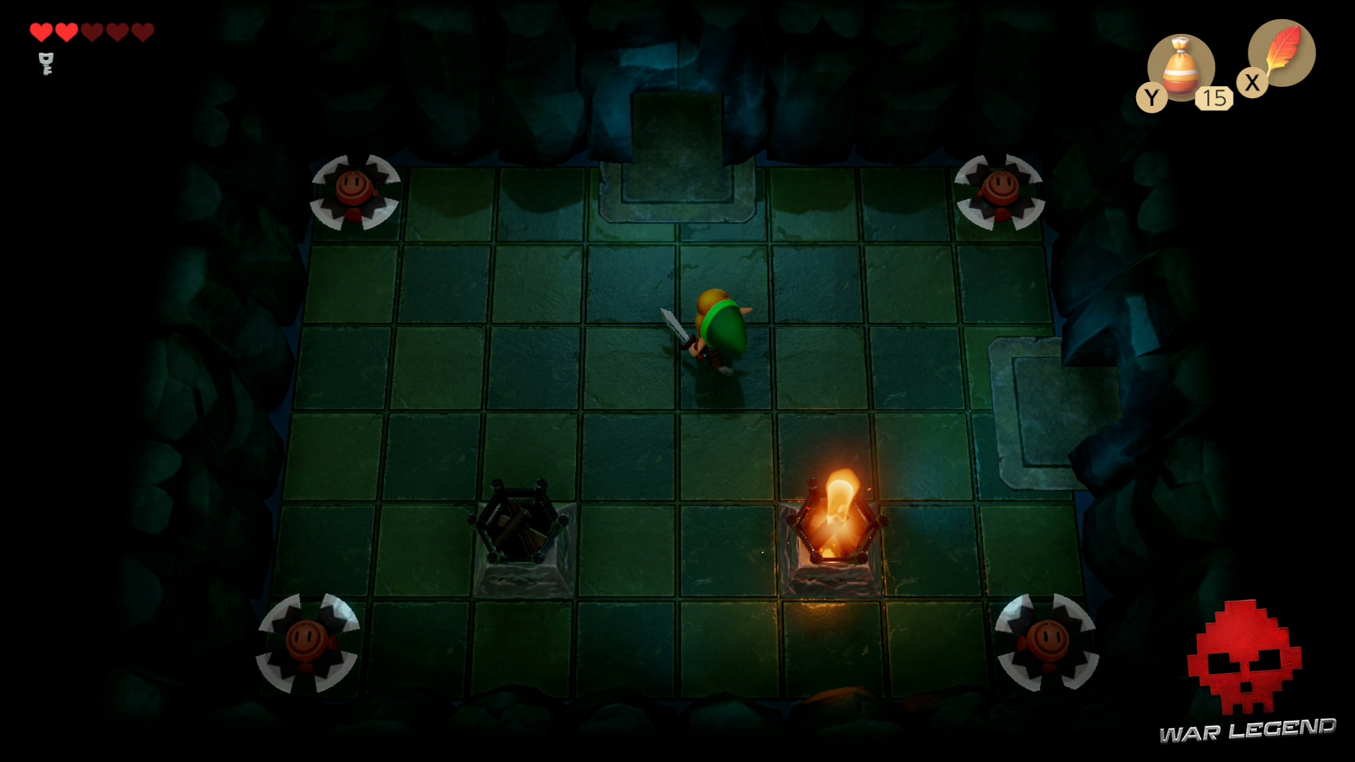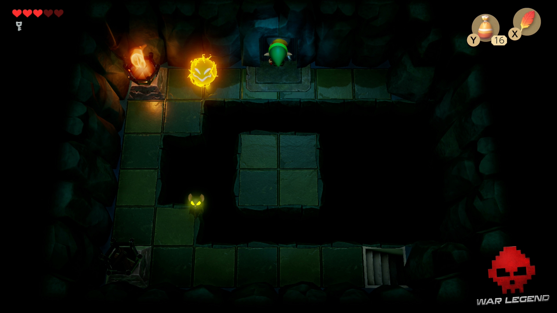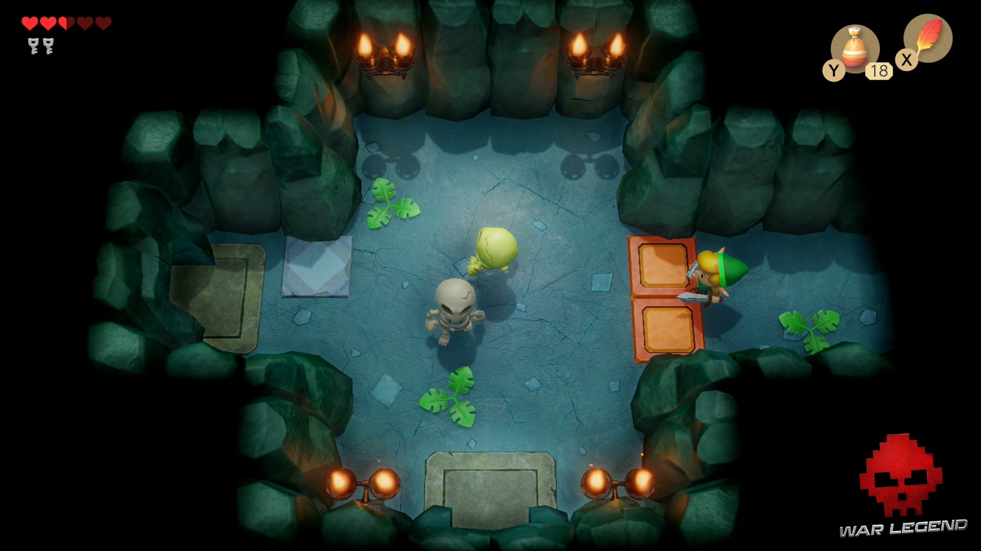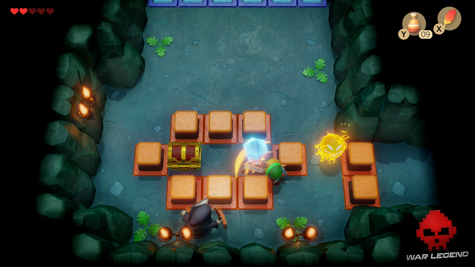 Vous voilà face au mini-boss du donjon. Esquivez ses bombes et sa charge. Frappez qu’il manque de vous attraper. S’il vous attrape et vous lance, ne restez pas planté sur les côtés afin de ne pas traverser le sol fissuré.