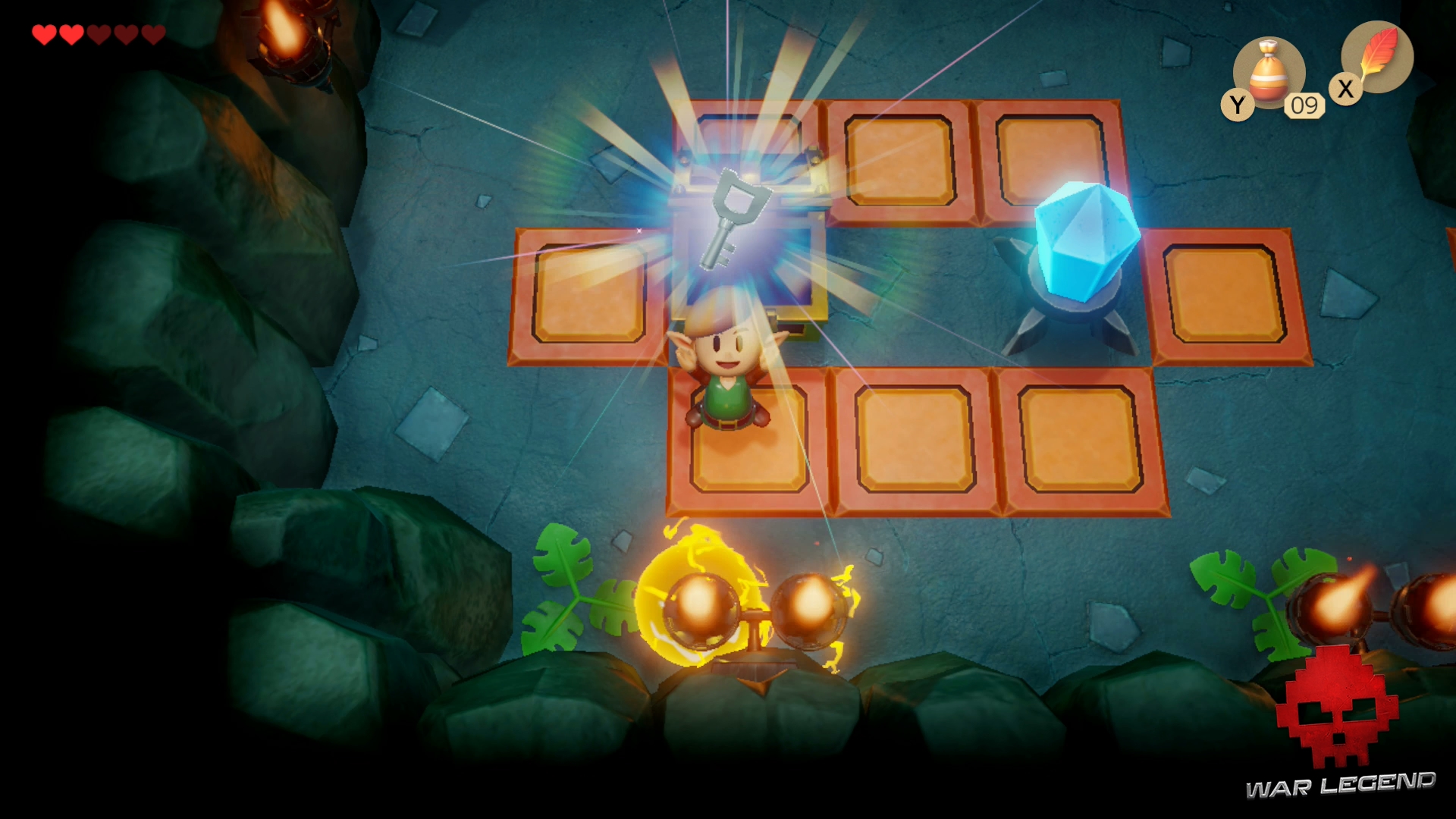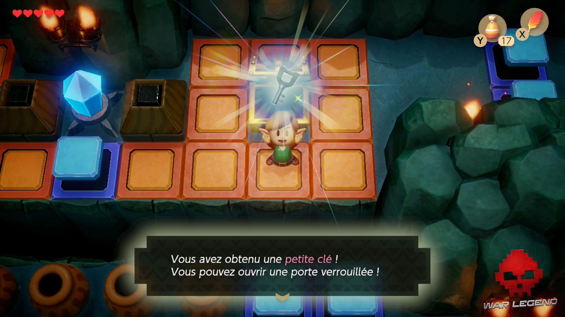 Revenez encore en arrière et frappez le cristal au passage (bleu). Revenez à nouveau en arrière jusqu’à arriver à la salle adjacente à l’entrée du donjon. Utilisez une clé sur la porte à gauche.