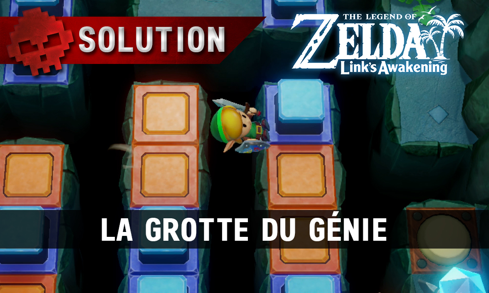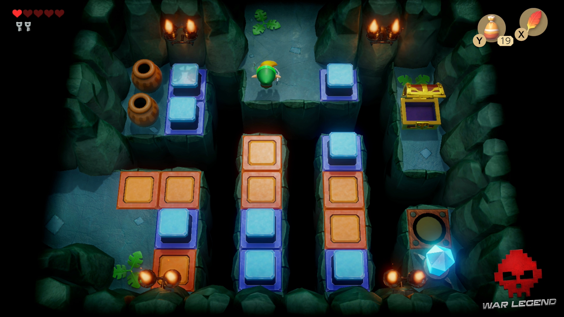 Revenez dans la pièce précédente et frayez-vous un passage par le haut, derrière le coffre qui contient 20 rubis. Tapez sur le cristal (orange), montez sur le bloc bleu, et tapez à nouveau dessus (bleu).