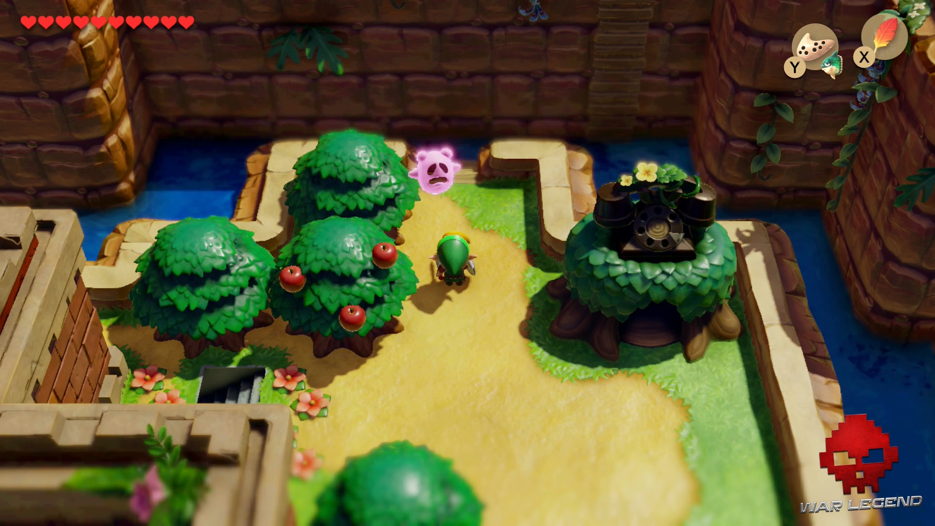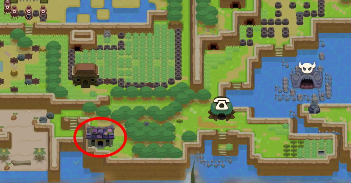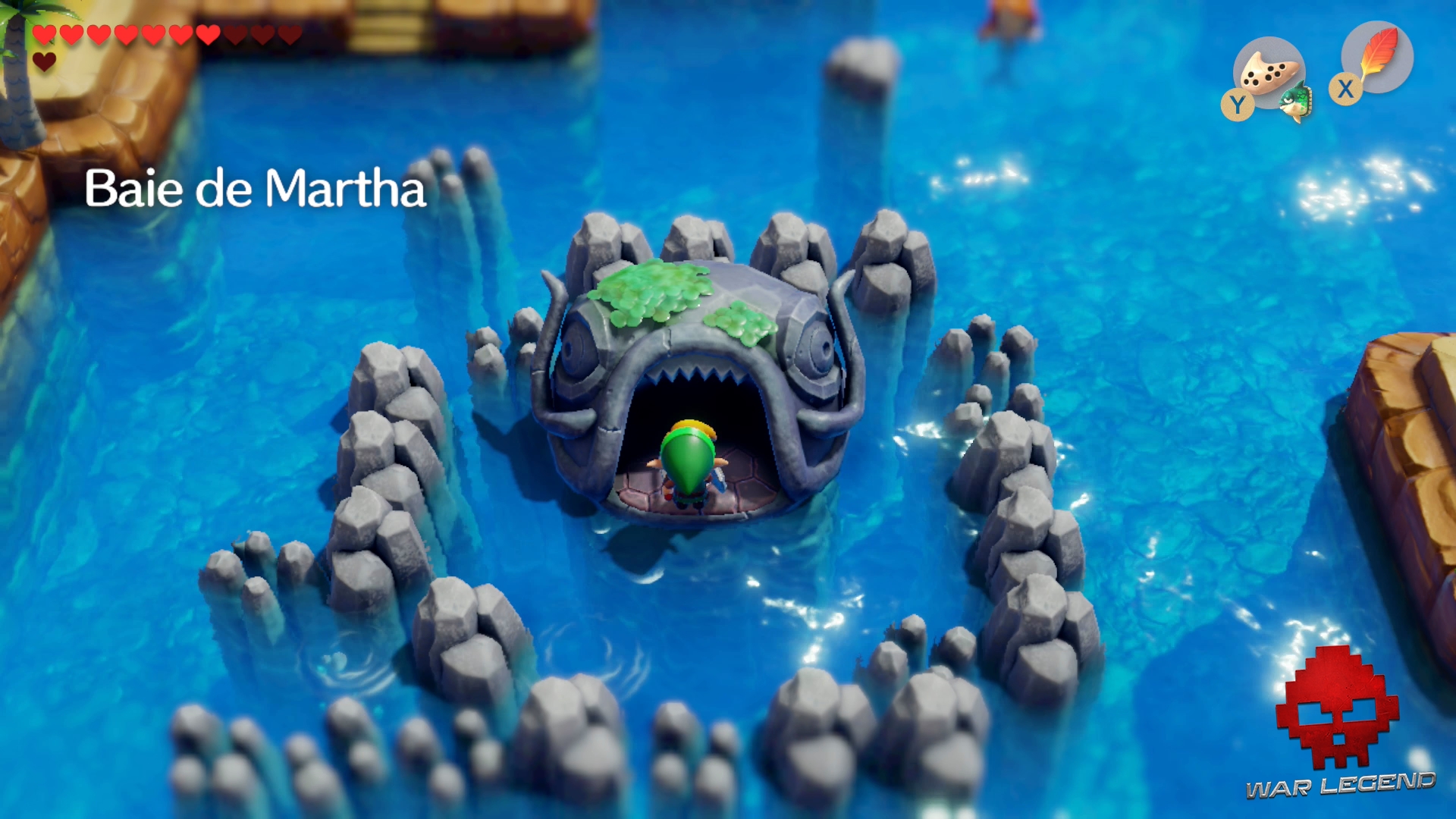 Le Hibou intervient et vous rappelle que vous devez aller à la Baie de Martha, pour affronter le prochain donjon : Poisson-Chat. Jouez le Mambo de Manbo à l’Ocarina pour vous téléporter au Village des Animaux et rendez-vous dans la Baie de Martha, à l’ouest.