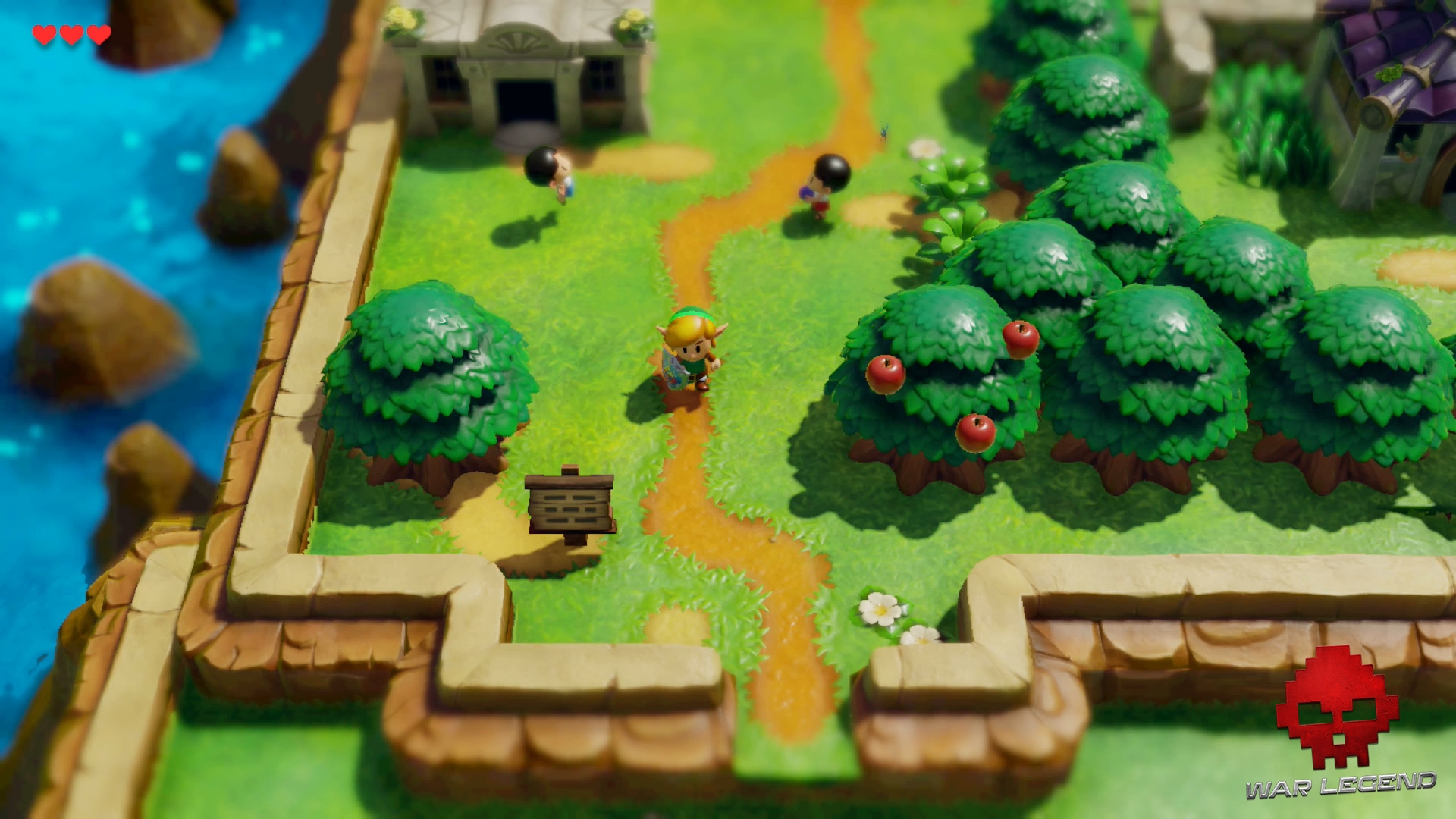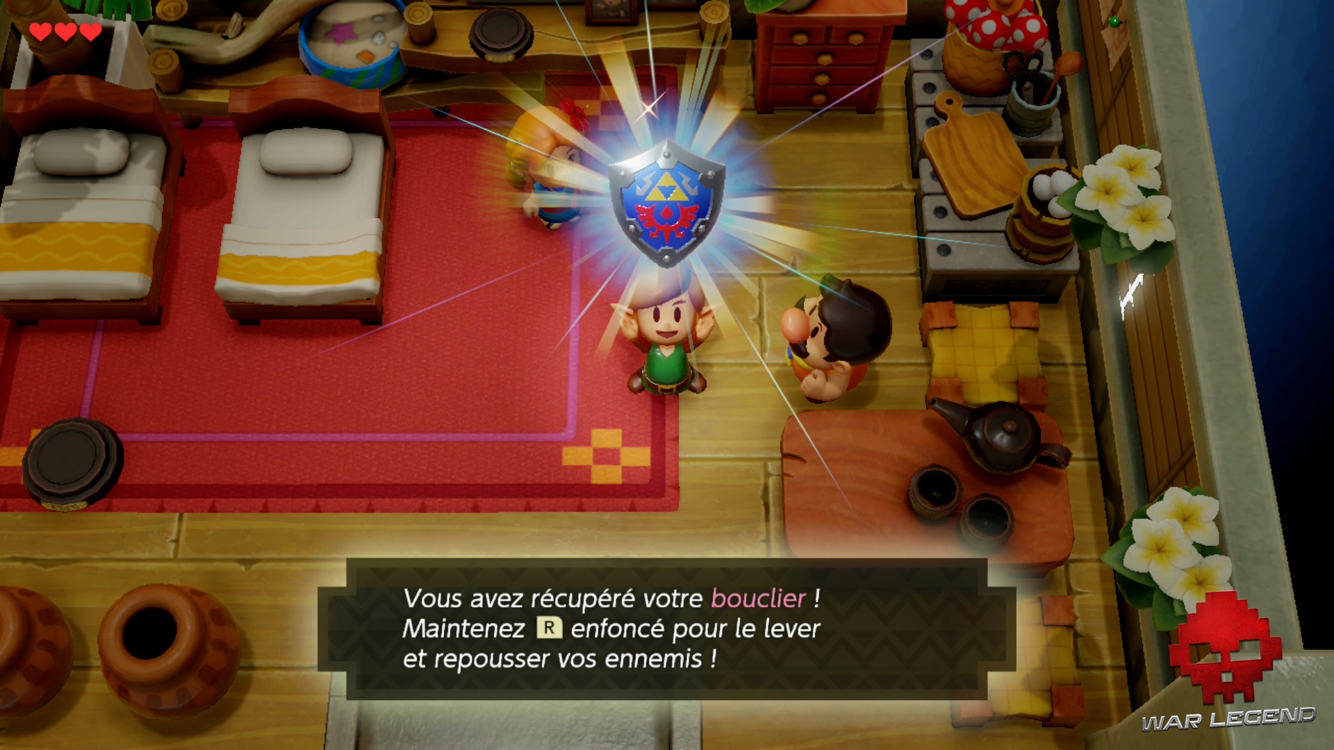 La jeune femme qui vous a trouvé se nomme Marine. Les villageois ne savent pas trop quoi faire de vous, mais espèrent pouvoir vous aider à quitter l’île pour retrouver les plaines d’Hyrule.