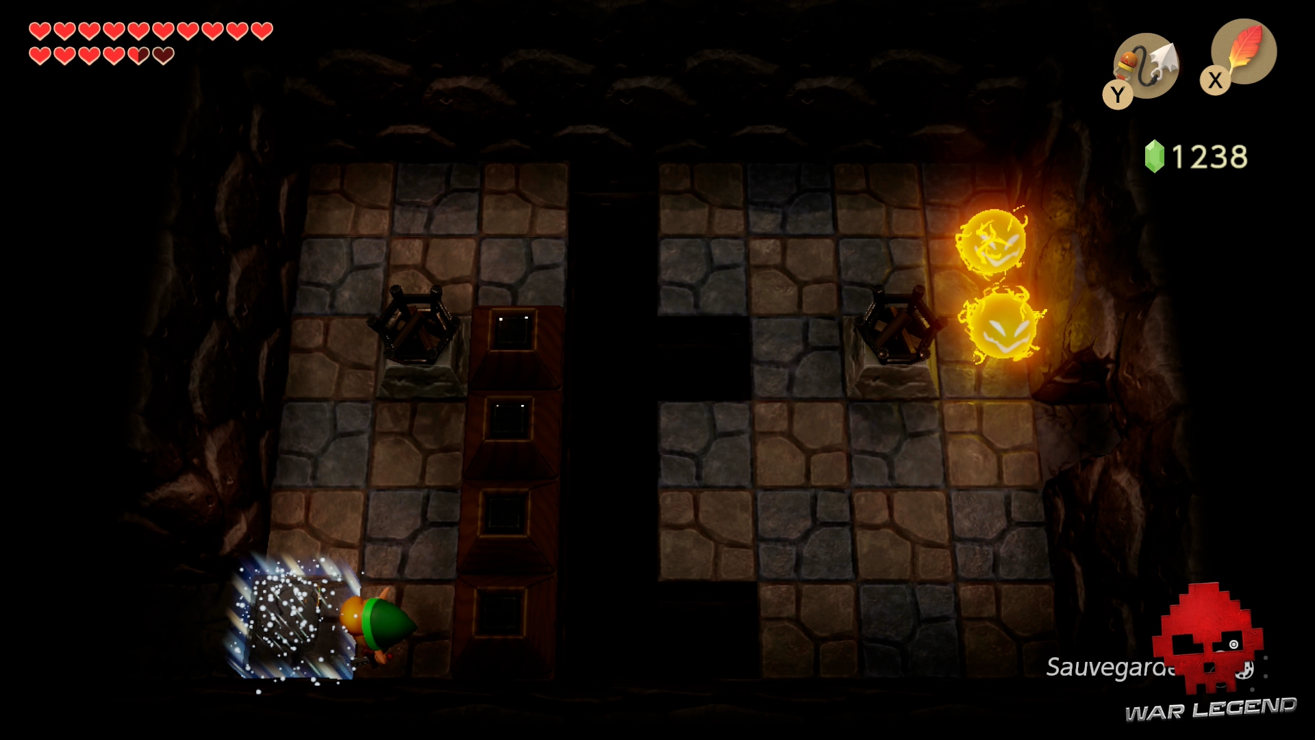 Revenez dans la pièce précédente et allez en haut. Battez le diablotin et montez les escaliers. Vous voilà à l’extérieur, avec un quart de cœur et un téléporteur. Histoire de souffler et revenir plus tard, si besoin.