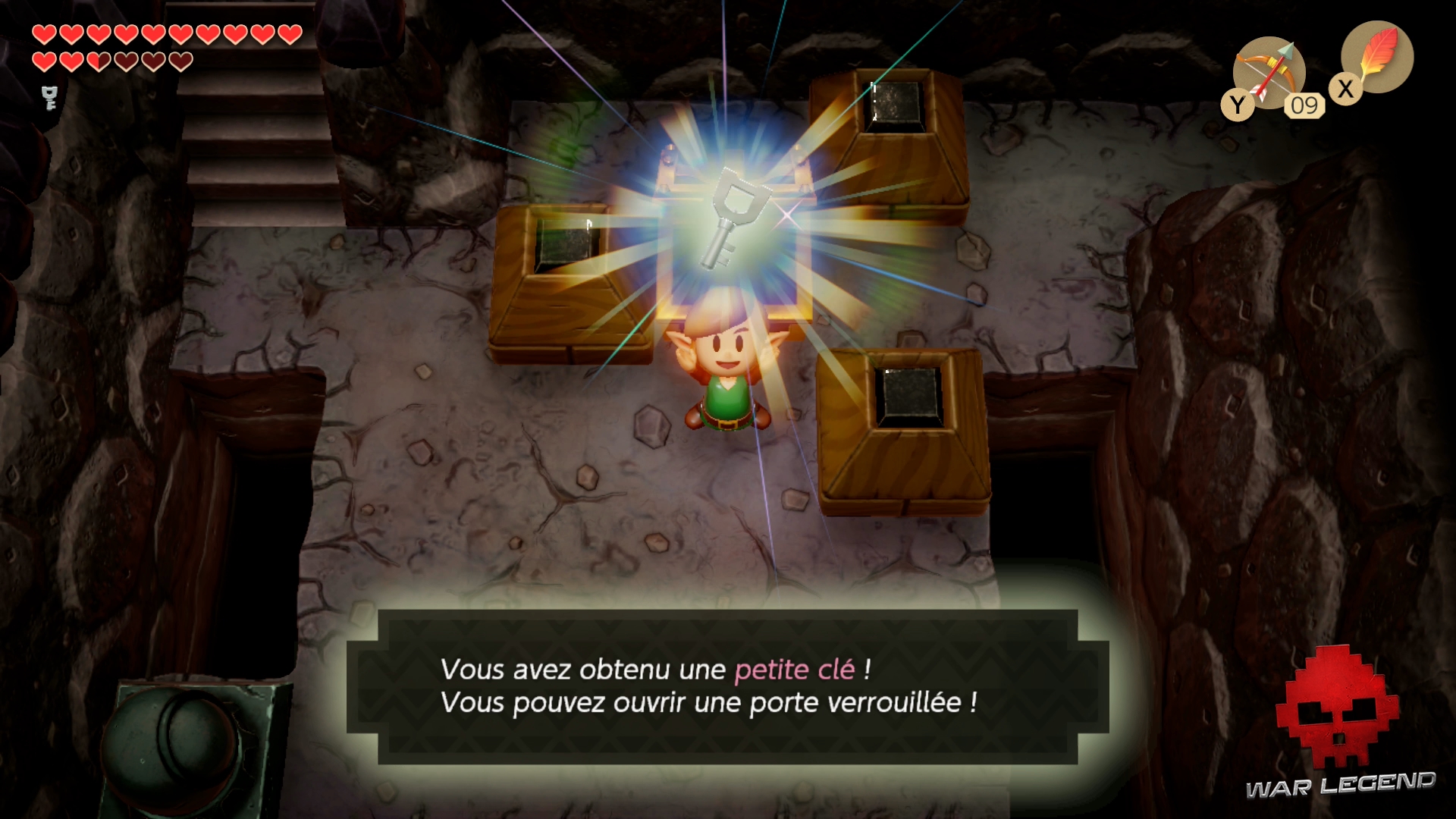 Vous trouverez la boussole dans la salle en bas. Revenez, et passez la porte du haut. Le diablotin vous bloque encore le passage. Utilisez la même technique qu’à l’entrée du donjon et récupérez une première petite clé.