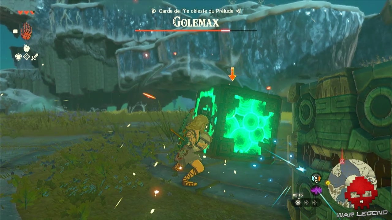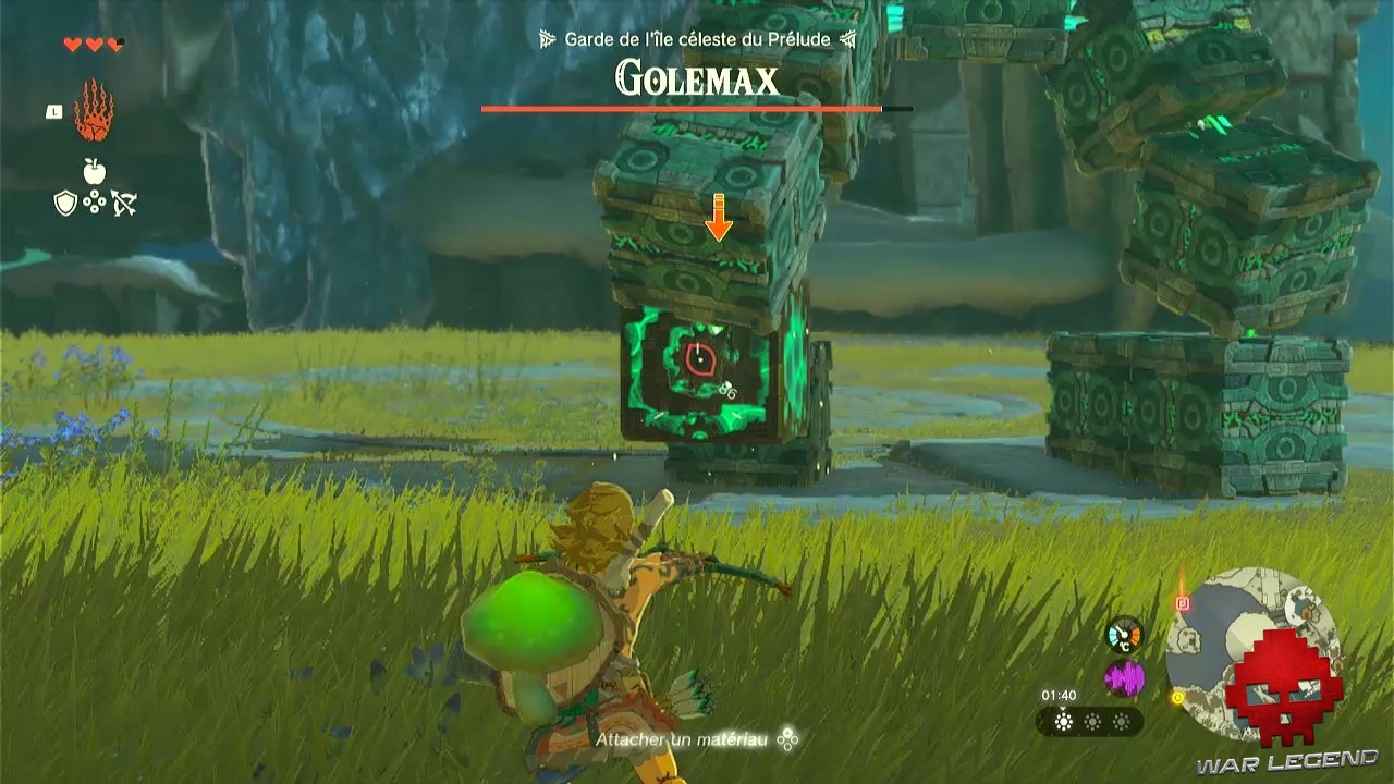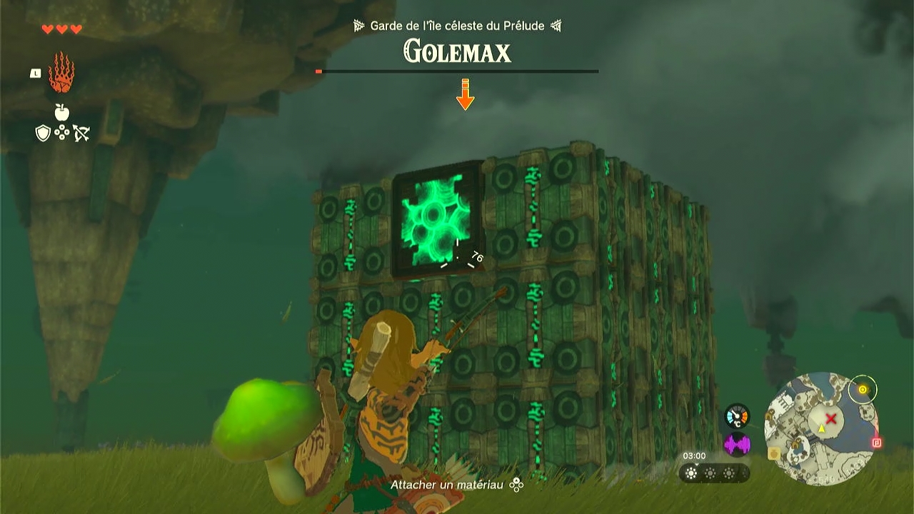 Juste avant de mourir, Golemax se transforme en cube et tente de vous écraser. Encore une fois, repérez le point faible, et attendez le bon moment pour décocher une flèche.