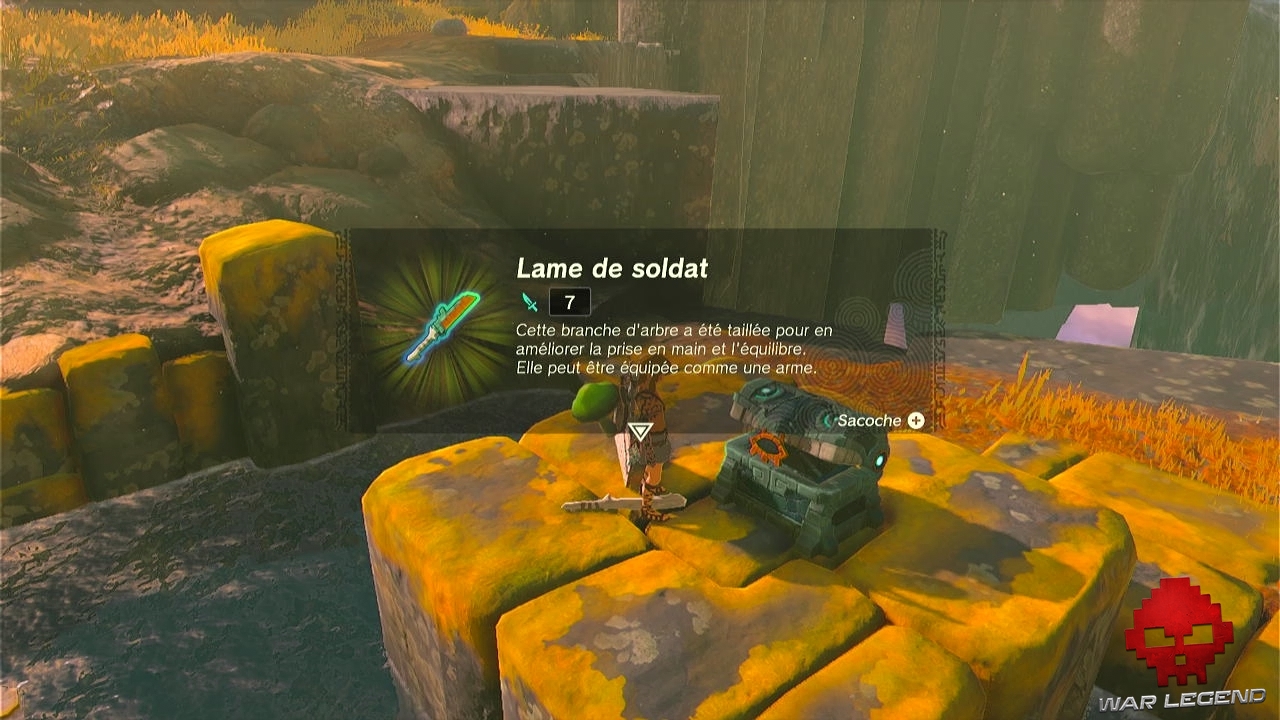 Plus loin, vous trouverez un coffre avec une lame de soldat, vous apprenant à créer une arme plutôt efficace en associant un bâton et une partie de golem guerrier.