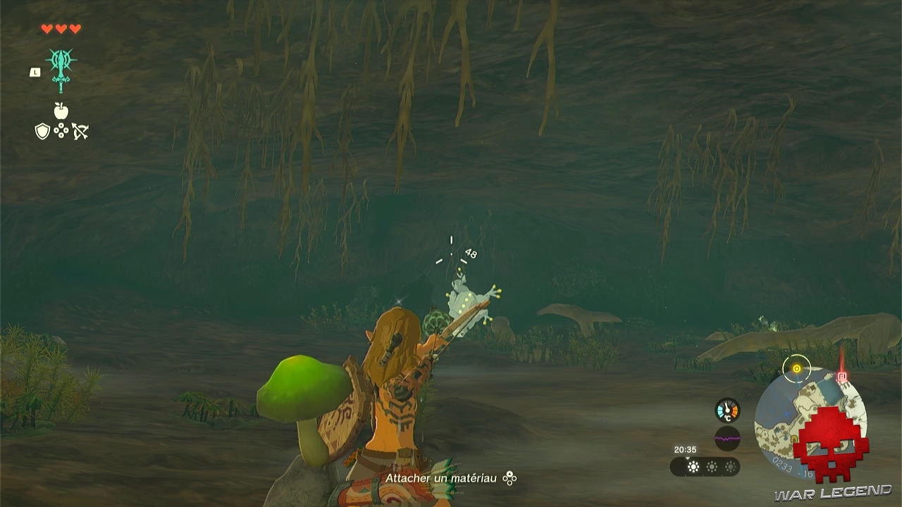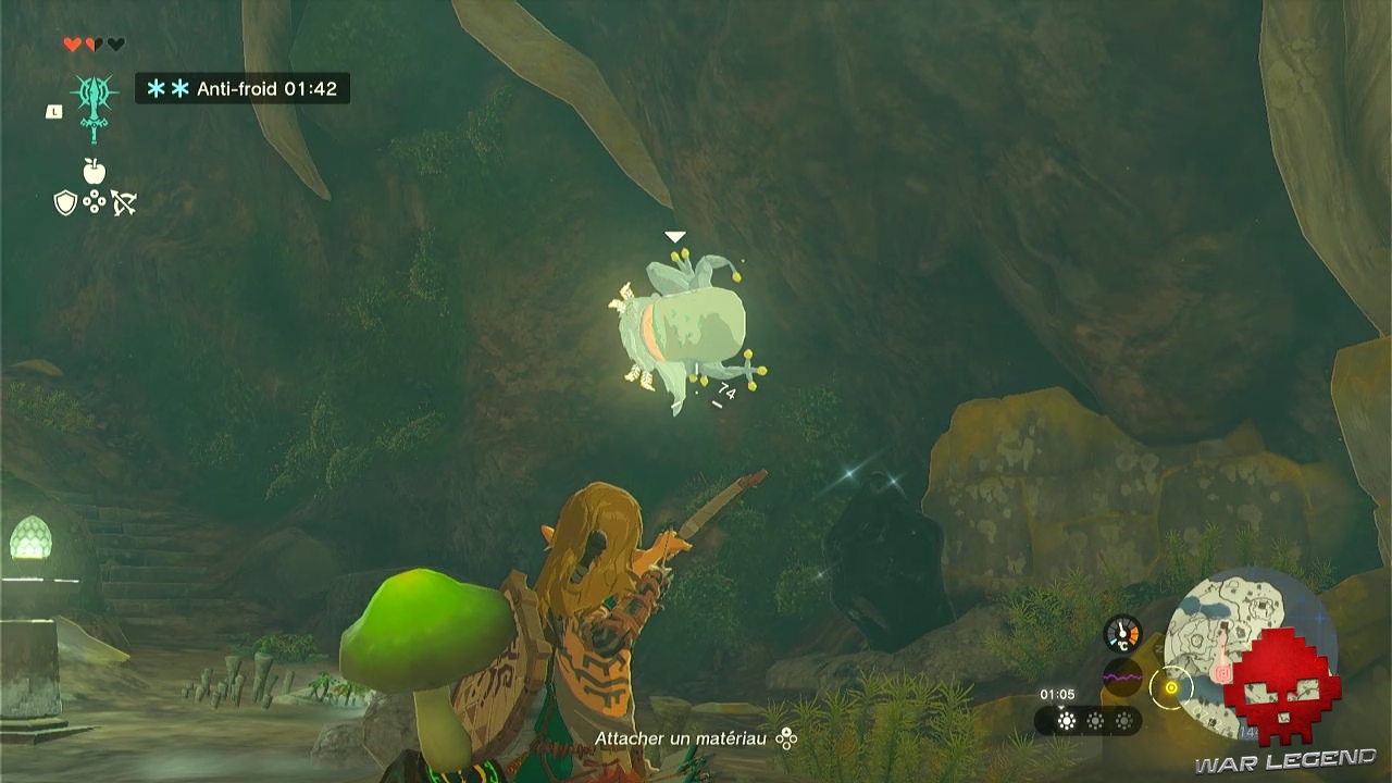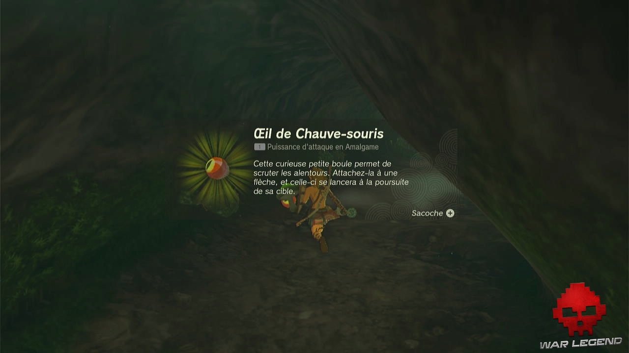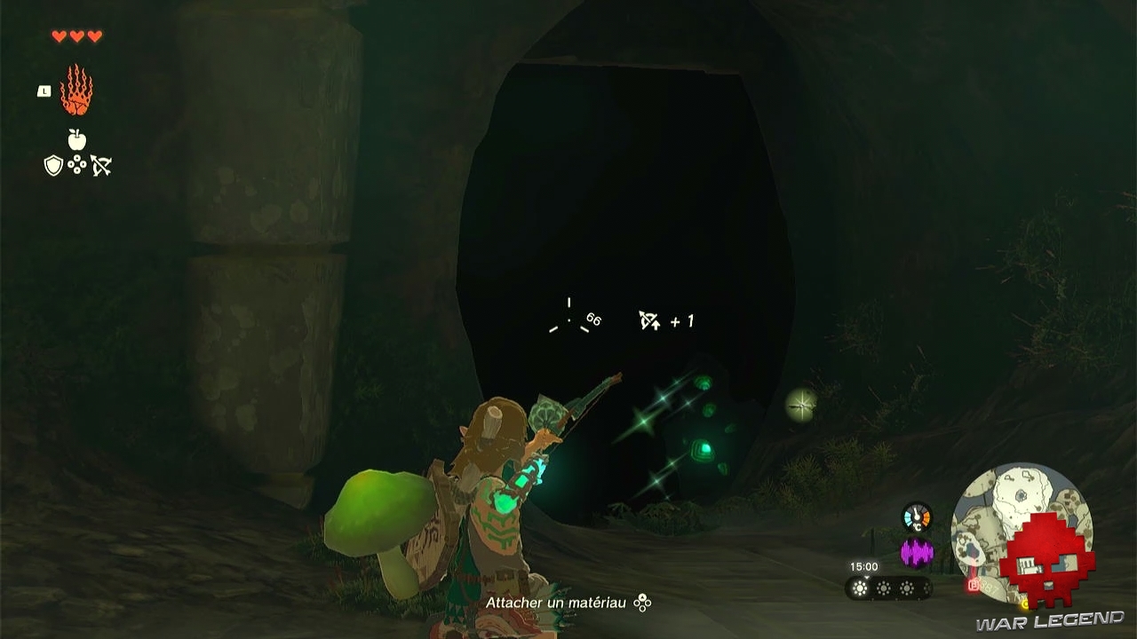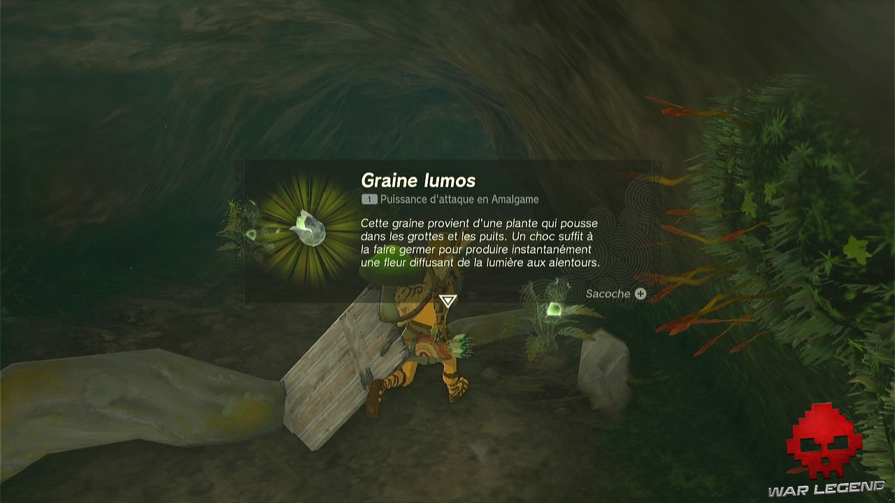 Escaladez les débris et progressez. Le reste de la grotte est plongé dans l’obscurité. Il est temps d’utiliser les Graines lumos, en les lançant à la main (R + croix directionnelle haut) ou en les propulsant avec des flèches via Amalgame. Vous voilà équipé d’un lance-fusées éclairantes.