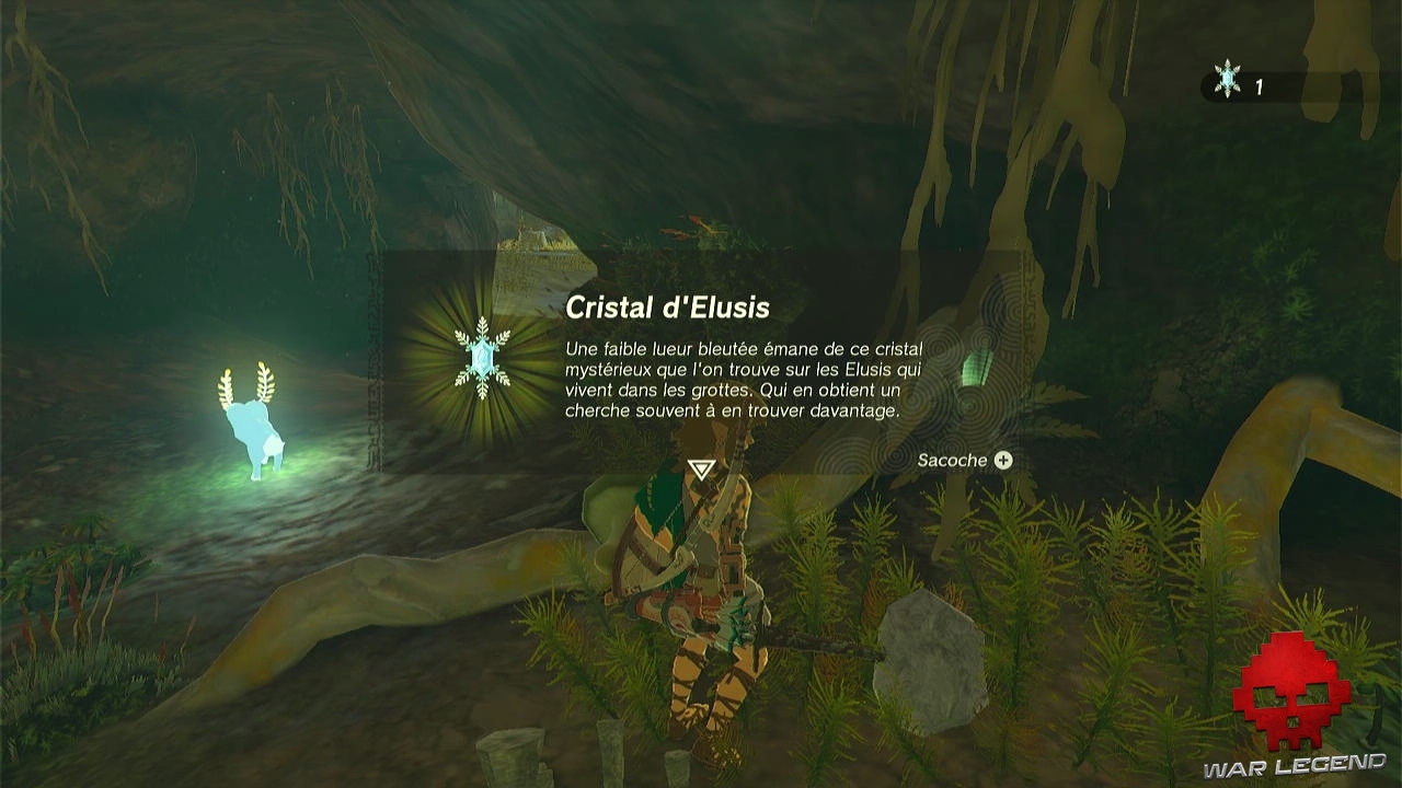 Dans la cavité suivante, une drôle de créature luisante est accrochée au plafond : un Elusis. Il n’est pas hostile, mais décochez une flèche dans la tête pour récupérer un Cristal d’Elusis.
