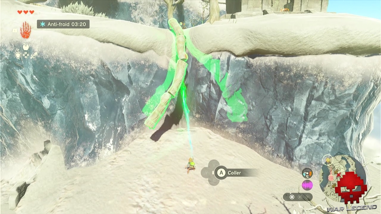 Le sanctuaire est presque à portée. Repérez l’abris en pierre en hauteur, au même niveau que le sanctuaire, et construisez une passerelle en rondins pour grimper. Un trou dans la falaise devrait vous aider à caler le bouzin.