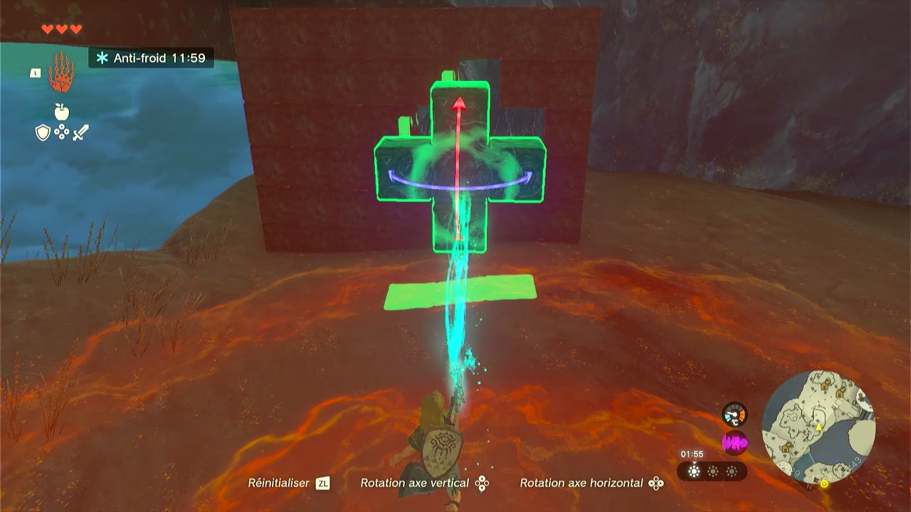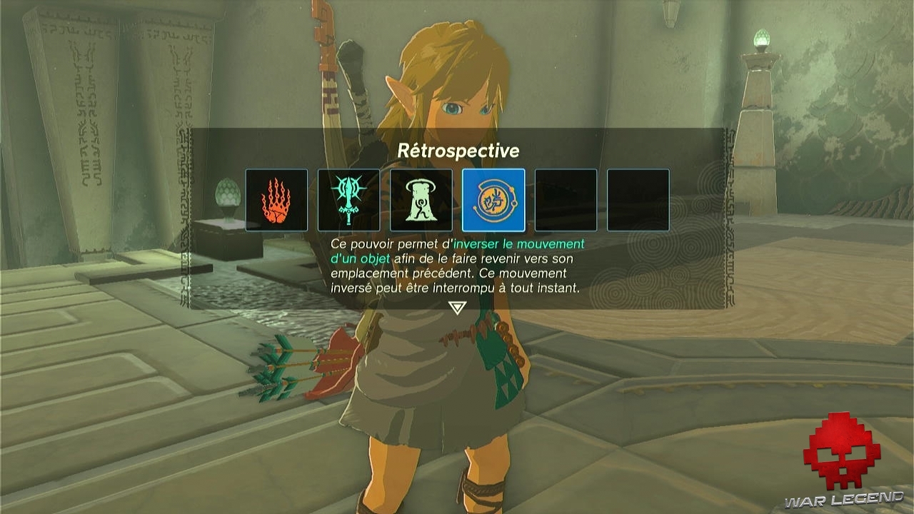 En visant un objet avec Rétrospective, le temps s’arrête pour vous donner le temps d’analyser la situation, et vous serez capable d’apercevoir sa trajectoire qui l’a amené dans son état présent. C’est un pouvoir essentiel pour atteindre certaines îles célestes, en s’accrochant à des débris qui viennent de toucher le sol d’Hyrule.