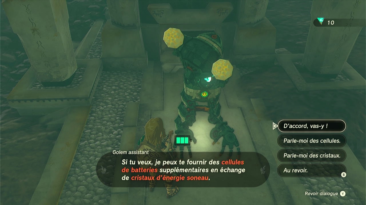 Au bout, vous tombez sur le sanctuaire, et le golem assistant capable d’échanger 100 cristaux d’énergie soneau contre une cellule de batterie.