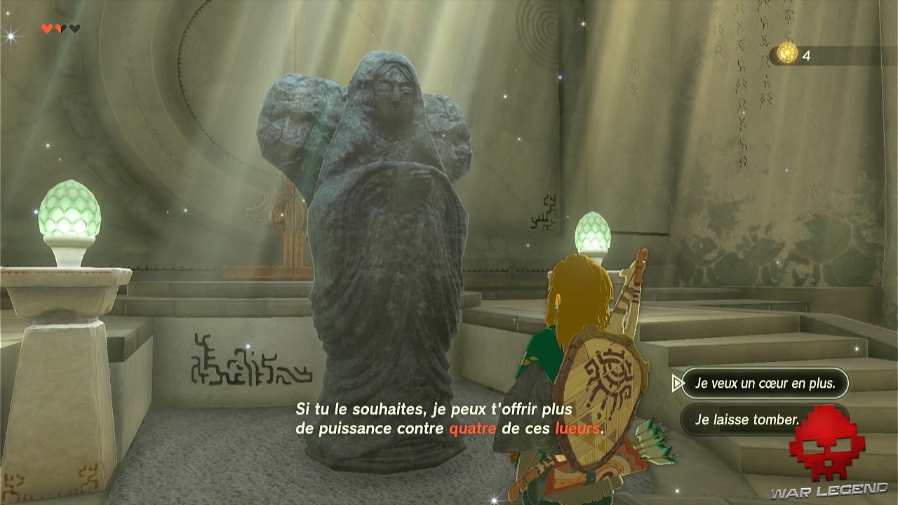 De retour dans le temple, examinez la statue de la déesse devant la porte du fond. Cette statue que vous pouvez retrouver un peu partout en Hyrule vous permet d’échanger 4 Lueurs Bienfaisantes contre un réceptacle de cœur ou d’endurance, augmentant les capacités de Link. Pour cette première, vous augmentez votre vie.