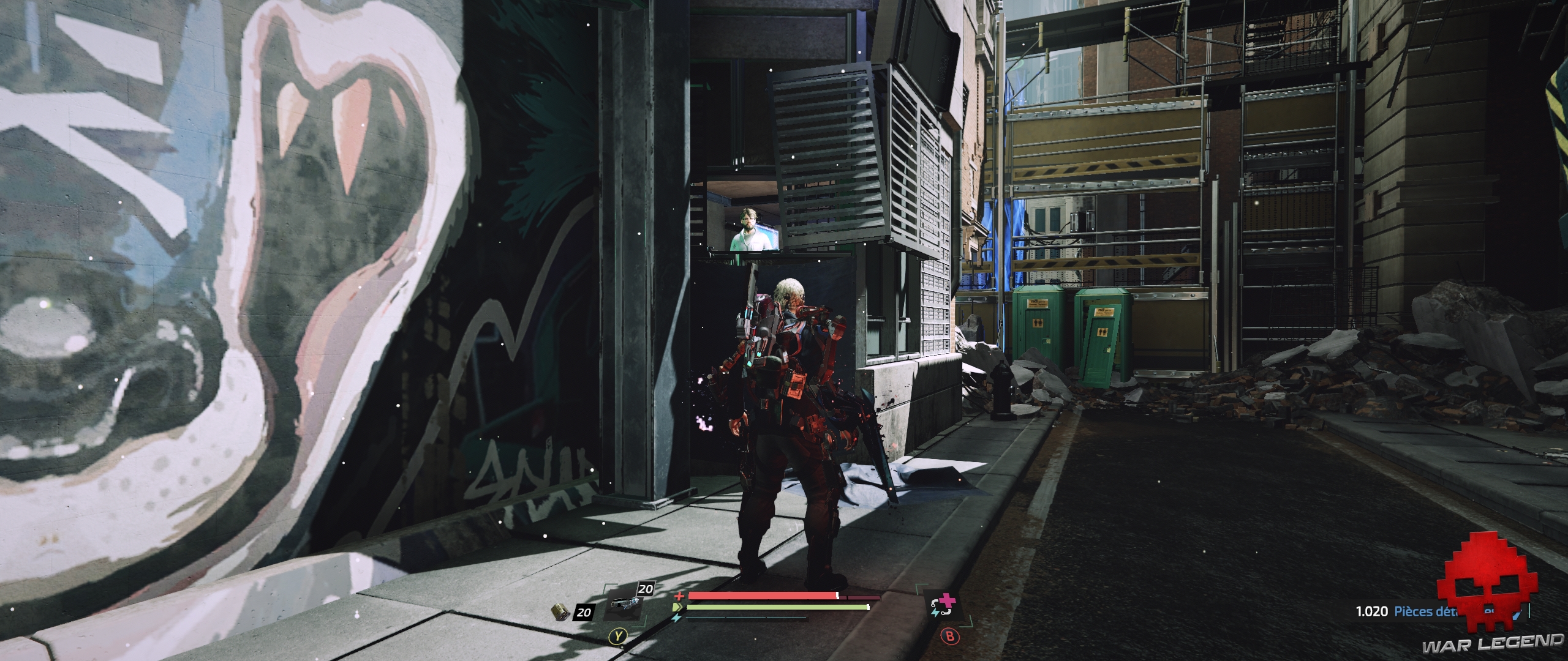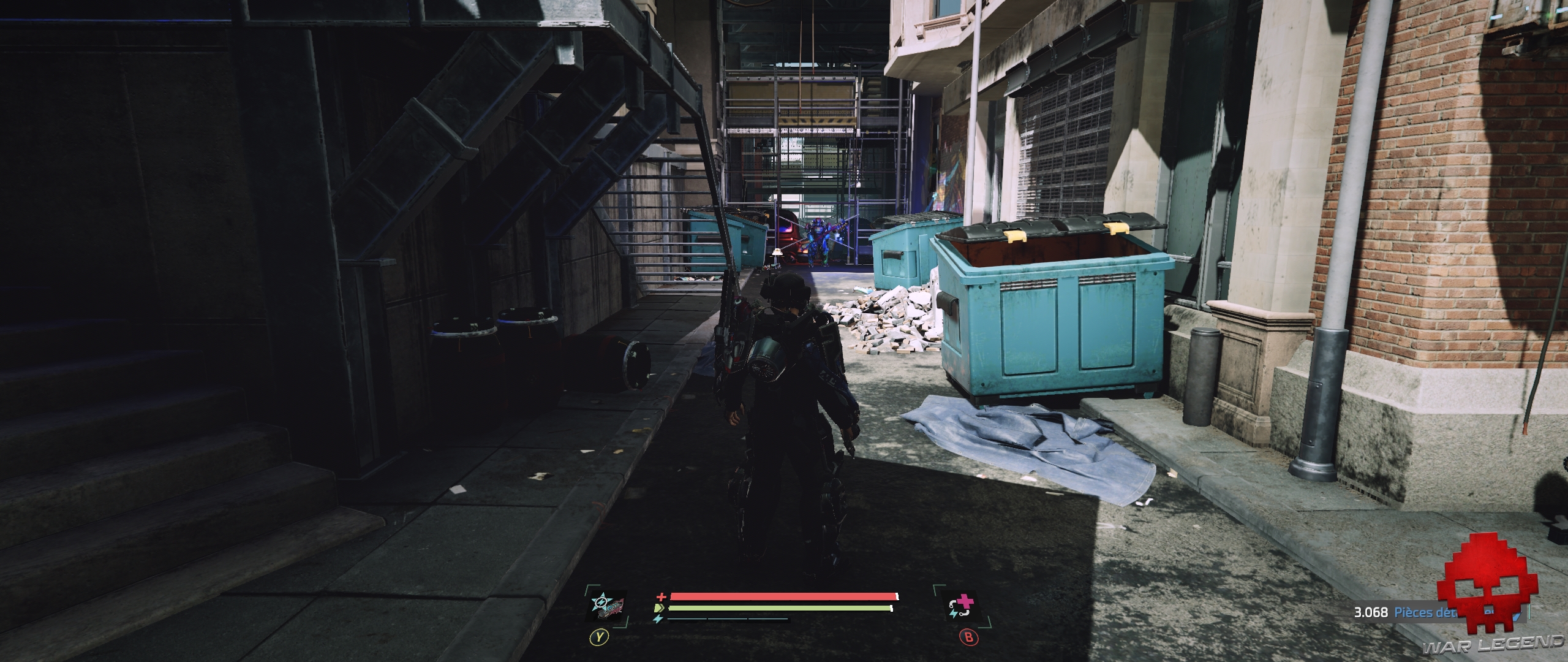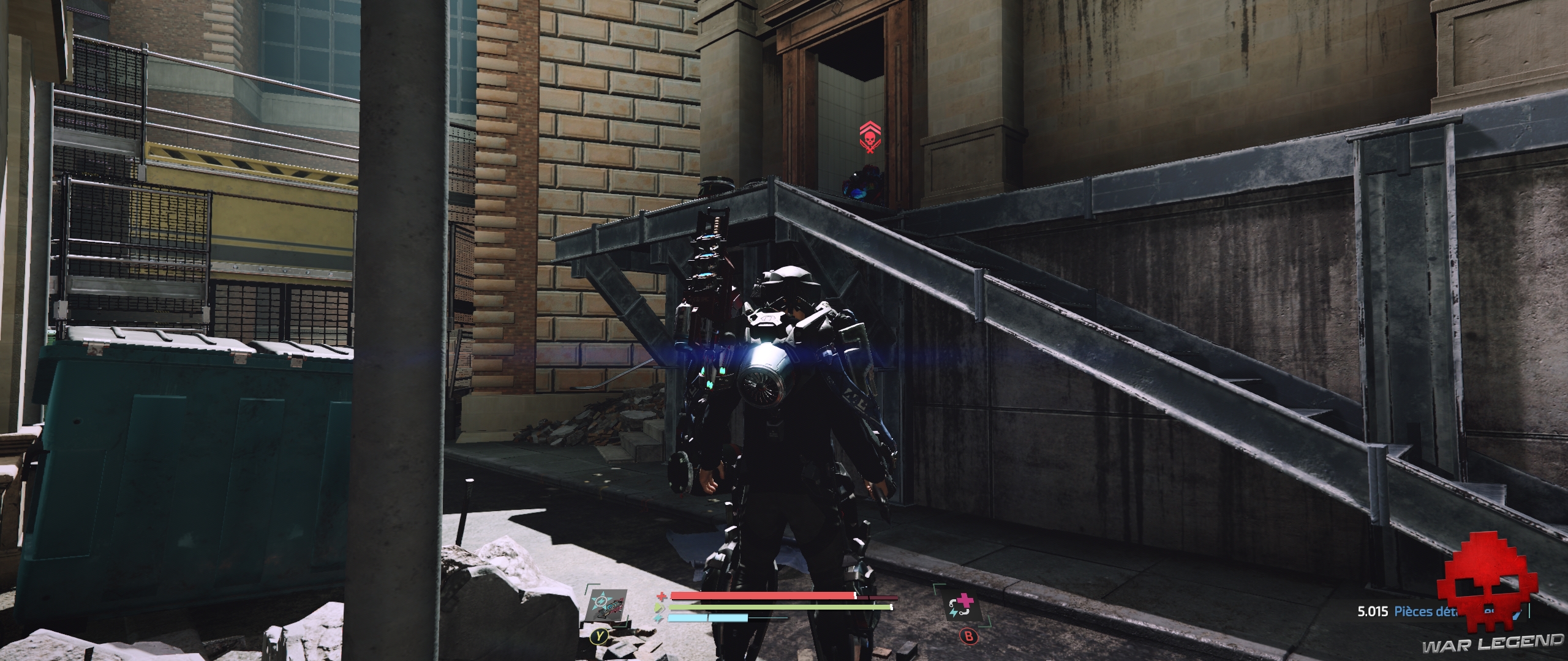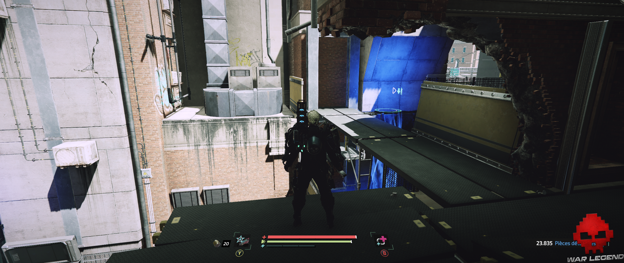 Sprintez le long de la passerelle afin d’éviter de vous faire toucher par les solides projectiles de la tourelle automatique plus loin. Passez sous celle-ci puis descendez une volée de marches pour aller tuer un ennemi. Enfin, revenez au niveau de la rue par la grille que vous avez déverrouillée plus tôt (si ce n’est pas fait, c’est l’occasion !).