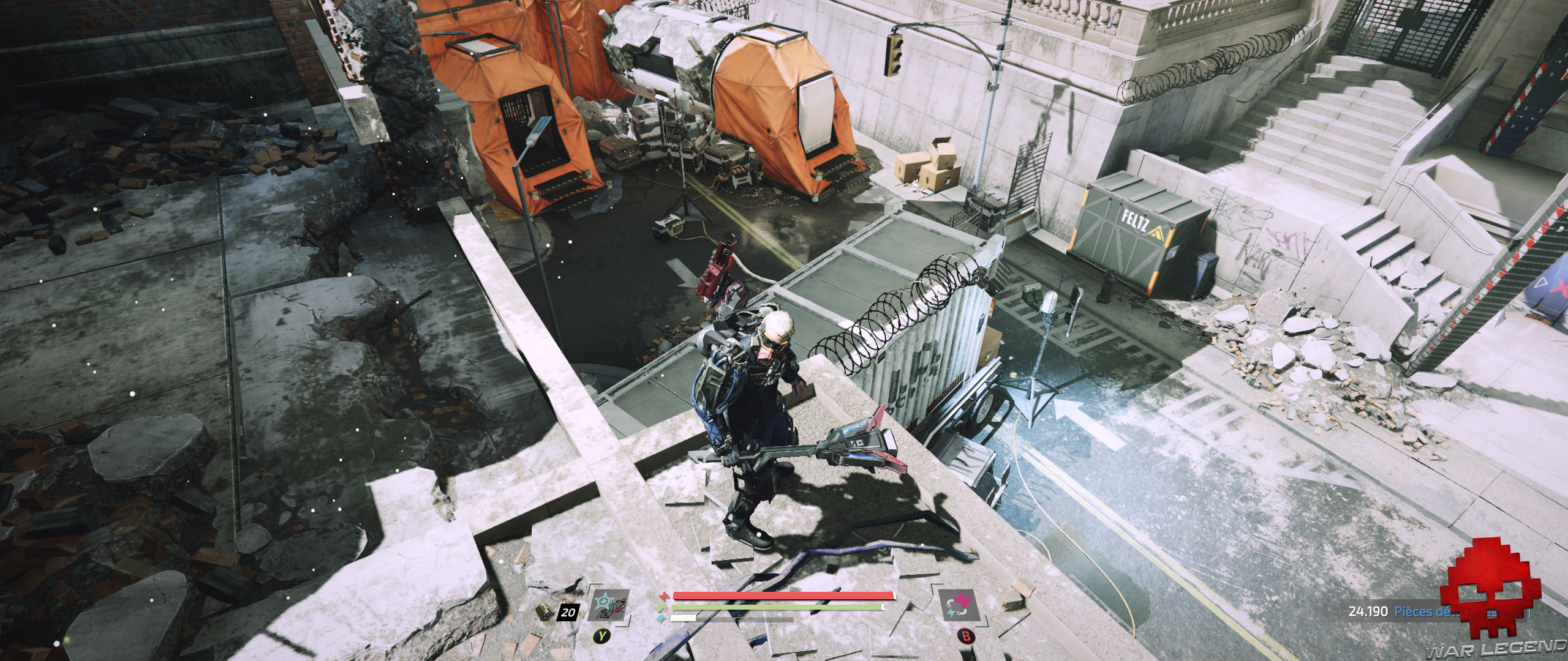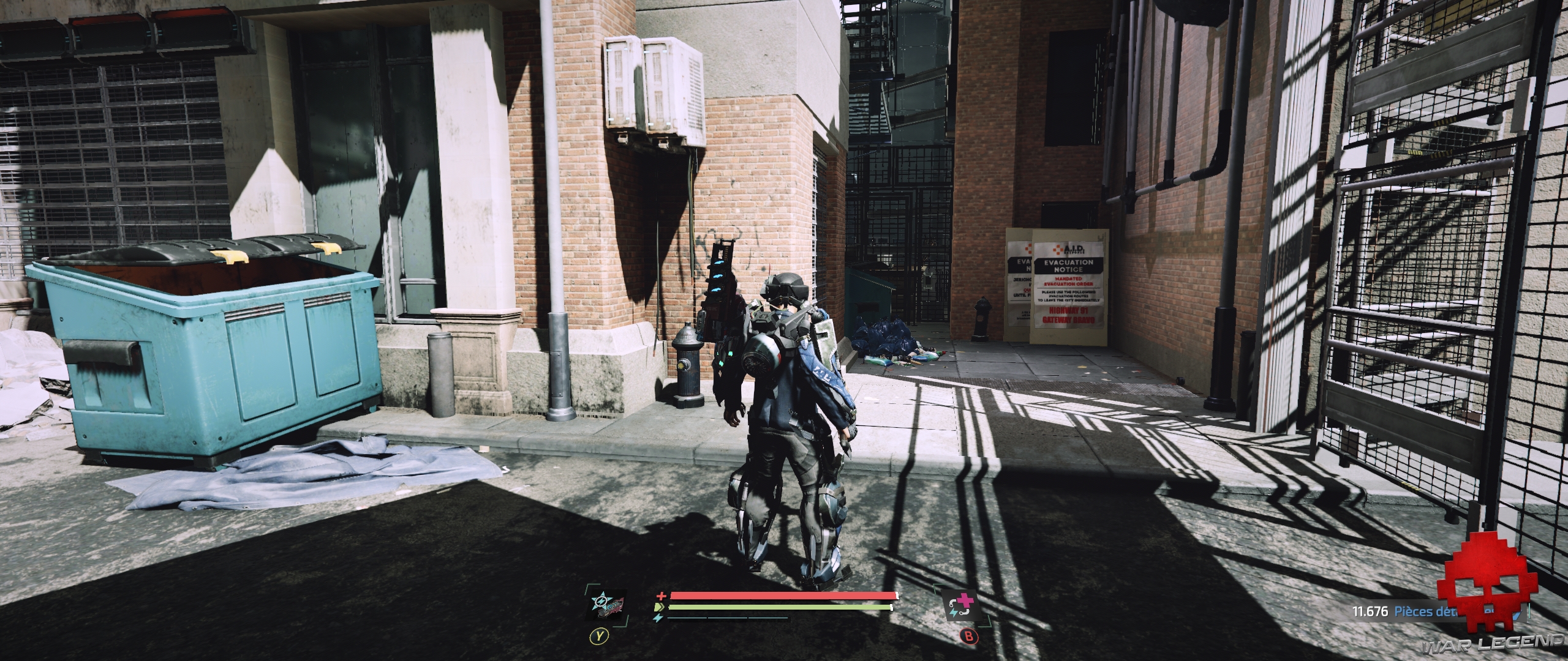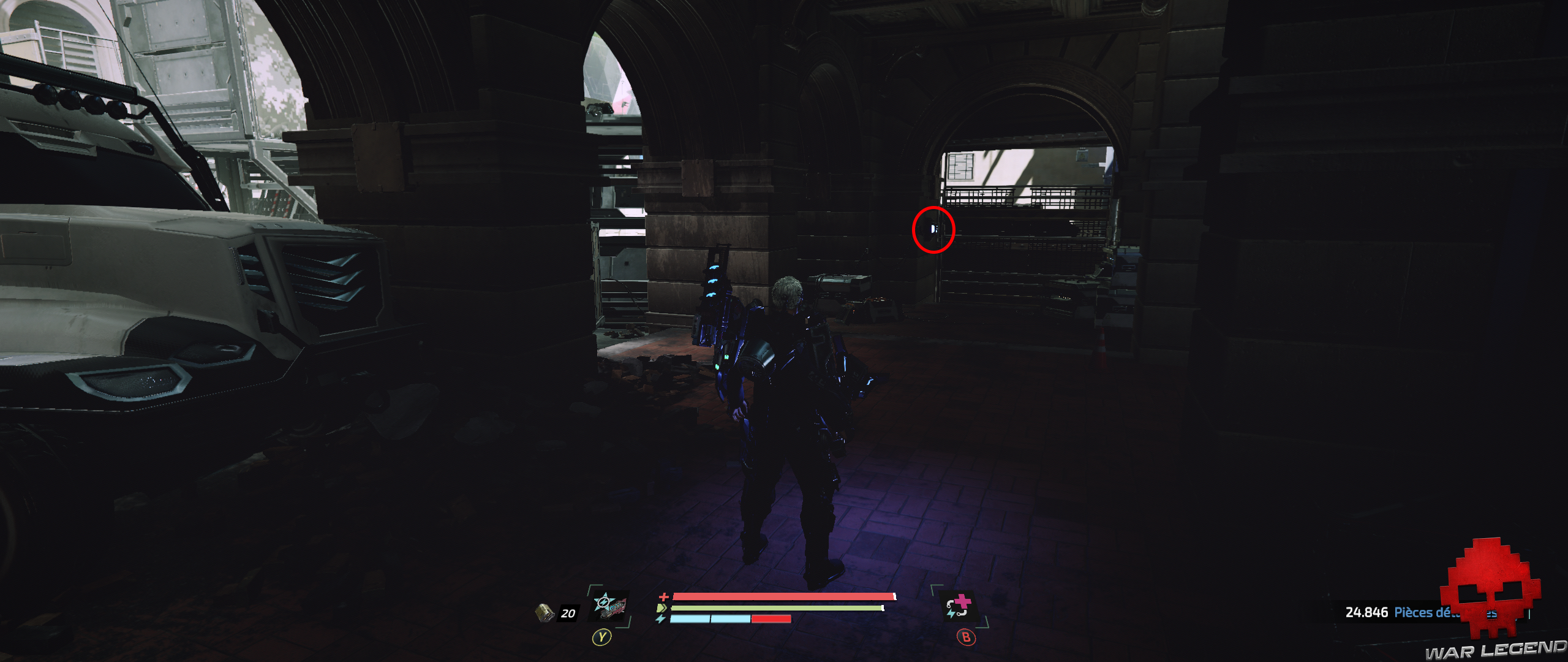 Sprintez le long de la passerelle afin d’éviter de vous faire toucher par les solides projectiles de la tourelle automatique plus loin. Passez sous celle-ci puis descendez une volée de marches pour aller tuer un ennemi. Enfin, revenez au niveau de la rue par la grille que vous avez déverrouillée plus tôt (si ce n’est pas fait, c’est l’occasion !).