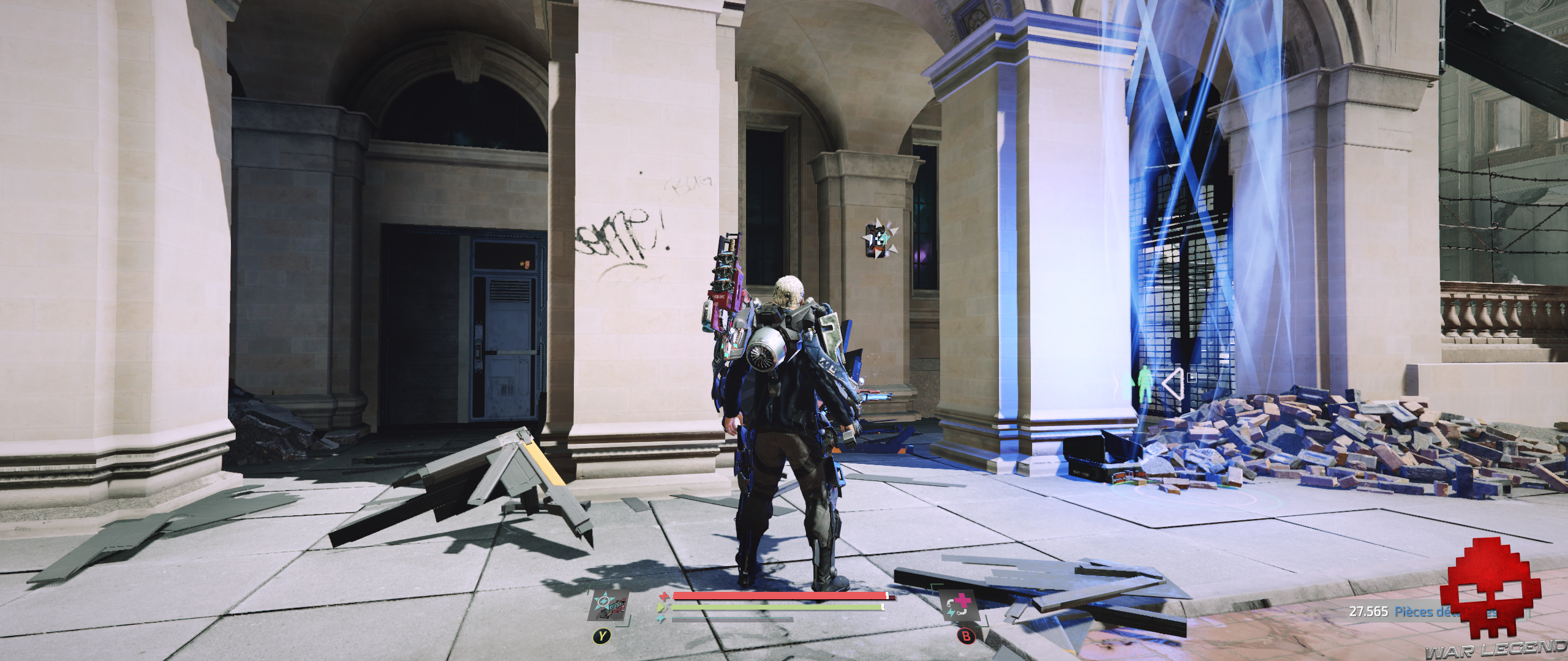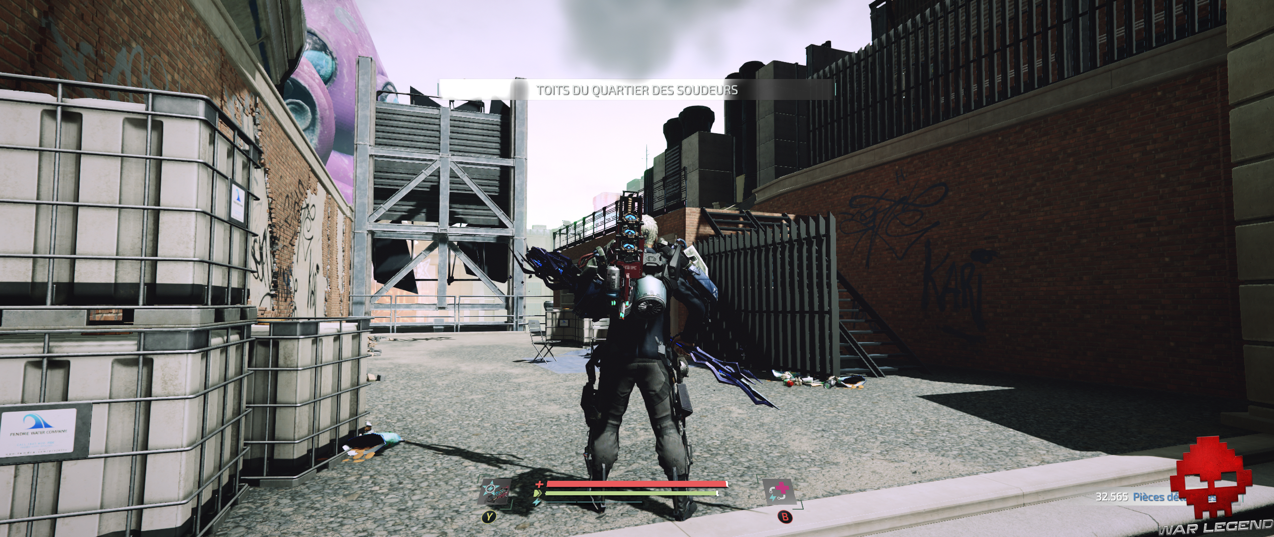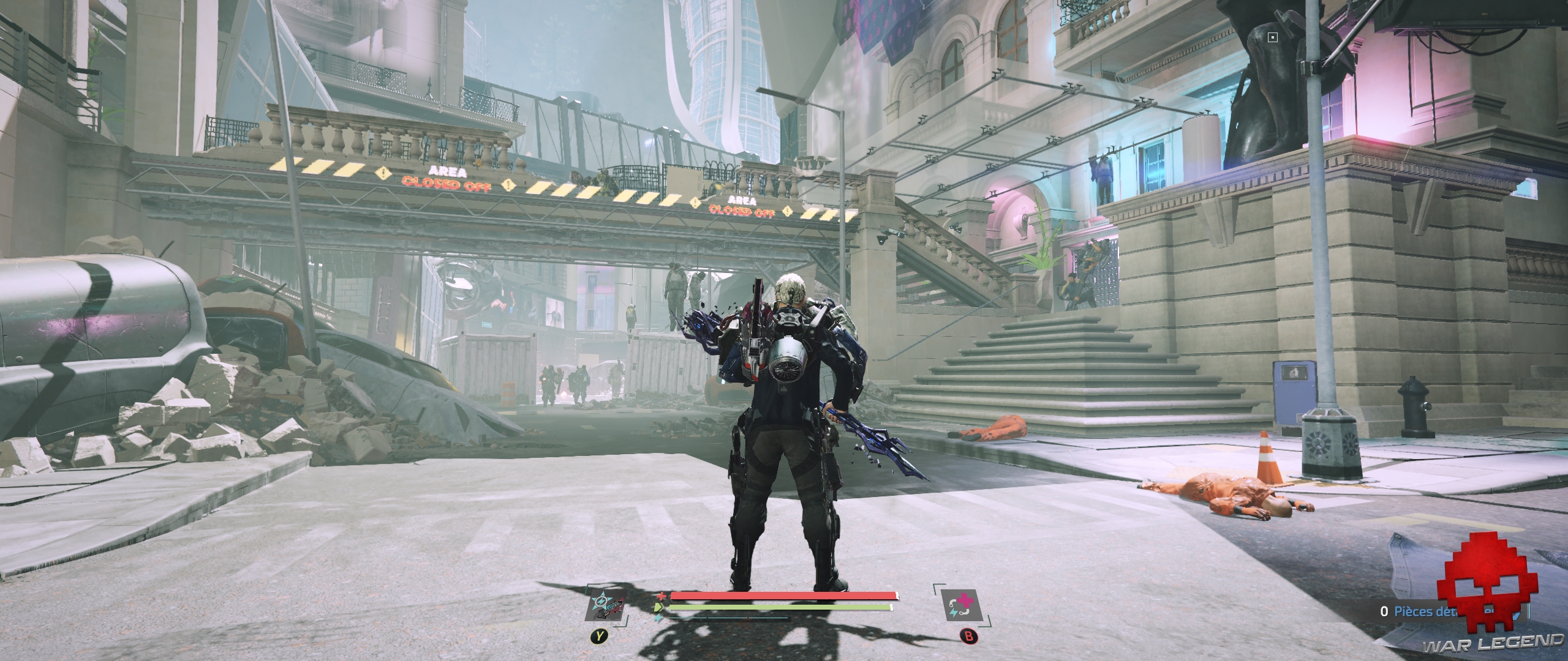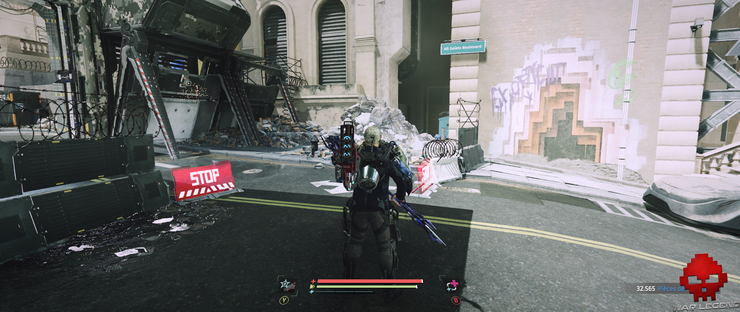 Sprintez le long de la passerelle afin d’éviter de vous faire toucher par les solides projectiles de la tourelle automatique plus loin. Passez sous celle-ci puis descendez une volée de marches pour aller tuer un ennemi. Enfin, revenez au niveau de la rue par la grille que vous avez déverrouillée plus tôt (si ce n’est pas fait, c’est l’occasion !).