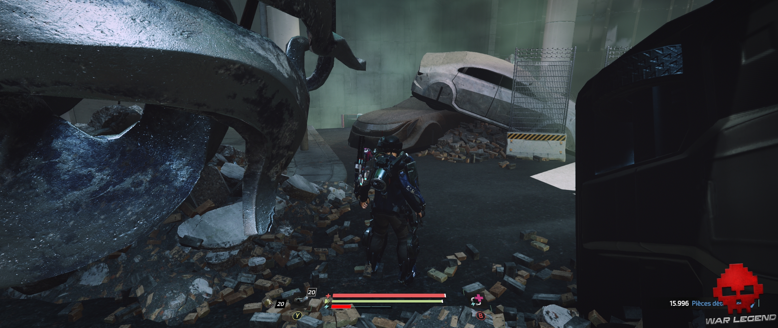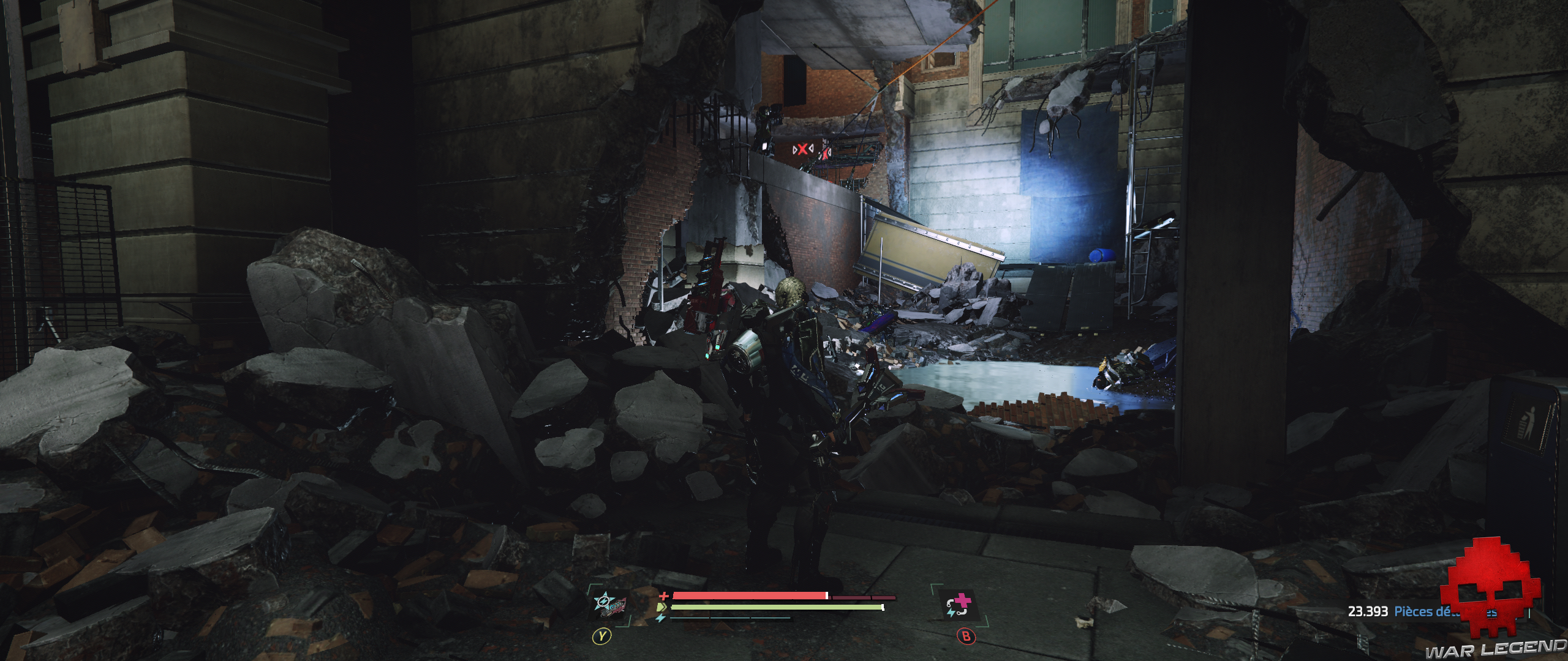 Placez-vous en haut des escaliers et prenez par surprise le Scarab à genoux derrière sa tourelle. Il sera bientôt rejoint par son pote un peu plus loin. Plus de dents à déchausser. Longez ensuite la gauche. Un ennemi risque de vous sauter dessus si vous tombez au mauvais moment de sa patrouille. Maintenez bien la gauche pour passer à gauche de voitures accidentées. Montez l’escalier un peu plus loin pour tuer un tireur embusqué. Derrière le coin de mur, un Adrénaliseur de batterie.