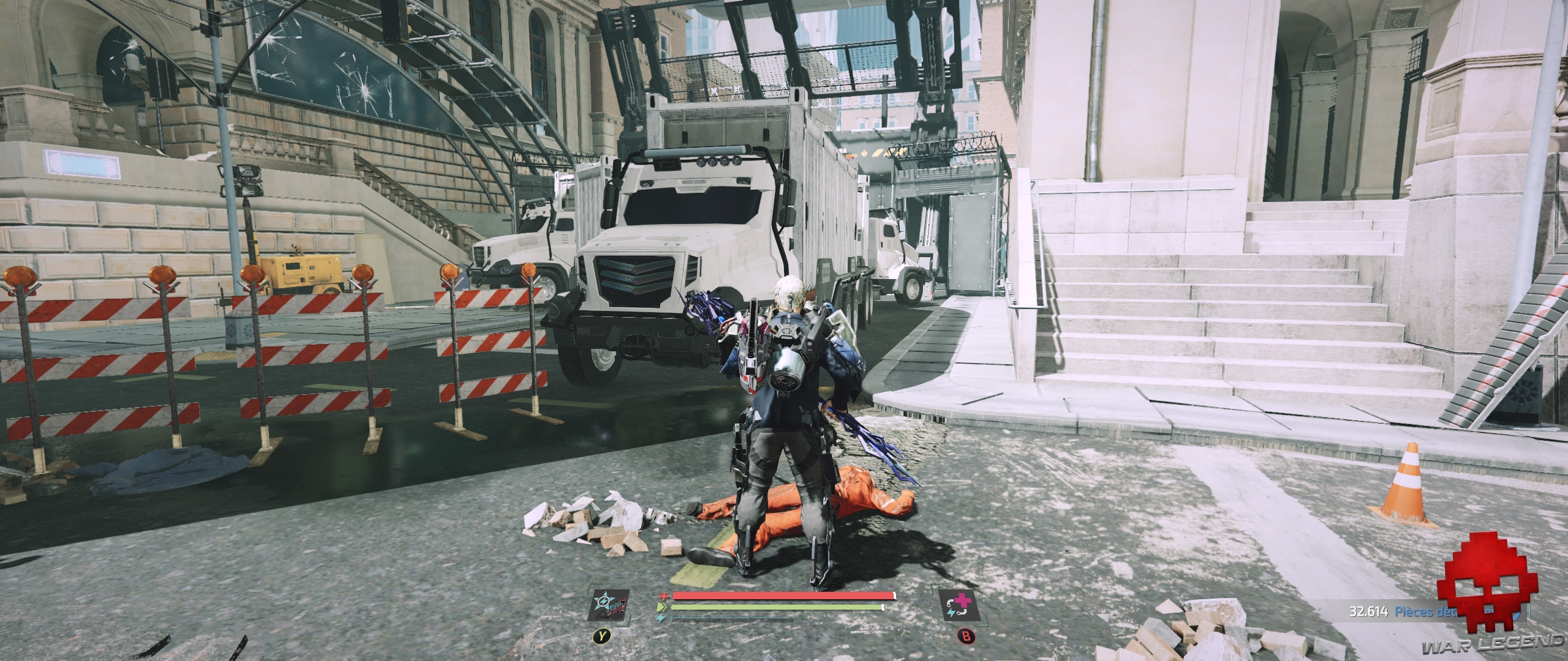 Allez zigouiller le robot de police sur la gauche, visez ses pinces pour récupérer les Électropinces du J.C.P.D. Ensuite, regardez à côté de la tente orange pour trouver dans 1 coffre 1 Gros tas de ferraille recyclable.