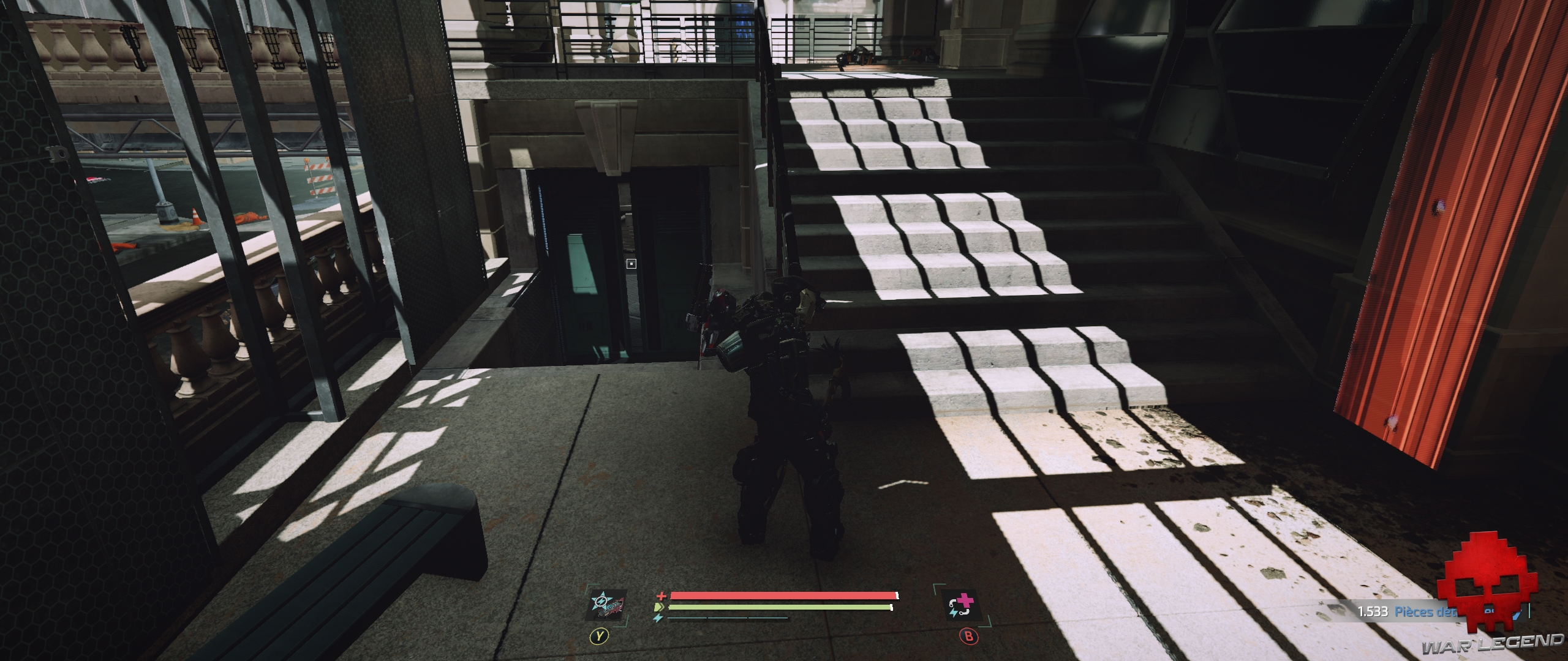 Tournez à gauche et allez ouvrir un coffre. Il contient des Stabilisateurs inflexibles. Poursuivez votre route et montez les escaliers.
