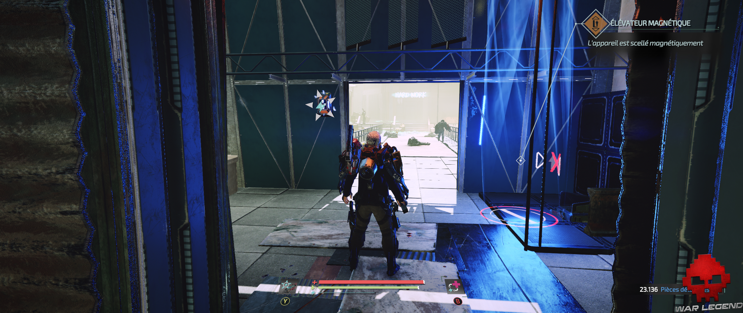 Remontez les escaliers et avancez sur le chemin pour aller tuer un nouveau prisonnier. Ensuite regardez sur la droite pour trouver un ascenseur magnétique. Commencez par aller fureter tout droit pour trouver 1 Petit tas de ferraille recyclable puis prenez l’ascenseur.