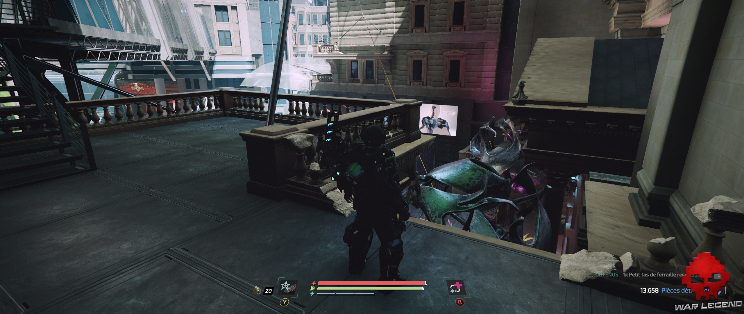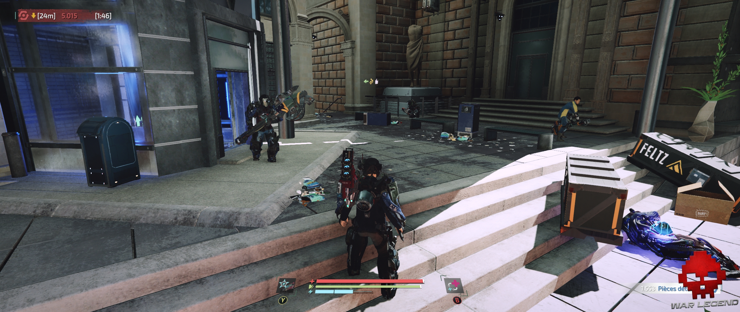 Tuez le glandu en haut des marches (vous pouvez récupérer son Broyeur renforcé) et brisez les caisses au fond un peu plus loin pour obtenir 1 Gros tas de ferraille recyclé. Retournez-vous et traversez le pont en zigouillant l’ennemi au passage (son arme : Nom de code : Moonlight). Faites bien attention, car il y a un tireur d’élite et une tourelle en poste en hauteur en face du pont.