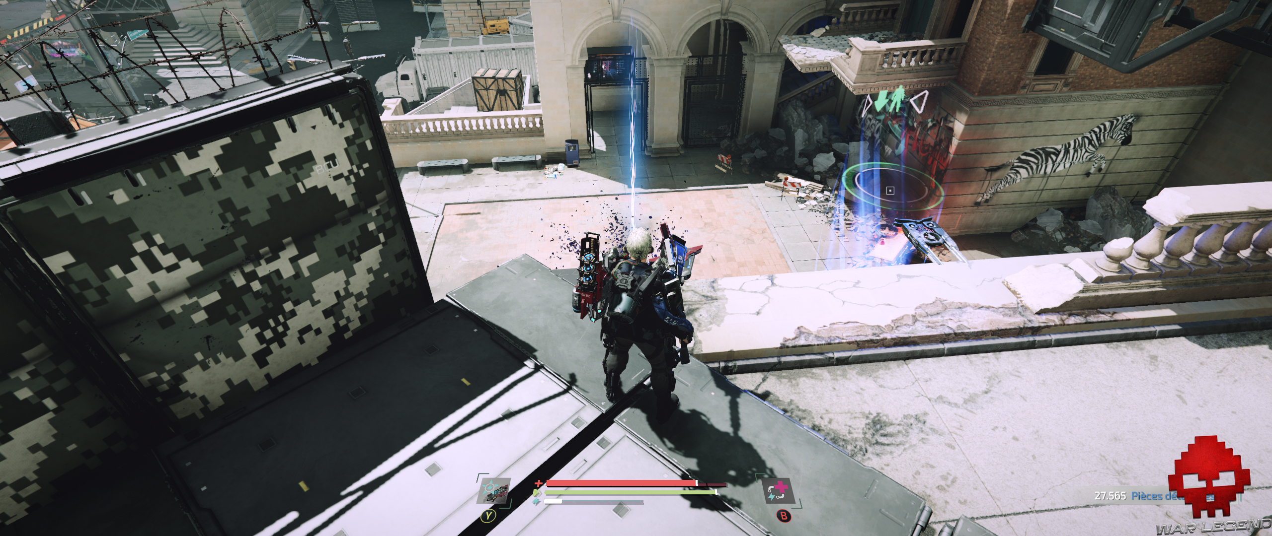 Cela va attirer l’un des 2 gardes à l’entrée. Éliminez-le puis passez à son copain. Enfin, prenez l’ascenseur magnétique et montez les escaliers. Préparez-vous à descendre le prochain ascenseur magnétique, mais avant toute chose : mettez-vous à couvert derrière le panneau à proximité et regardez de l’autre côté de la rue pour apercevoir un tireur d’élite. S’il ne vous a pas encore repéré, sortez de votre cachette et laissez son laser se porter dans votre direction, ensuite remettez-vous à couvert. Il va tirer quelques fois puis utiliser la tyrolienne pour vous rejoindre.
