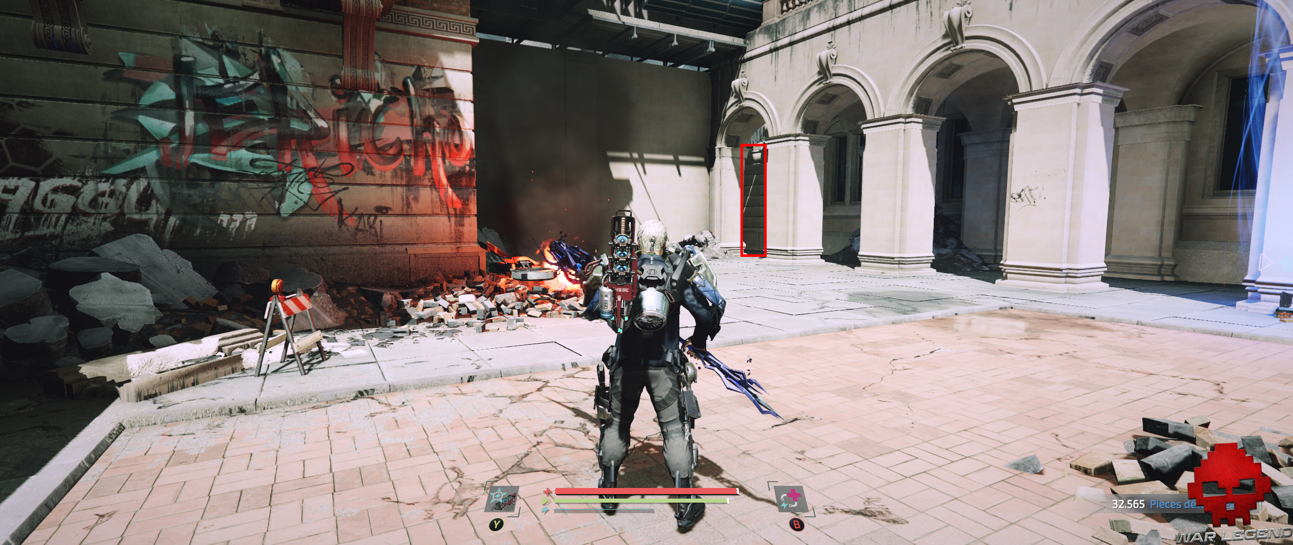 Vous pouvez attendre qu’ils s’éloignent ou les affronter (dans ce cas-là, n’oubliez pas votre drone et ses capacités de zone). Avancez-vous et esquivez aussitôt : 2 robots explosifs attendent de vous sauter dessus. Zigouillez les 3 ennemis restants et fouillez le conteneur sur la droite qui contient 1 Petit tas de ferraille recyclable. Revenez maintenant sur vos pas pour entrer dans le grand bâtiment.
