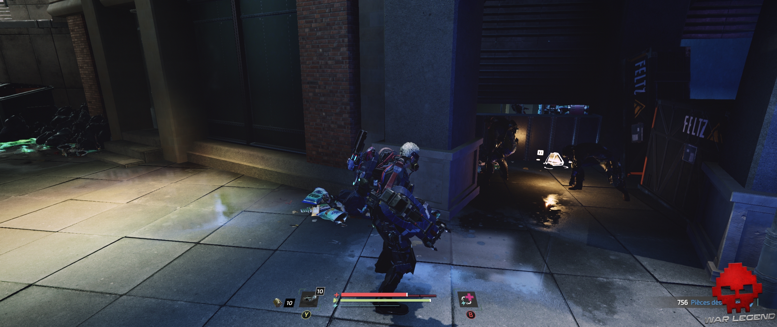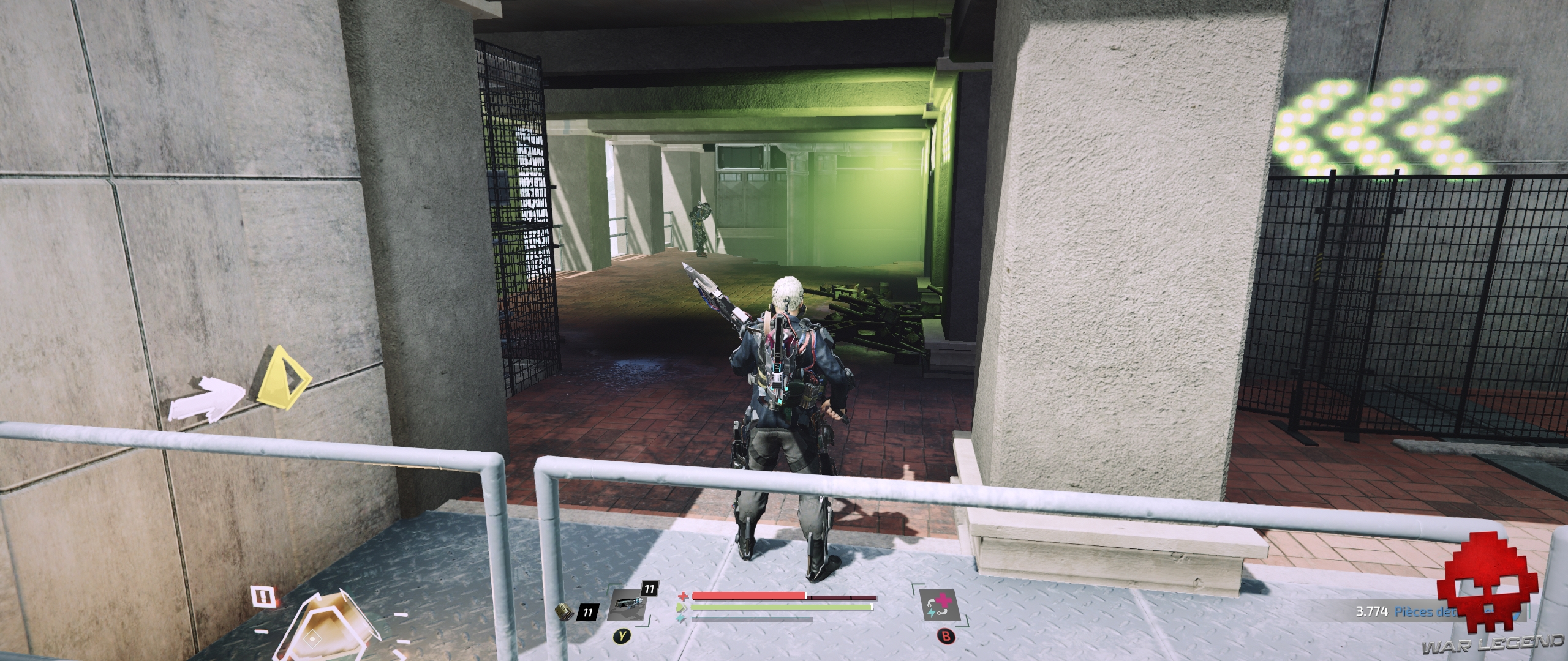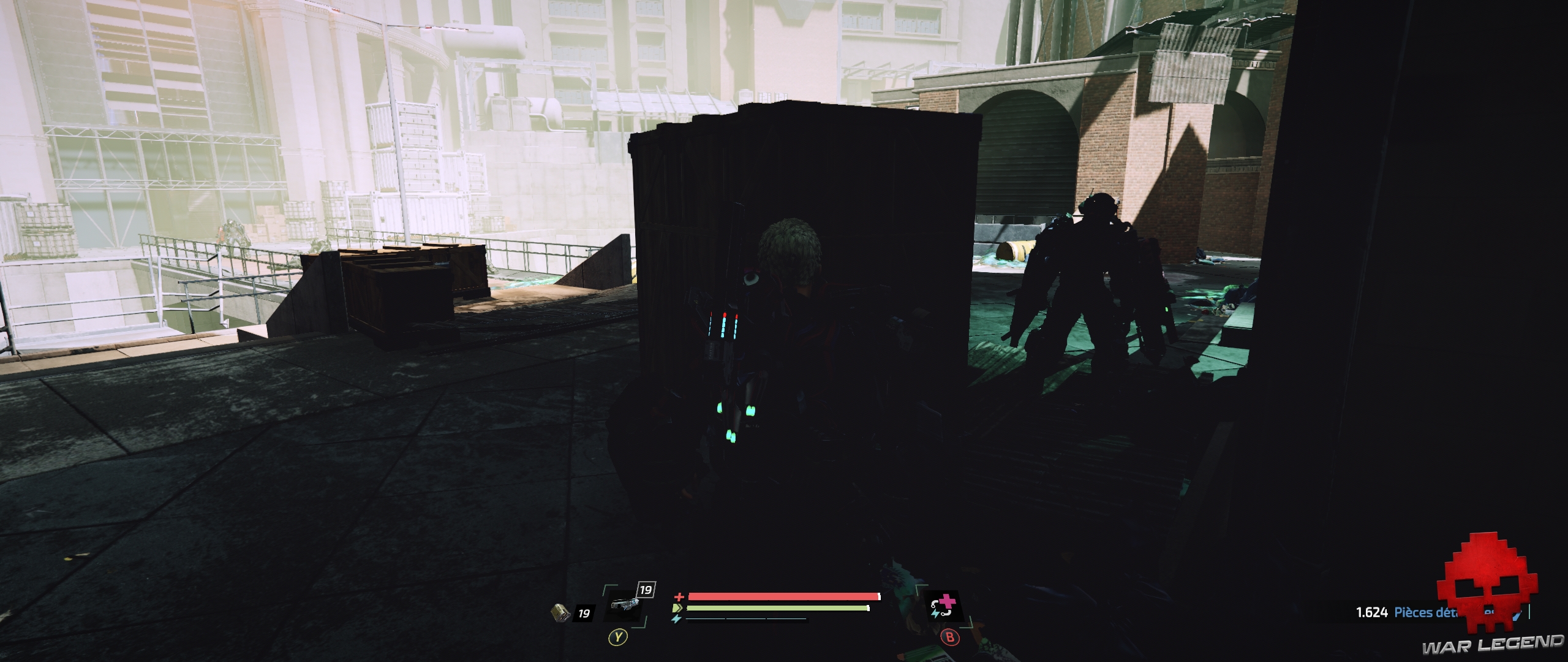 Descendez les escaliers et tuez l’ennemi au bouclier et prenez le passage couvert à gauche (avant cela, si vous le souhaitez, dans le petit couloir sur la droite juste avant l’espace assez ouvert, il y a un tireur avec 1 Petit tas de ferraille recyclable, vous pouvez attirer le tireur en vous plantant devant le passage, puis en vous mettant à couvert derrière le mur de briques). Un peu plus loin sur la gauche, faites attention, il y a bien 2 ennemis qui vous attendent (l’un des deux manie un bâton MG Negotiator). Ne vous avancez pas trop, car un 3e peut surgir du passage sur votre droite.