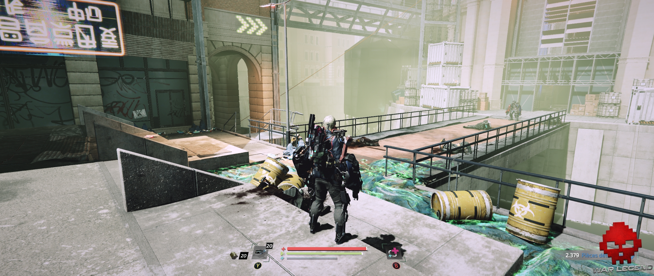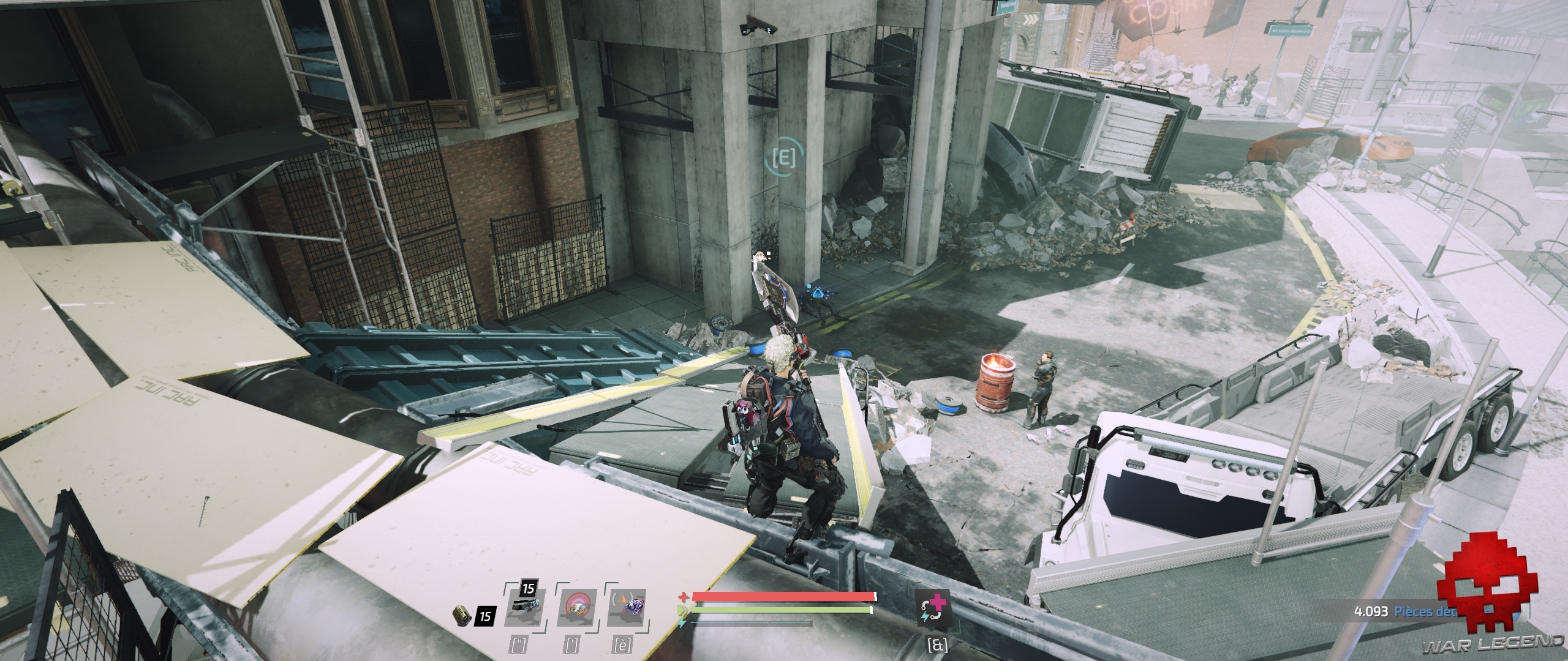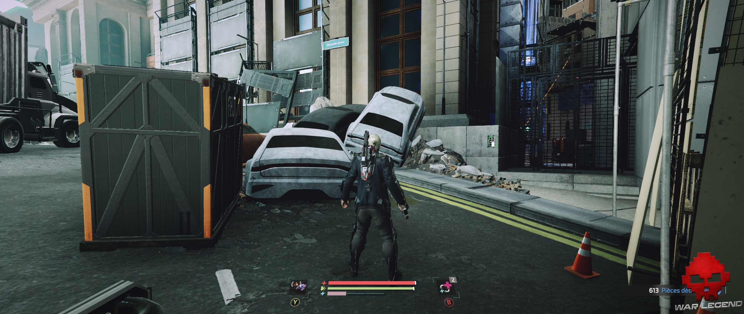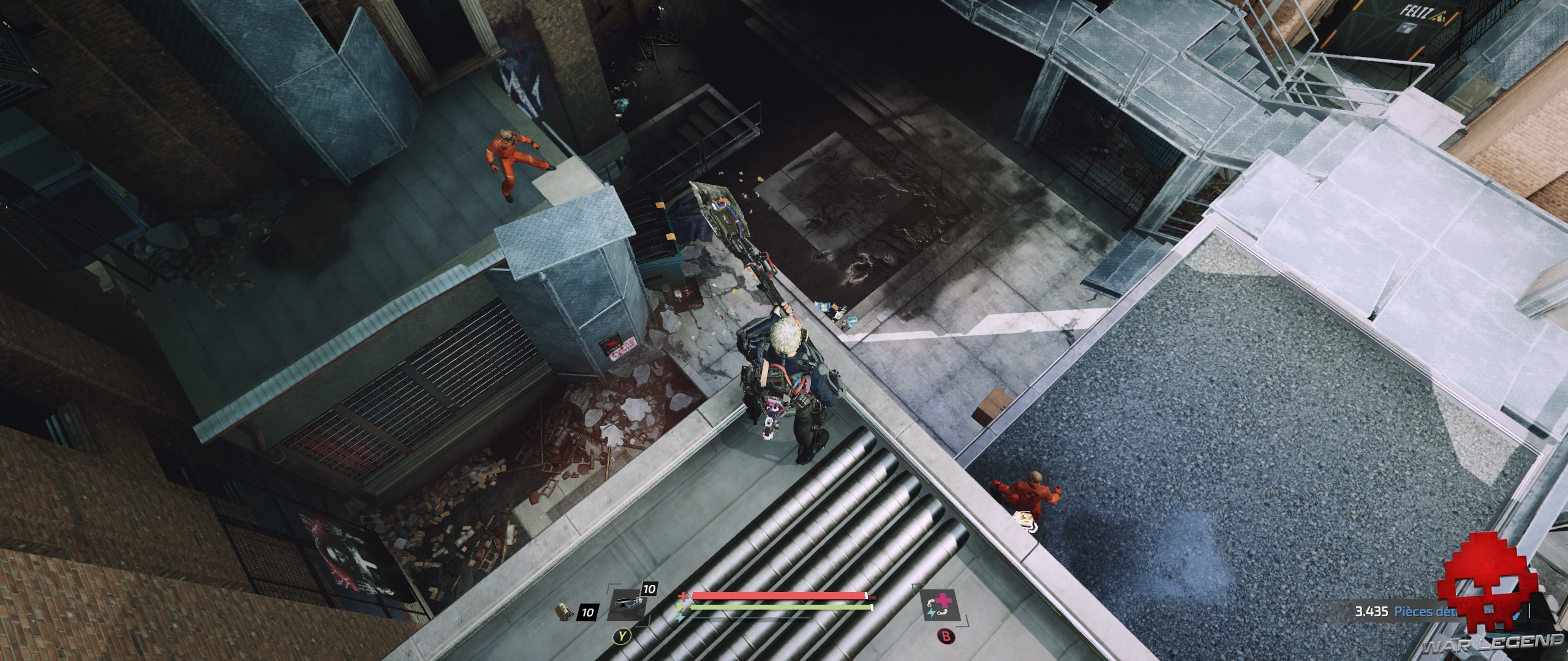 Visez son bras armé pour récupérer un Allume-feu de contrebande. Faites attention à ses attaques et cocktails molotovs qui risquent de vous enflammer. Remontez ensuite la rue, tuez le prisonnier qui vous lance des briques puis passez aux 2 autres en train de fouiller des corps : ne vous avancez pas trop, un 3e larron guette derrière les pneus sur la passerelle en haut à gauche, utilisez votre drone pour tirer sur les pillards et les attirer. Profitez de votre drone pour carrément en éliminer un.