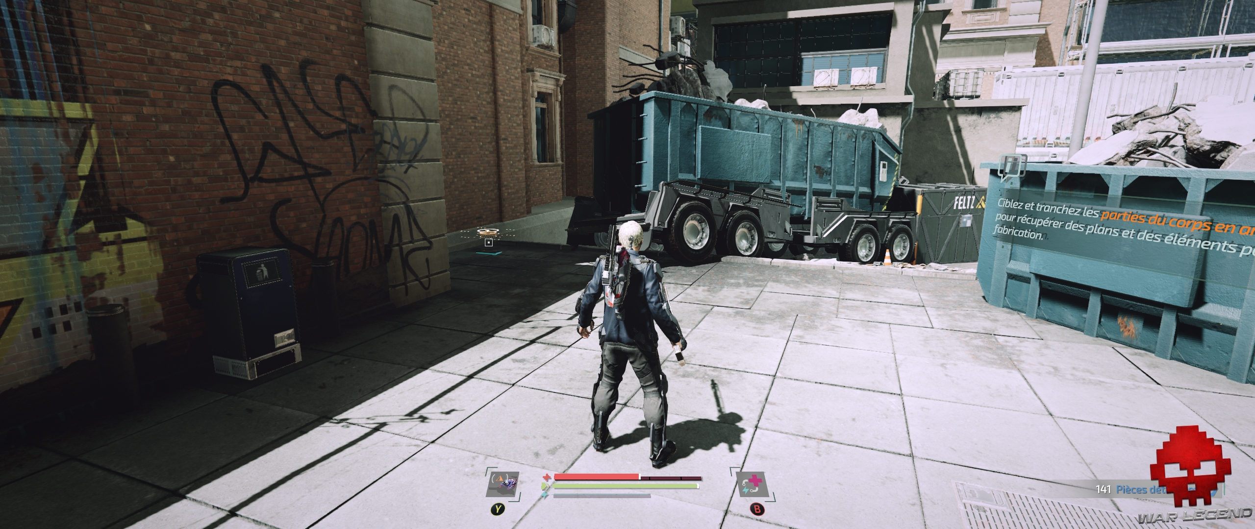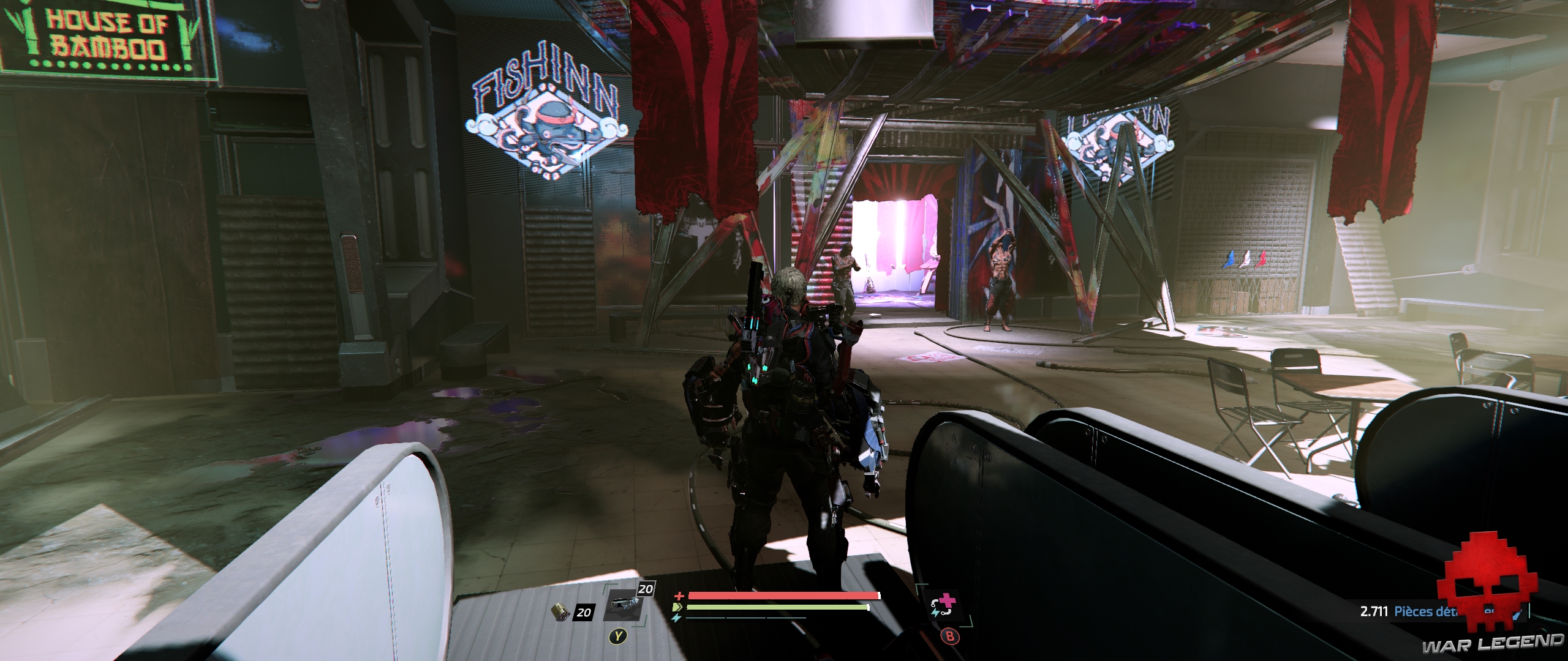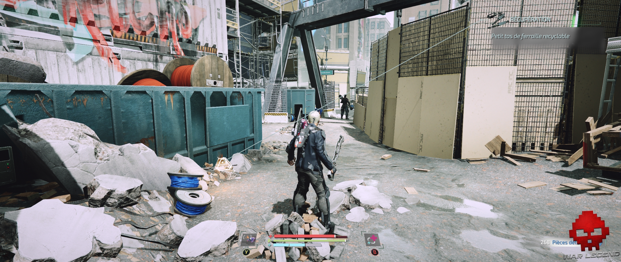 Sautez sur l’ennemi de droite et tuez l’autre grâce à votre drone. Le premier vous donne l’implant Redirecteur d’agression physique. Descendez les escaliers, brisez la caisse pour obtenir 1 Petit tas de ferraille recyclable, tuez un autre ennemi puis récupérez 1 autre Petit tas de ferraille recyclable, à droite de la série de piliers gris.