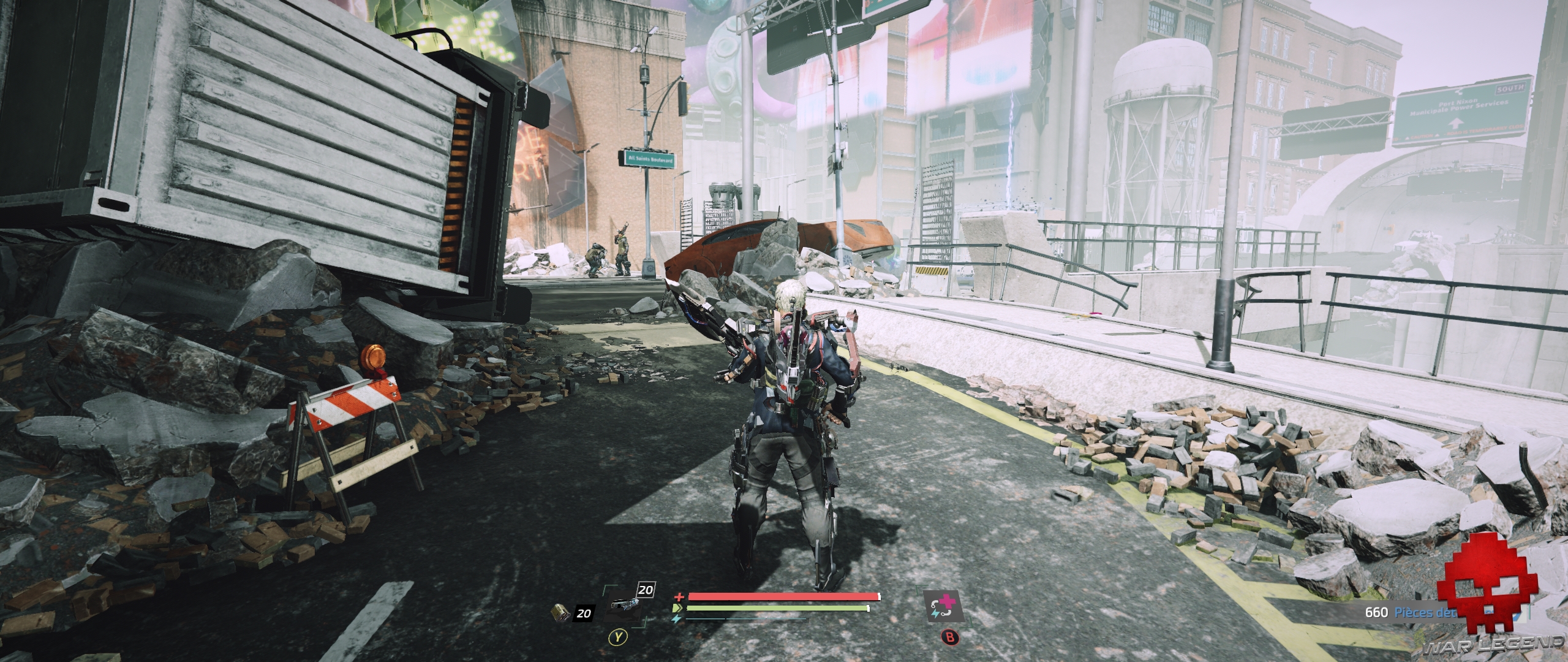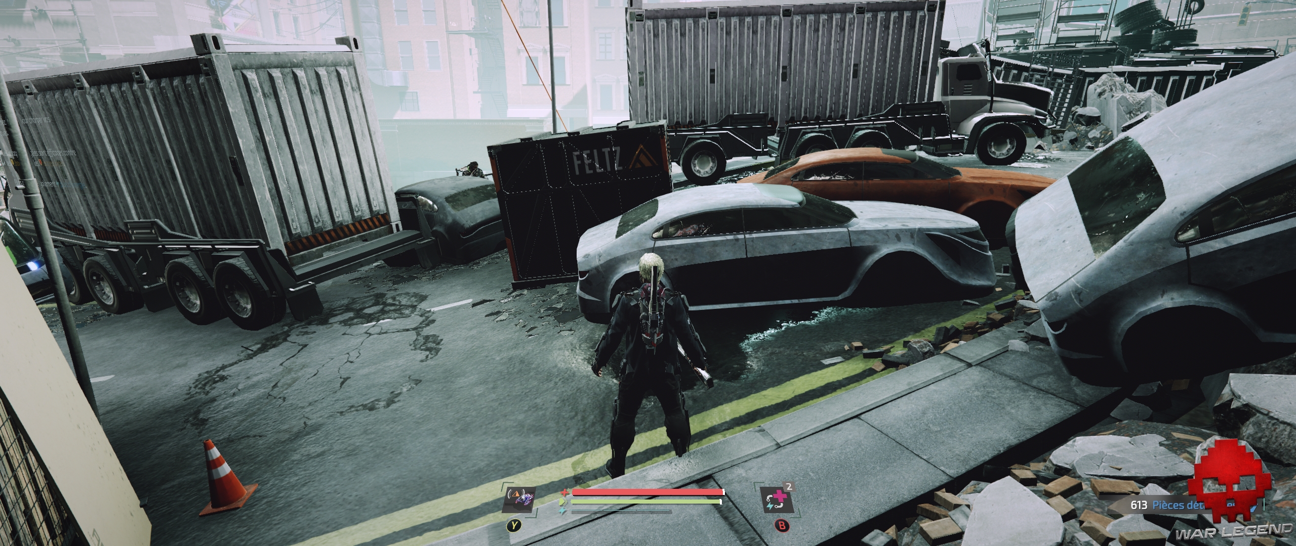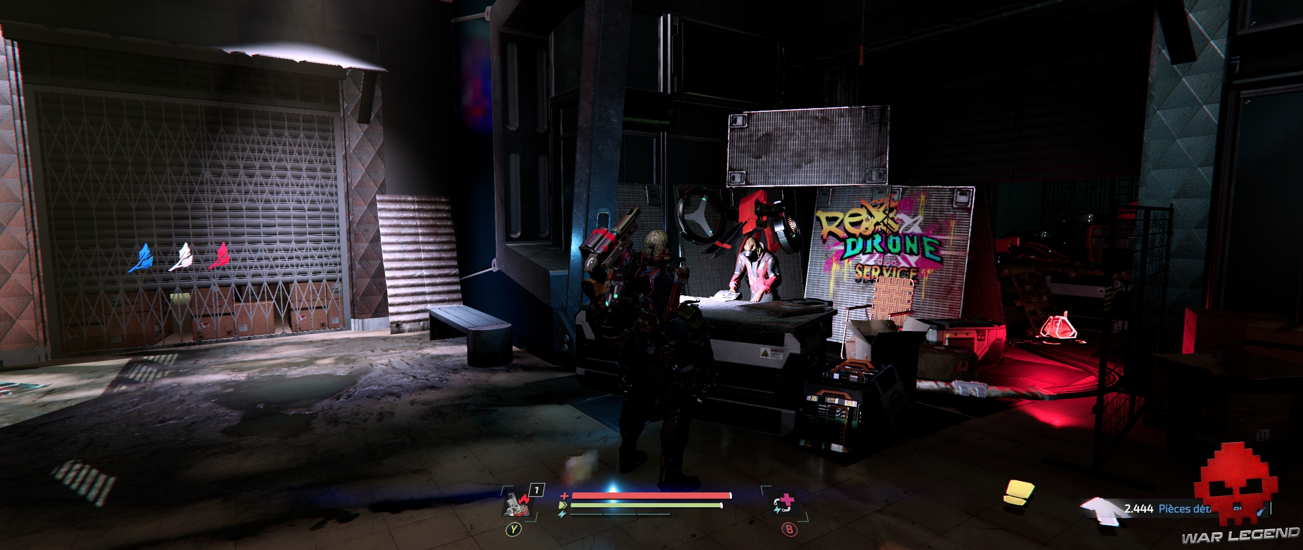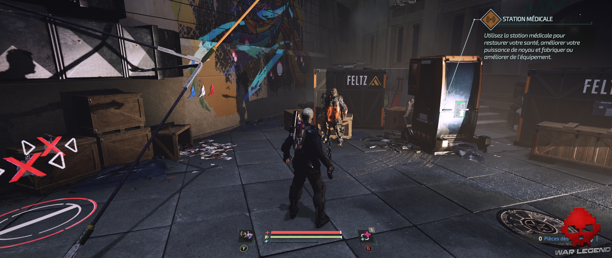 Commencez par descendre au niveau du brasero, regardez à gauche et prenez 1 Petit tas de ferraille recyclable à proximité, puis allez encore à gauche et ouvrez un coffre contenant 1 Gros tas de ferraille recyclable. Revenez au brasero et ouvrez le raccourci sur la droite. Ensuite, remontez par où vous êtes venu et suivez le chemin (regardez autour de vous pour prendrez au passage le drone Bannière W-102) jusqu’à un ascenseur magnétique, autre raccourci vers la station médicale.