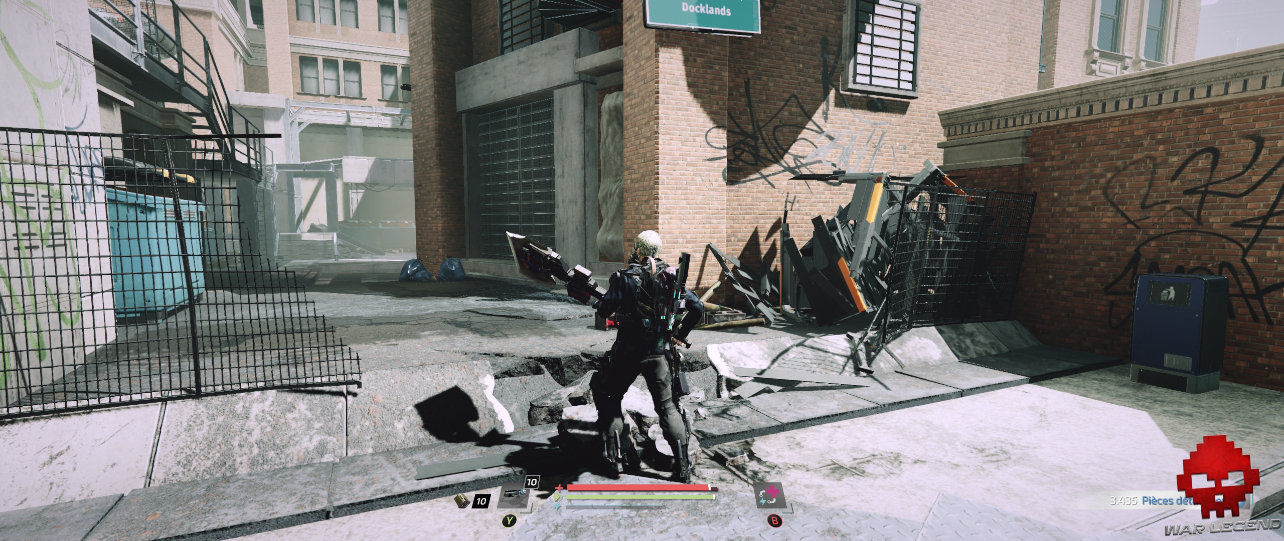 Note : vous pouvez prendre le pont en face de la porte du J.C.P.D. Toutefois sachez qu’au bout se trouvent 2 policiers particulièrement vénères qui peuvent vous one-shot au niveau où vous êtes. Si vous décidez d’y aller tout de même, je vous suggère d’en dégommer un au drone. Si vous pouvez couper un bras, vous récupérez l’arme « Autorité » Type-4 A.I.D. Vous trouverez aussi 1 Tas de ferraille rouillé recyclable et, sur la droite, un raccourci menant au-delà du pont de la prochaine photo. Il est aussi possible d’accéder à Port Nixon, prochaine zone du jeu, néanmoins un espace très fermé tant que vous n’êtes pas en possession du grappin de force, pour y obtenir l’implant Ramasseur surénal, qui restaure 50 points d’endurance par kill, ce qui est très intéressant. Il y a aussi un enregistrement audio : Havre en sûreté. Lorsque vous débloquerez le grappin de force, vous pourrez revenir ici et débloquer le raccourci vers l’une des ultimes zones de Port Nixon.
