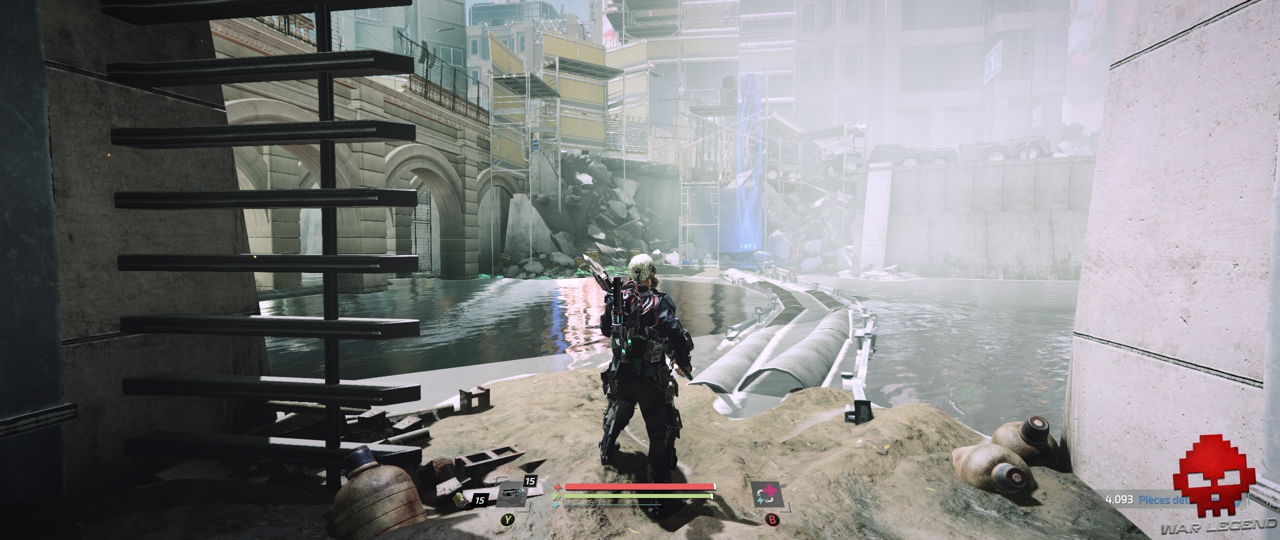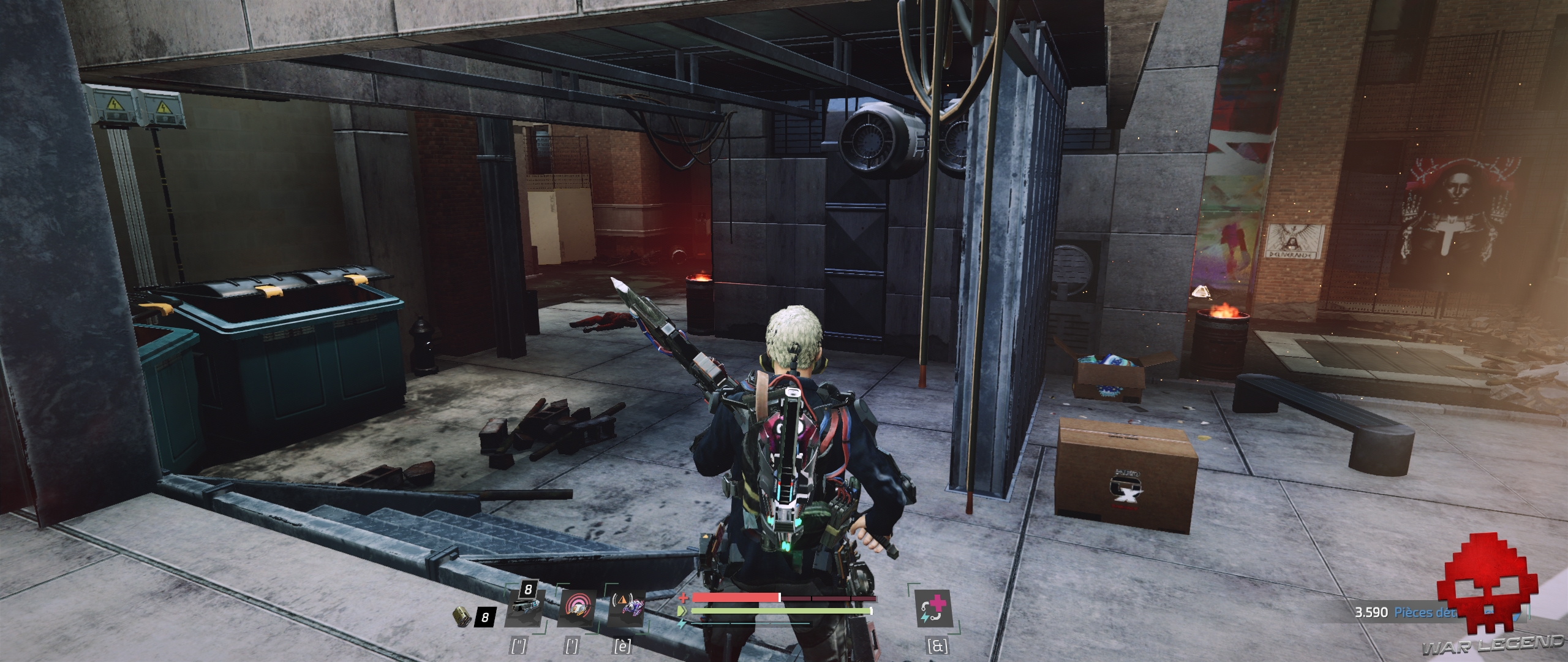 Passé le pont, brisez la caisse à droite, cassez celle sous les escaliers un peu plus loin (Vous trouvez 1 Gros tas de ferraille recyclable) et montez ces derniers.