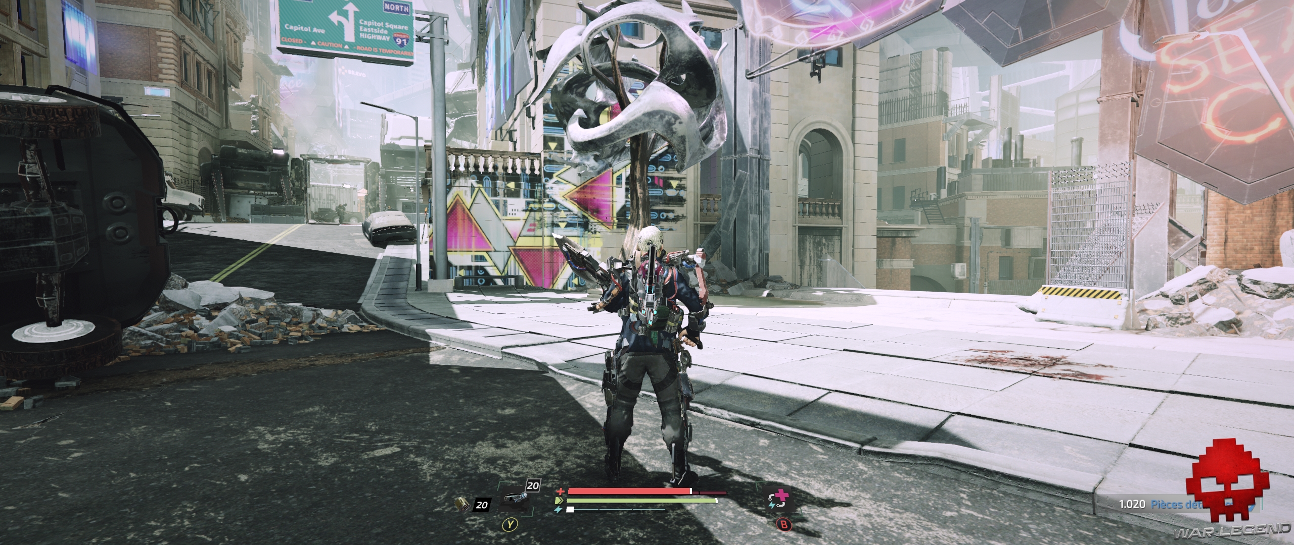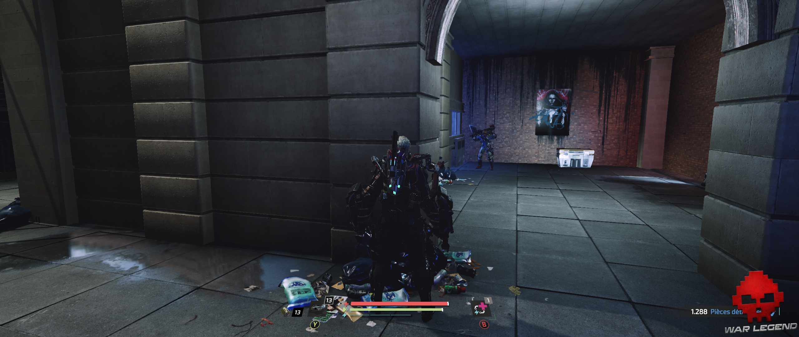 Prenez l’ascenseur, attendez que l’ennemi qui patrouille s’éloigne et éliminez le tireur qui vous tourne le dos (tranchez son bras armé pour récupérer un module de tir pour le drone : Fusil Klokonov R-47). Ensuite, tuez le patrouilleur puis approchez-vous de l’anomalie bleutée sur le pont brisé. Ouvrez ensuite le coffre qui apparaît pour obtenir l’arme Griffes métamorphiques. Revenez sur vos pas pour faire face à deux directions.