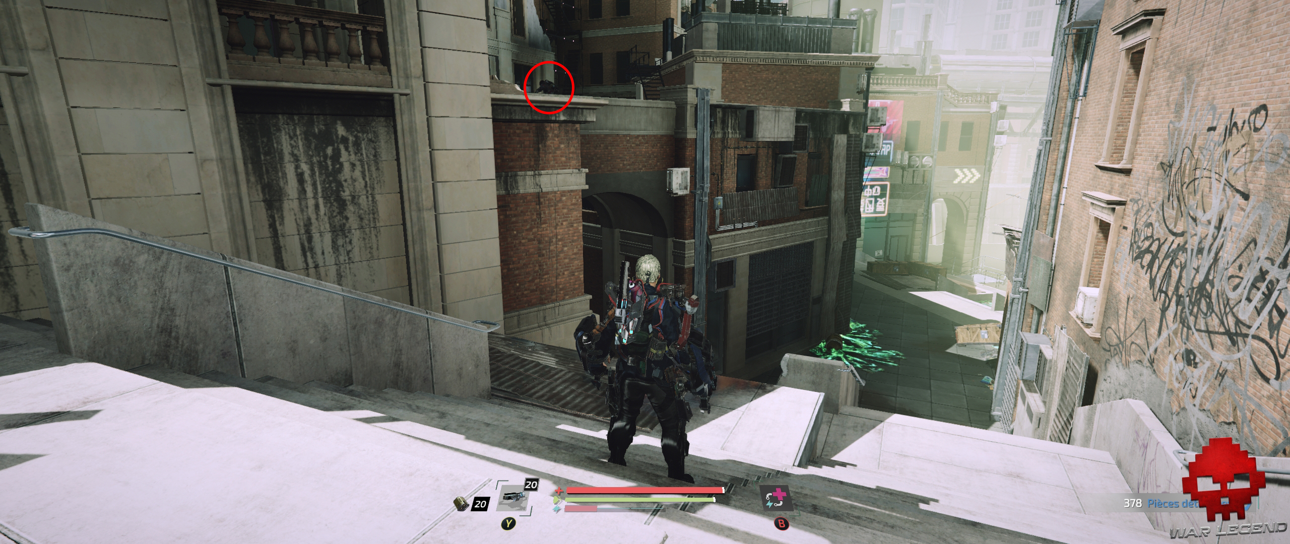 Retour au brasero, avancez un peu mais sautez par le trou dans la rambarde juste avant le carrefour. Tuez l’ennemi qui se trouve en contrebas (il manie un Broyeur récupéré) et récupérez la Bombe de peinture W-101.
