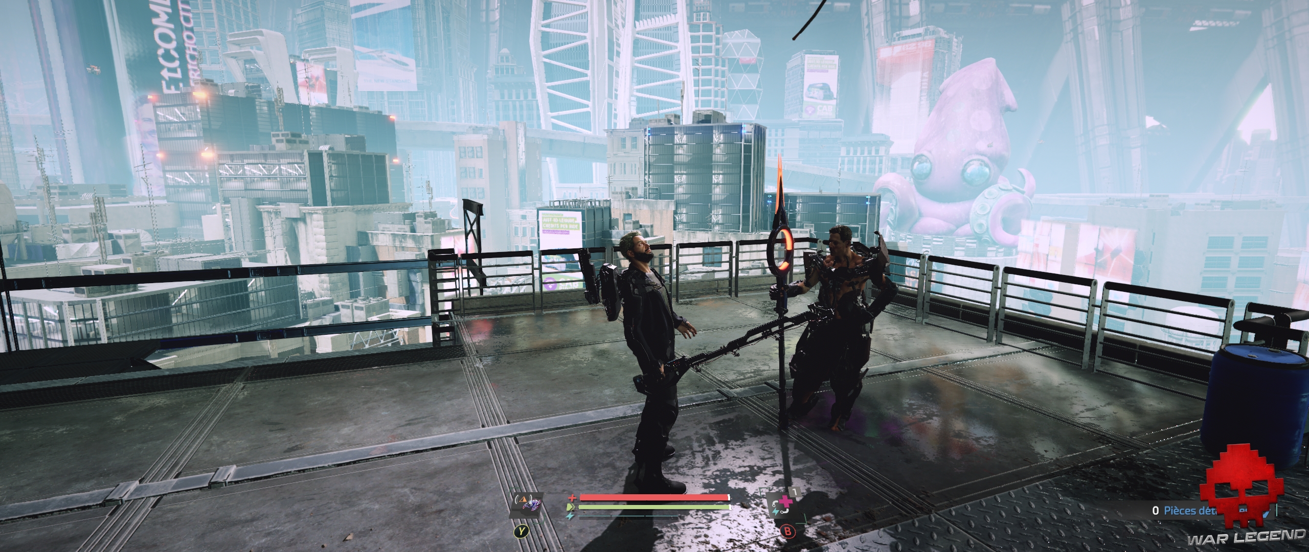 Tuez ensuite le 3e larron dans le passage sur la droite et mais n’allez pas plus loin : prenez l’ascenseur dimensionnel à proximité. Récupérez les Transistors améliorés et reprenez l’ascenseur – ne faites pas attention aux escaliers, et surtout n’essayez pas de les descendre : il n’y a que du vide et un ennemi prêt à vous saigner.