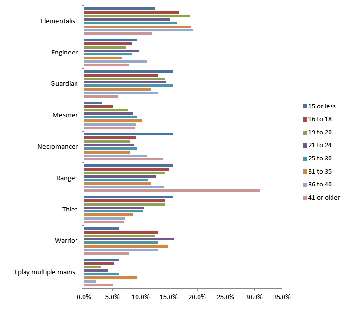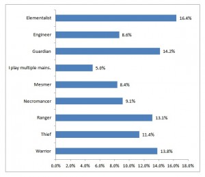 - Sur le choix de la profession, on voit se creuser le fossé déjà constaté un peu partout : une majorité de joueurs désire jouer Elementaliste, Guerrier, Gardien ou Rôdeur. De l’autre côté du fossé, on aperçoit la profession Voleur , puis le trio de queue encore plus loin avec le Nécromant, l’Envoûteur et l’Ingénieur.