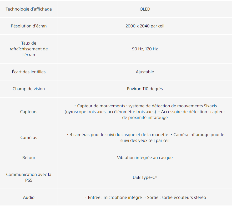 Le PS VR2 embarquera un écran OLED avec une résolution d’affichage prévue de 2000 * 2040 par œil et un taux de rafraîchissement de 90/120 Hz. Des caméras intégrées au casque permettront à PlayStation VR2 de vous suivre ainsi que votre manette. Ainsi vos mouvements seront pris en compte sans avoir besoin d’une caméra externe.